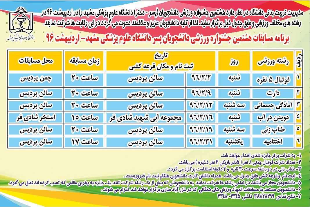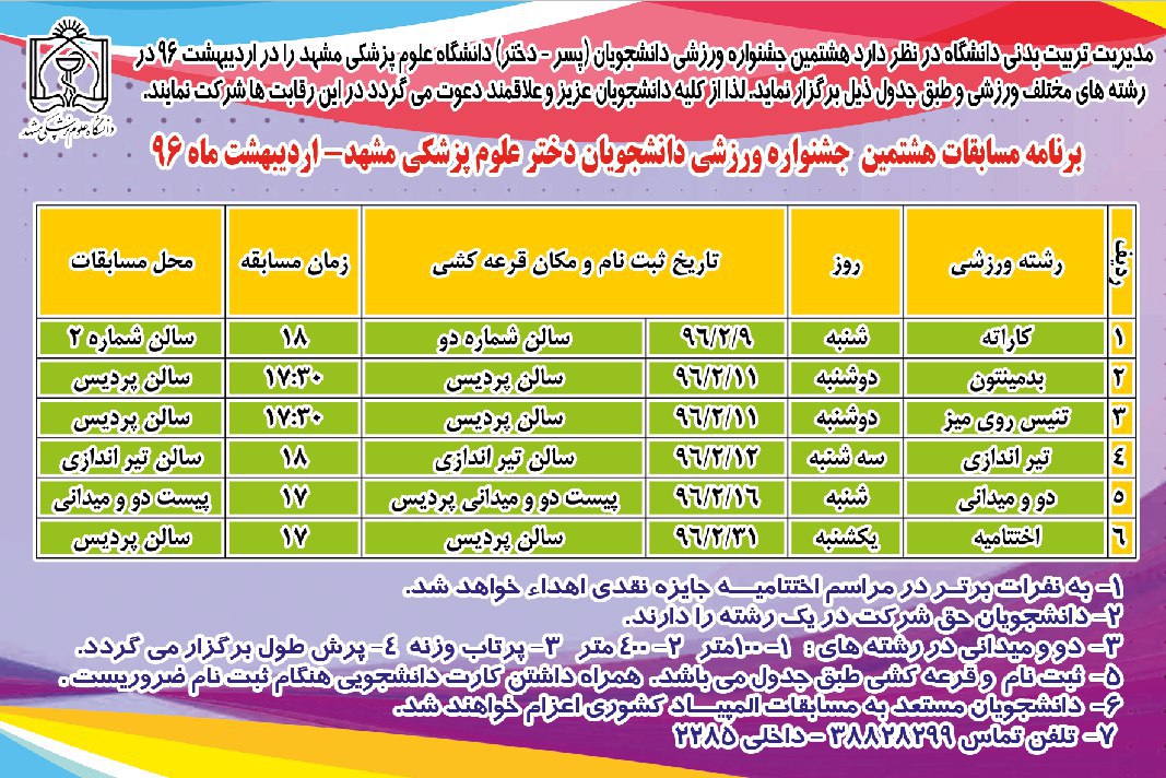 هشتمین جشنواره ورزشی دانشجویان (دختر – پسر ) دانشگاه علوم پزشکی مشهد اردیبهشت 96