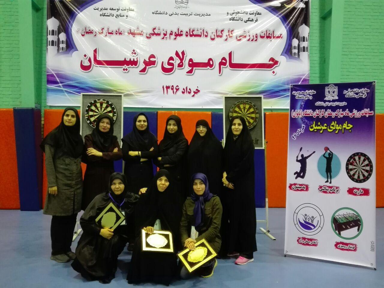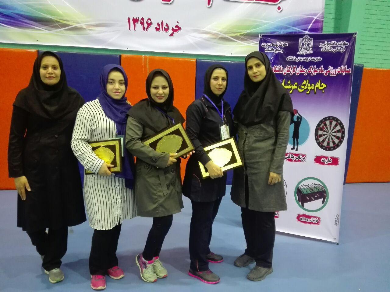 مسابقات دارت بانوان جام مولای عرشیان با شرکت 44 بازیکن از واحدهای مختلف دانشگاه در تاریخ 13/3/96 در محل سالن ورزشی پردیس به انجام رسید که در پایان نفرات برتراین رشته به ترتیب زیر معرفی شدند.
