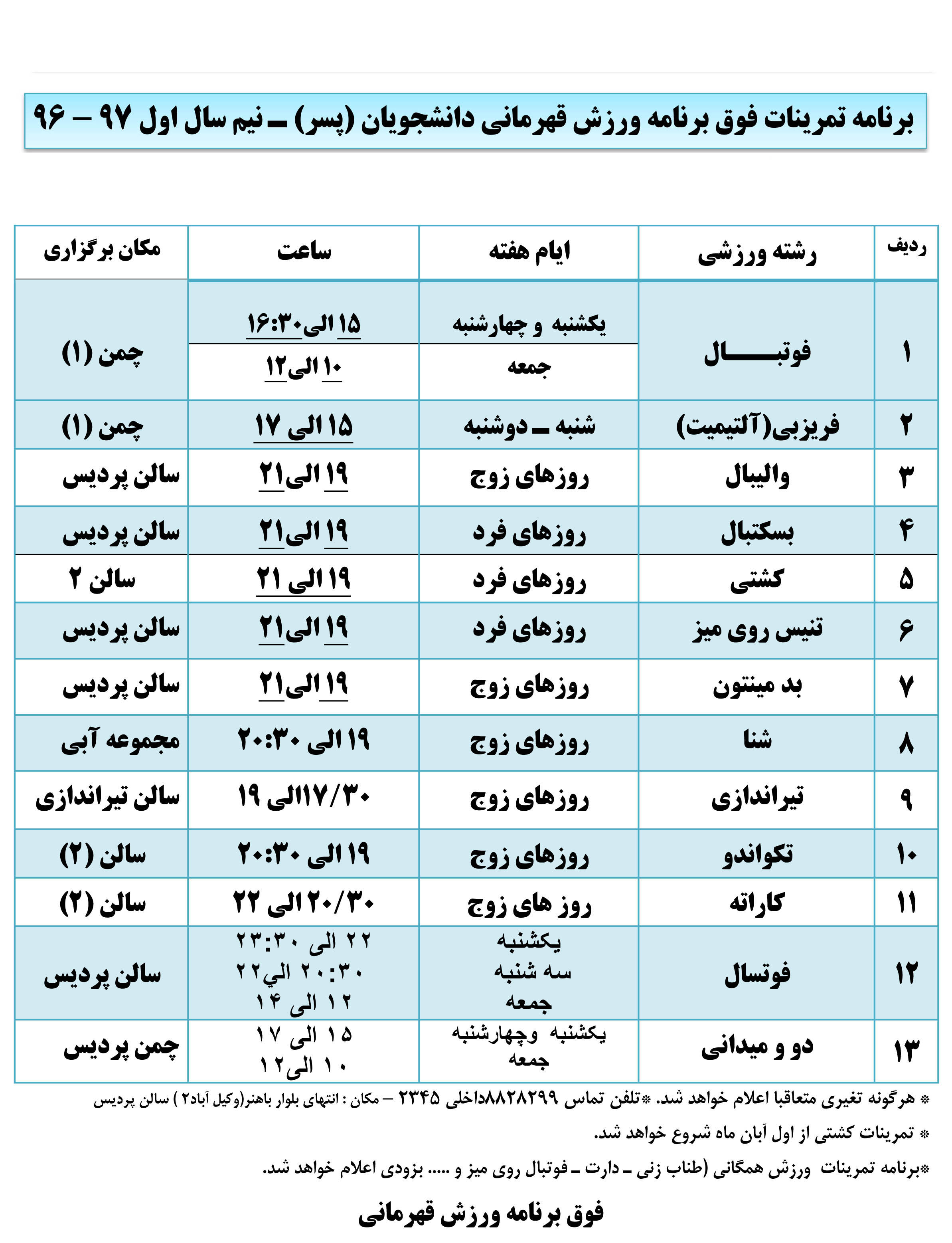 به گزارش روابط عمومی معاونت دانشجویی فرهنگی نظر به برگزاري المپياد ورزشي دانشجويان سراسر کشور در سال آينده ودر راستاي آمادگي و حضور قدرتمندانه در اين رقابت ها مدیریت تربیت بدنی از دانشجويان عزيز دعوت بعمل مي آورد در تمريناتي که برنامه آن در ذيل آمده حضور به هم رسانند و در افتخارآفريني هاي آينده سهيم و مشارکت ، نمايند.