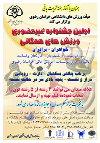 به گزارش مفدا مشهد، اولین جشنواره مسابقات غیر حضوری دانشگاهیان دانشگاه ها و موسسات آموزش عالی خراسان رضوی در رشتههای پرتاب پنالتی، بسکتبال، پرتاب دارت، پنجه بالای سر در حال نشسته، دراز و نشست بین دانشجویان، کارکنان و اعضای هیئت علمی در دو بخش خانم ها و آقایان برگزار میشود.