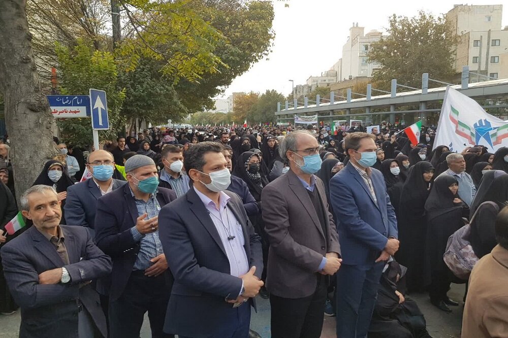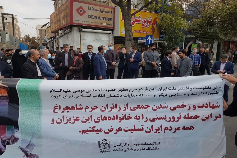 مسئولان، کارکنان و دانشجویان دانشگاه علوم پزشکی مشهد همراه و همگام با مردم انقلابی و آگاه مشهد و همانند ید واحده، بار دیگر ثابت کردند، که با اینگونه اقدامات جنایتکارانه، از پای ننشسته و ذرهای از مواضع دینی و انقلابی خویش عقبنشینی نخواهند کرد و با حضور حداکثری، همبستگی ملی، نفرت و انزجار از جنایات سخیف استکبار جهانی و ایادی آنان را به نمایش گذاشتند.
