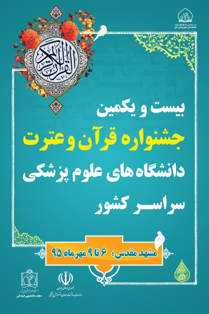 بیست و یکمین جشنواره قرآن و عترت دانشگاه های علوم پزشکی کشور،مهر ماه امسال به میزبانی دانشگاه علوم پزشکی مشهد برگزار می شود.