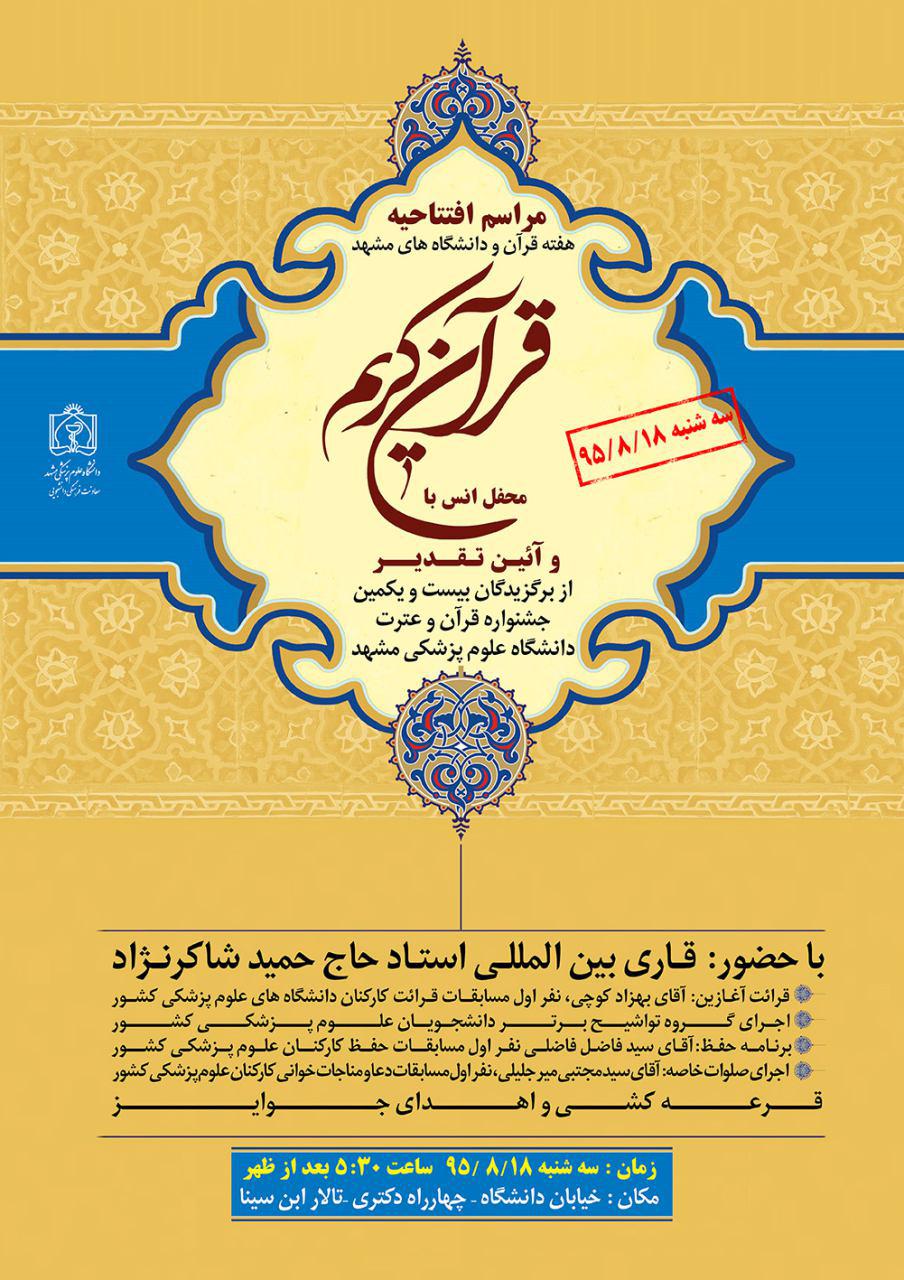 به گزارش کارشناس خبری حوزه معاونت دانشجویی فرهنگی دانشگاه علوم پزشکی مشهد ، محفل انس با قرآن کریم همراه با تقدیر از برگزیدگان بیست و یکمین جشنواره قرآن و عترت و رابطین قرآن مراکز، در روز سه شنیه 18/8/95 ساعت 17:30 در محل تالار ابن سینا برگزار خواهد شد.