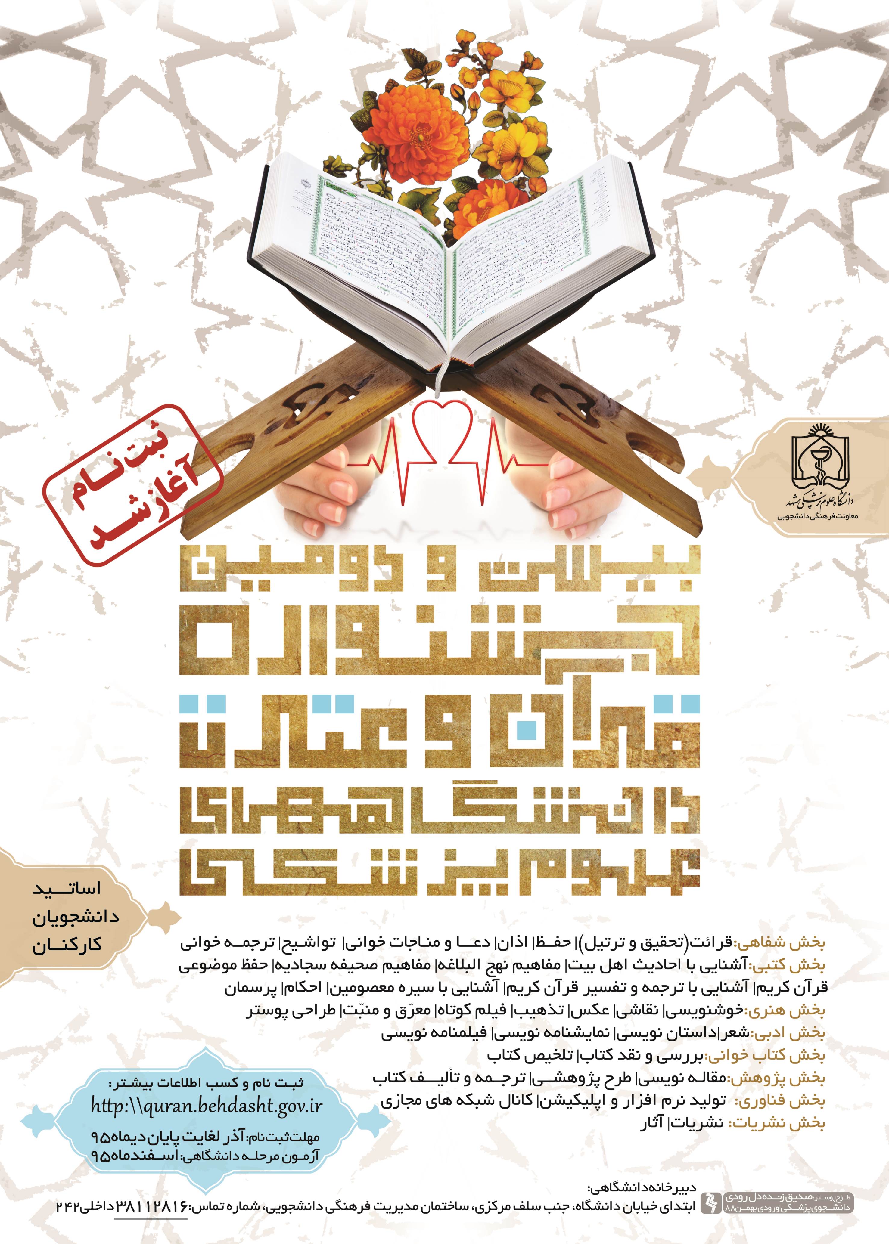 به گزارش کارشناس خبری حوزه معاونت دانشجویی فرهنگی دانشگاه علوم پزشکی مشهد ، ثبت نام بیست و دومین جشنواره قرآن و عترت دانشگاهای علوم پزشکی کشور، از ابتدای آذر ماه آغاز شد.
