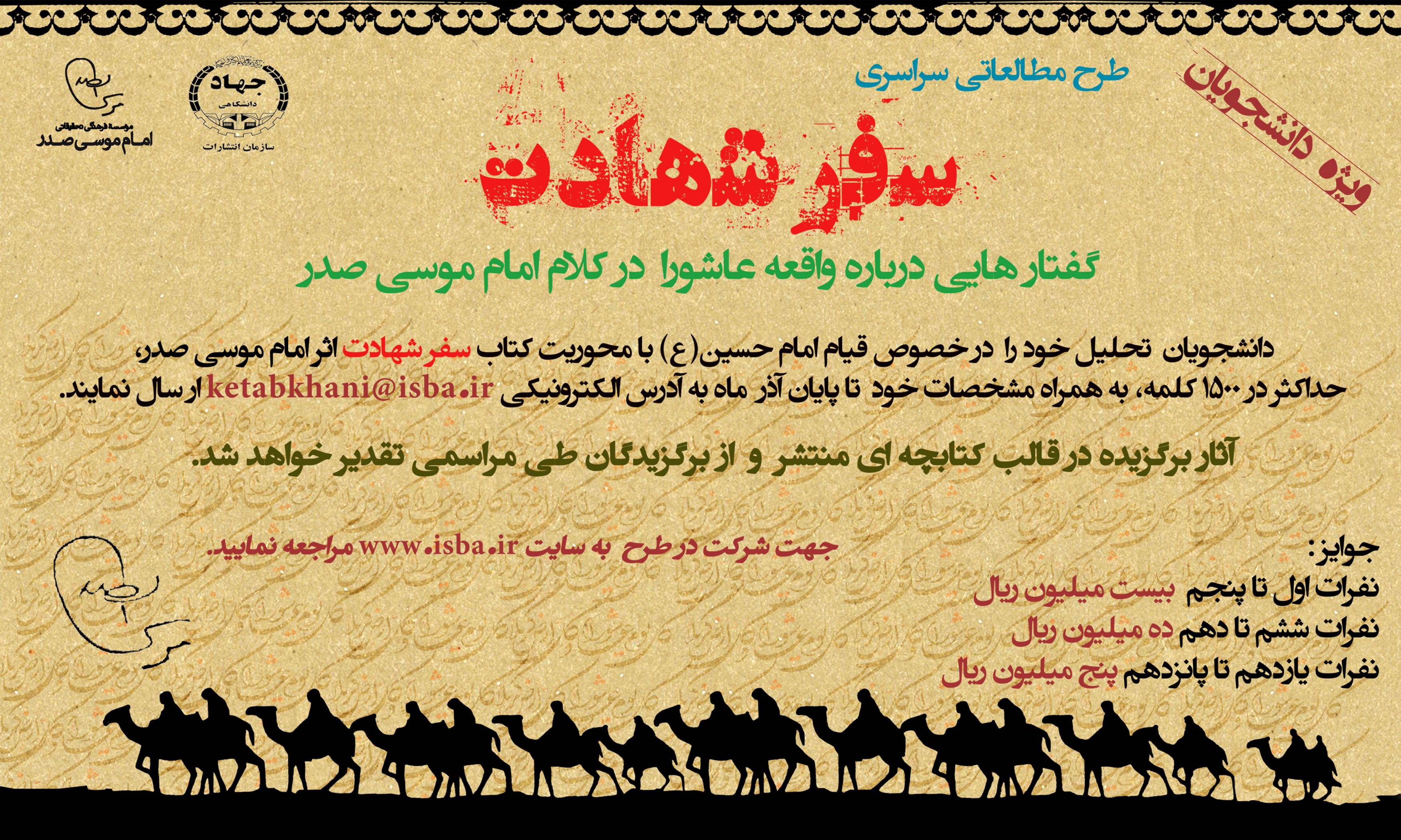 به گزارش کارشناس خبری حوزه معاونت دانشجویی فرهنگی دانشگاه علوم پزشکی مشهد، سازمان انتشارات جهاد دانشگاهی همزمان با هفته کتاب و ایام اربعین حسینی و با هدف ترویج فرهنگ کتاب و کتابخوانی و آشنایی هرچه بیشتر دانشجویان با اهداف قیام امام حسین (ع) اجرای طرح مطالعاتی و کتابخوانی سفر شهادت را با محوریت کتاب ((سفر شهادت ))، اثر امام موسی صدر در سطح دانشگاههای کشور و بصورت ملی آغاز نموده است.