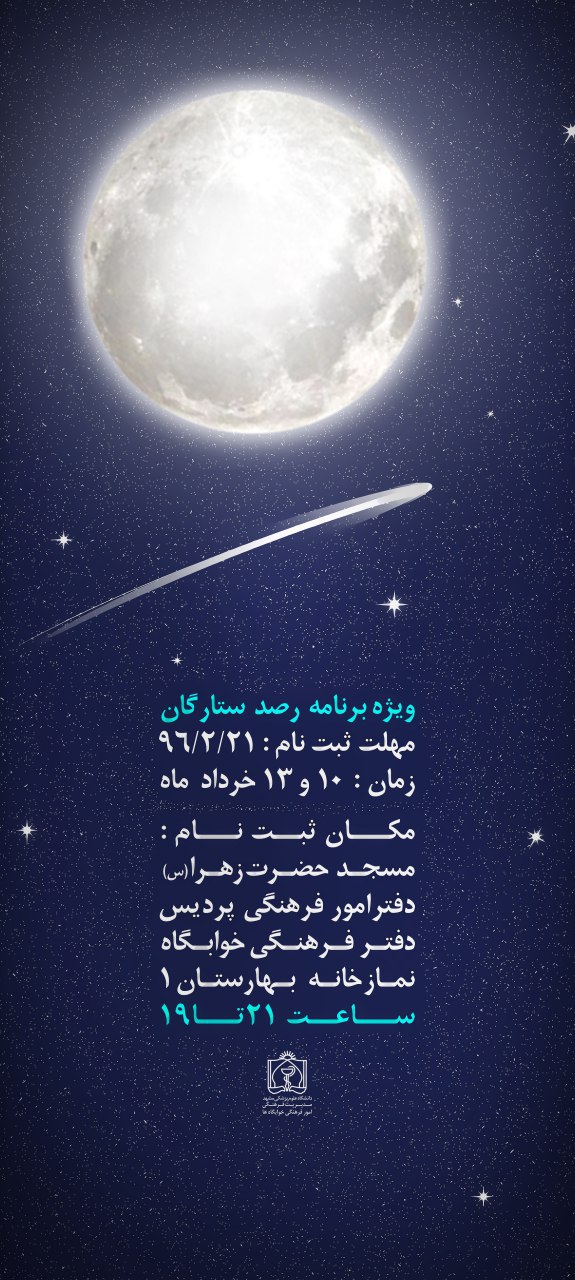 در جهت ارتقاي روحيه نشاط و شادابي و پر کردن اوقات فراغت دانشجويان ساکن در خوابگاه و لزوم اجراي برنامه متنوع و شاد و سالم از نظر فرهنگي، معاونت فرهنگي و دانشجويي دانشگاه به همت امور فرهنگی خوابگاه برنامه رصد ستارگان در تاريخ 10 و 13 خرداد برگزار می نماید.