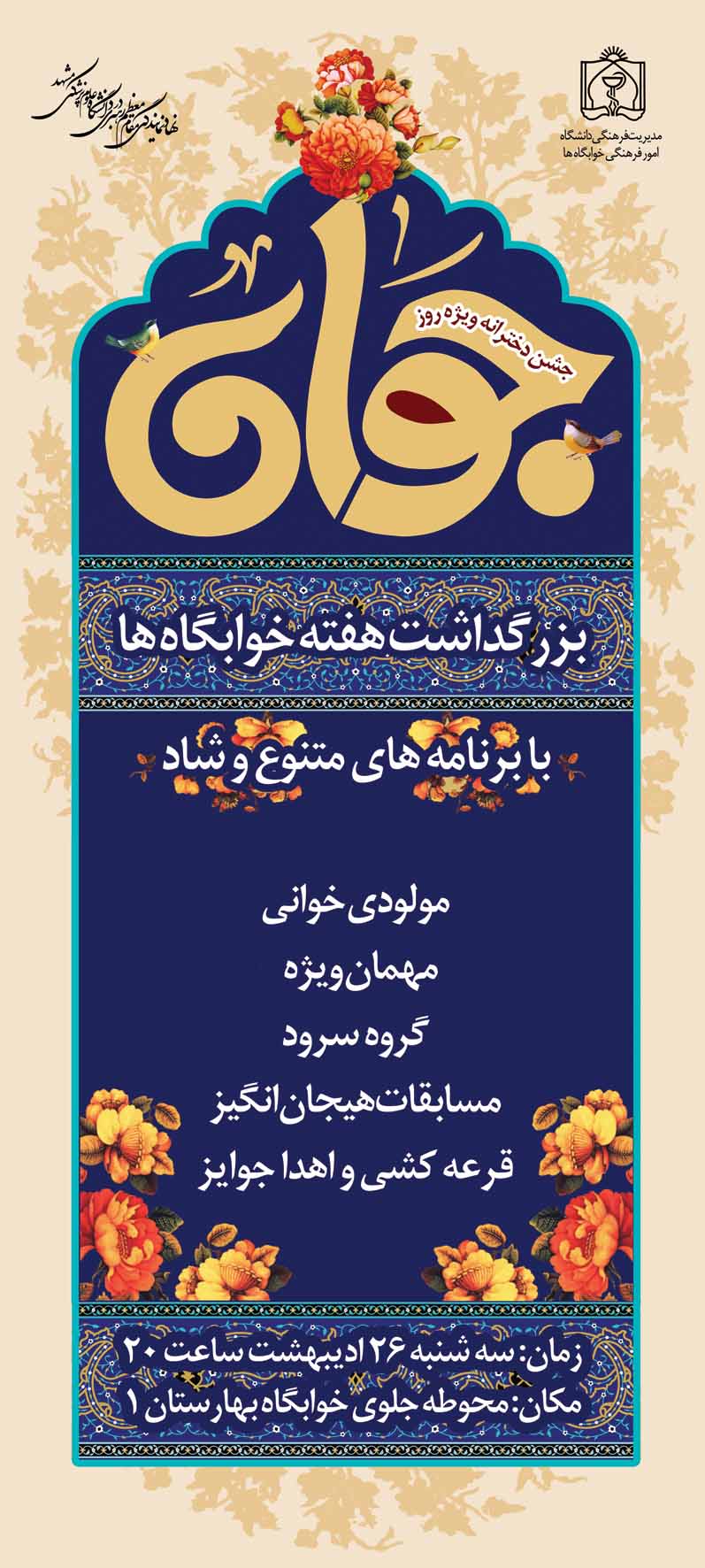 به مناسبت اعياد شعبانيه و نيز همراه شدن "هفته ي خوابگاه ها" ، شوري وصف ناپذير ميان دانشجويان خوابگاهي برپا شده است، امور فرهنگي خوابگاه با همراه شدن به اين شور و نشاط و جهت شور و نشاط بيشتر همراه با شئونات دانشجويي، جشن "دخترانه" برگزار مي کند.