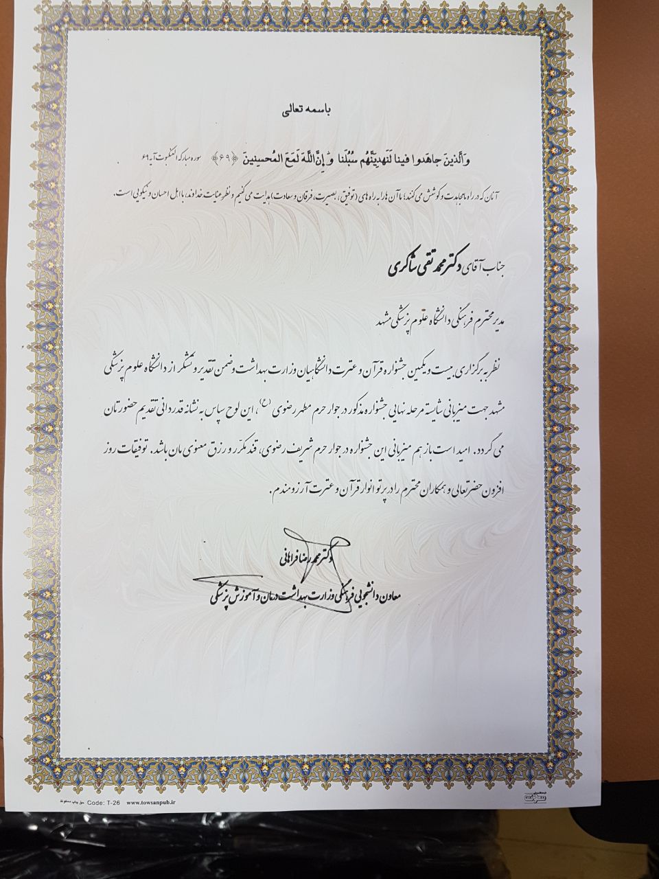 به گزارش کارشناس خبري حوزه معاونت دانشجويي و فرهنگي دانشگاه علوم پزشکي مشهد، دکتر فراهاني معاون دانشجويي فرهنگي وزارت بهداشت، درمان و آموزش پزشکي ، در مراسم بيست و دومين جشنواره سراسري قرآن و عترت دانشگاههاي علوم پزشکي کشور که در شيراز برگزار شد، به پاس برگزاري شايسته دانشگاه علوم پزشکي مشهد براي ميزباني بيست و يکمين جشنواره که در سال گذشته در مشهد مقدس برگزار شد ، از آقايان دکتر محمد تقي شاکري مدير فرهنگي و اميررضا صالح مقدم مدير دانشجويي دانشگاه علوم پزشکي مشهد، با اهداء لوح تقدير تشکر و قدراني نمود.