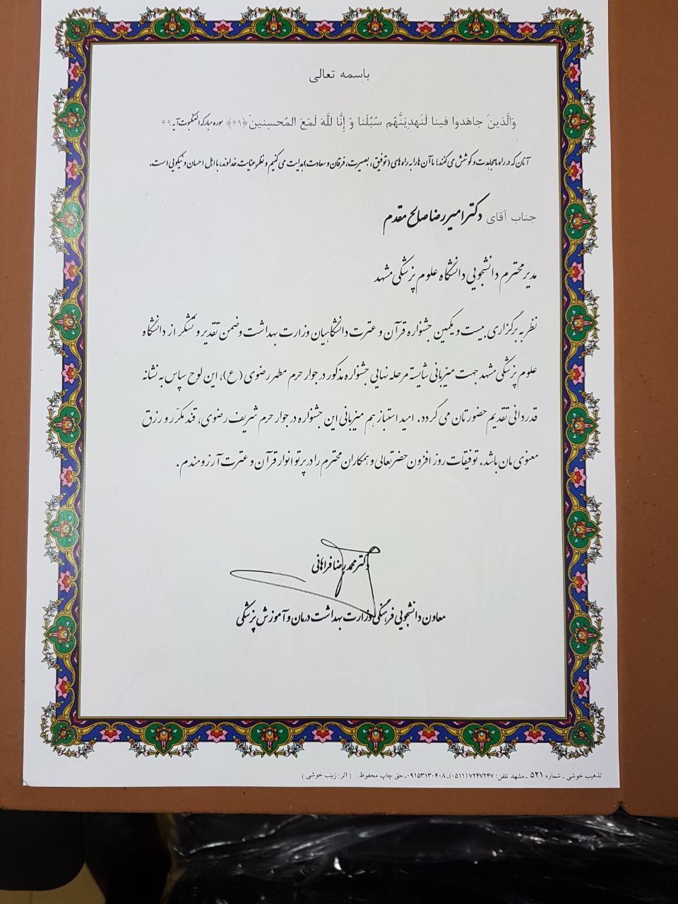 صالح مقدم مدير دانشجويي در اين رابطه افزود: برگزاري شايسته بيست و يکمين جشنواره سراسري قرآن و عترت دانشگاههاي علوم پزشکي کشور به ميزباني دانشگاه علوم پزشکي مشهد در سايه حمايت همه جانبه جناب آقاي دکتر مهرابي ، رياست محترم دانشگاه ، جناب آقاي دکتر ابراهيمي معاونت محترم دانشجويي فرهنگي و جناب آقاي دکتر بحريني معاون محترم توسعه و همچنين با تلاش کارشناسان و همکاران ارزشمند معاونت دانشجويي فرهنگي دانشگاه انجام شده است . و تقدير از مديران فوق به نمايندگي از مجموعه دانشگاه صورت گرفته است.