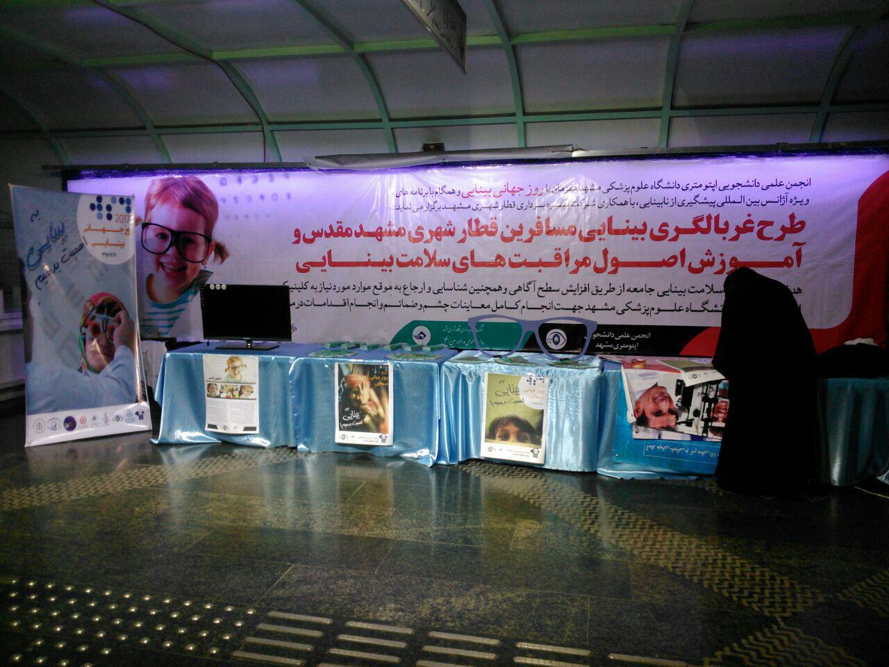 این برنامه که از ساعت ۹ صبح لغایت ۲۱ در ایستگاه مترو بسیج مشهد با حضور ۱۴ نفر از دانشجویان اپتومتری در دو شیفت برگزار گردید شامل غربالگری بینایی و آموزش اصول مراقبت های اولیه بینایی به مسافرین قطار شهری بود