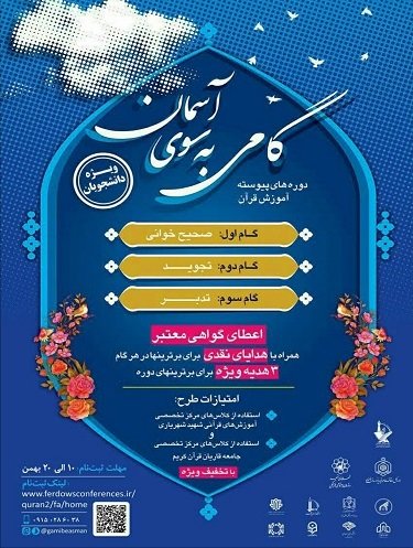 «گامی به سوی آسمان» عنوان طرح آموزش صحیح خوانی، تجوید و تدبر در قرآن است که طی ۳ مرحله با نظارت و برنامهریزی ستاد احیا و هماهنگی فعالیتهای قرآن و عترت دانشگاههای استان خراسان رضوی و توسط اداره توسعه فعالیتهای قرآن و عترت(ع) در دانشگاه علوم پزشکی مشهد در حال اجرا می باشد.
