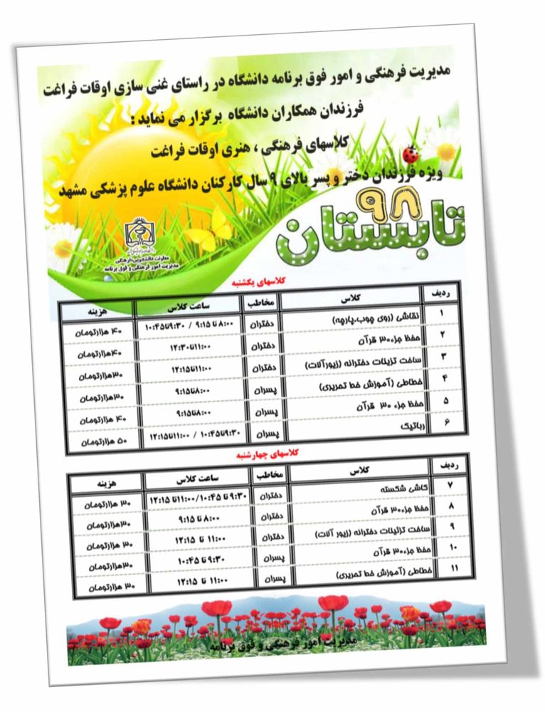 امسال برای نخستین بار مدیریت امور فرهنگی دانشگاه تصمیم گرفت در کنار طرح اوقات فراغت ورزشی که توسط مدیریت محترم تربیت بدنی دانشگاه برگزار میشود، کلاسهای فرهنگی و هنری ویژه اوقات فراغت را نیز در محل مجتمع فرهنگی مسجد حضرت زهرا(س) برنامه ریزی و اجرا نماید. این کلاسها که برای رده سنی 9 سال به بالا در نظر گرفته شده شامل حفظ جزء30 قرآن، رباتیک، نقاشی، آموزش خوشنویسی خط تحریری، کاشی شکسته و آموزش ساخت تزئینات دخترانه میباشد. جدول کلاسها و زمانبندی به شرح ذیل می باشد: