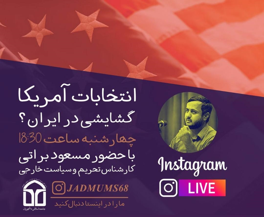 به گزارش مفدا مشهد، به همت تشکل جامعه اسلامی دانشگاه علوم پزشکی مشهد لایو اینستاگرامی با موضوع "انتخابات آمریکا، گشایشی در ایران؟" با حضور مسعود براتی کارشناس مسئله ی تحریم و سیاست خارجه روز چهارشنبه مورخ ۹۹/۸/۷ ساعت ۱۸:۳۰ برگزار خواهد شد.