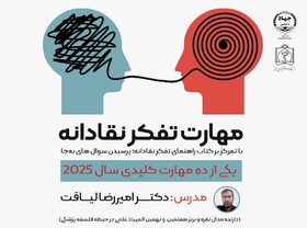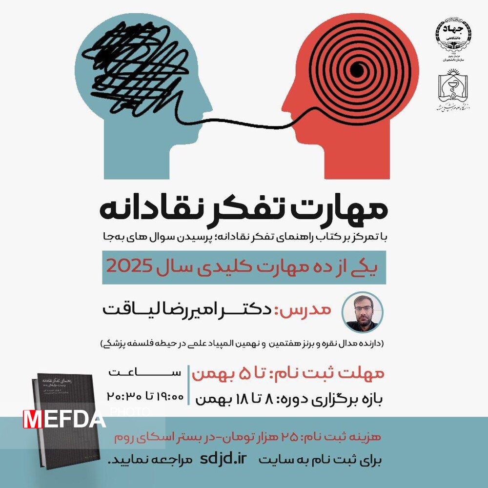 ه گزارش مفدا مشهد، به همت سازمان دانشجویان جهاد دانشگاهی کارگاه مهارت تفکر نقادانه برگزار می شود. حسن پور نماینده سازمان دانشجویان دانشجویان جهاد دانشگاهی در دانشگاه علوم پزشکی مشهد در اعلام این خبر افزود: کارگاه مهارت تفکر نقادانه یکی از ده مهارت کلیدی سال ۲۰۲۵ می باشد و همه ما روزانه با حجم عظیمی از اطلاعات مواجه می شویم که برای رد یا پذیرش این عقاید و ادعاها به ابزاری برای ارزیابی عقلانی بودنشون نیاز داریم؛ تفکر نقادانه در واقع همین ابزارِ حیاتیه!
