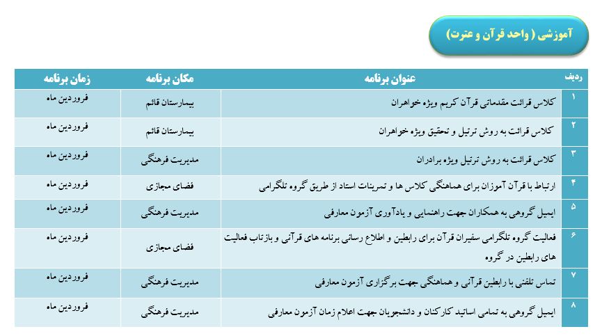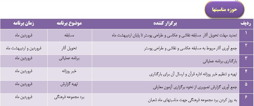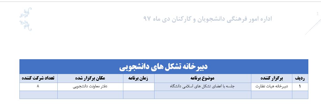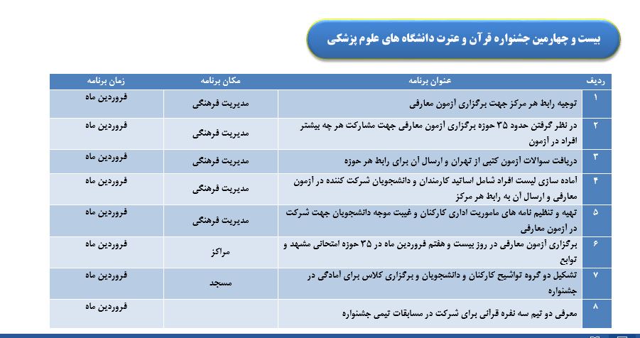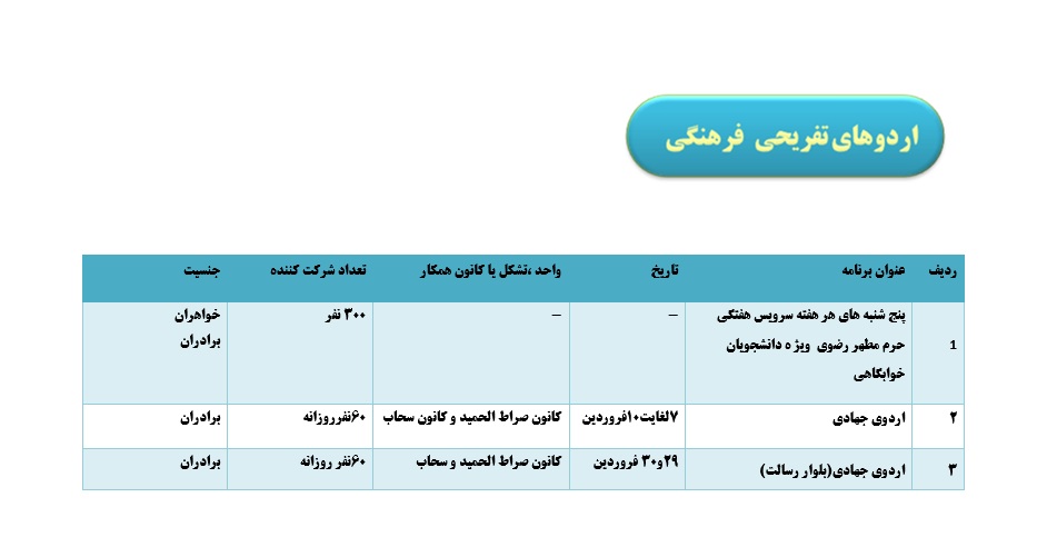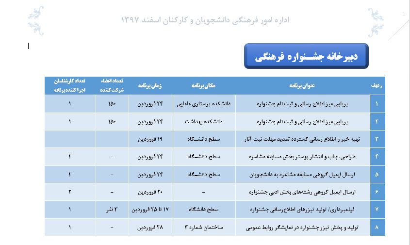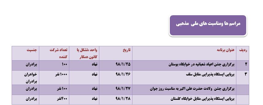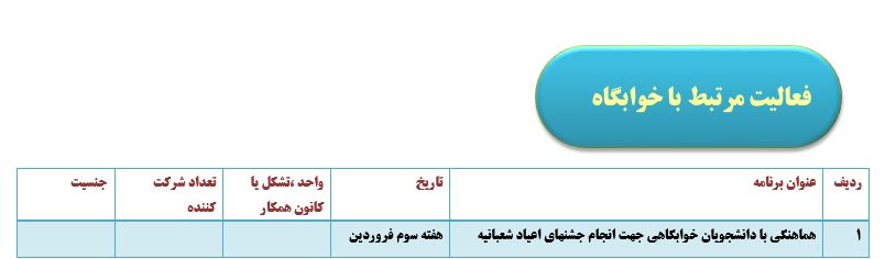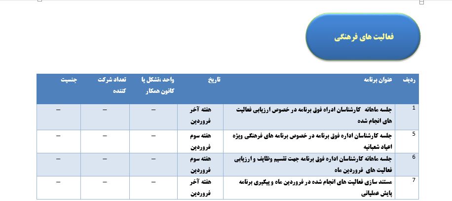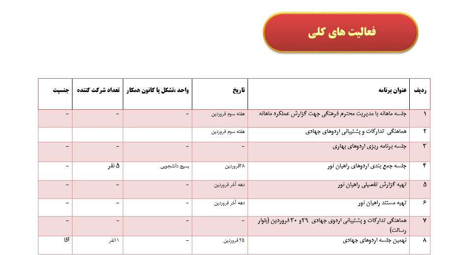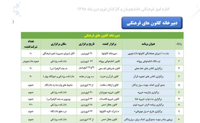 جعفریان مریم گزارش 98 29 فروردين 1398 29 فروردين 1398 بازدید: 556 امتیاز: ( 0 Rating ) فروردین 98 امتیاز کاربران لطفا رای دهید رای 1 رای 2 رای 3 رای 4 رای 5 مدیریت دانشجویی عملکرد اداره رفــاه عملکرد اداره تغذیه اداره خوابگاه مدیریت فرهنگی اداره امور فرهنگی دانشجویان و کارکنان دبیرخانه نشریات دبیرخانه تشکل های دانشجویی دبیرخانه جشنواره فرهنگی دبیرخانه کانونهای فرهنگی اداره فوق برنامه فعالیت هـای فـرهنگـی فعالیت های کلی مراسمات و مناسبت های ملی مذهبی فعالیت های مرتبط با خوابگاه اردوهای فرهنگی تفریحی اداره توسعه فعالیت های قرآن و عترت(ع) دانشجویان و کارکنان پژوهشــی آمـوزشــی حـوزه مناسبت هــا کانون قرآن و عتـرت بیست و چهارمین جشنواره قرآن و عترت دانشگاه های علوم پزشکی مدیریت تربیت بدنی تعداد استفاده کنندگان از مجموعه آبی - دفتر مدیریت تربیت بدنی مجموعه آبی شهید شادیفر - فوق برنامه قهرمانی دانشجویان پسر - ورزش کارکنان - ورزش همگانی واحد صدور کارت ورزش دانشکده ها واحد آمار و ارزشیابی - واحد آموزش مشاوره و سلامت روان گزارش مشکلات دانشجویان به تشخیص روانشناسان اداره مشاوره فعالیتهای قابل ذکر همکاران کارگاهها ونشست های آموزشی همکاران فرم خلاصه گزارش اقدامات و فعالیت های روانشناس اداره مشاوره فرم خلاصه گزارش اقدامات و فعالیت های مددکاران اداره مشاوره شورای انضباطی فعالیت های شورای انضباطی دانشجویان روابط عمومی √تدوین اهداف اجرایی √ توانمندسازی √سنجش افکار عمومی √ مصاحبه های حضوری در طی مراسمات مختلف √ اطلاع رسانی √ تبلیغات محیطی √ همایش ها √ سمعی و بصری √ جلسات برگزار شده √ بروز رسانی سایت مفدا و معاونت فرهنگی دانشجویی امور پشتیبانی پشتیبانی و خدمات عمومــی، انبــار ، فضای سبــز، تــدارکات، نقلیــه سایــر واحــدهـا دبیـرخانـه فناوری اطلاعات عملکرد شبکه و سخت افزار قبلی