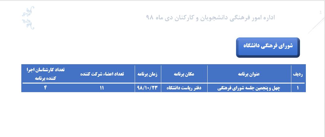 جعفریان مریم گزارش 98 05 بهمن 1398 05 بهمن 1398 بازدید: 662 امتیاز: ( 0 Rating ) دی 98 امتیاز کاربران لطفا رای دهید رای 1 رای 2 رای 3 رای 4 رای 5 مدیریت دانشجویی عملکرد اداره رفــاه عملکرد اداره تغذیه اداره خوابگاه مدیریت فرهنگی اداره امور فرهنگی دانشجویان و کارکنان دبیرخانه نشریات دبیرخانه تشکل های دانشجویی دبیرخانه شورای فرهنگی دانشگاه دبیرخانه کانونهای فرهنگی دبیرخانه انجمن های علمی اداره فوق برنامه فعالیت هـای فـرهنگـی فعالیت های کلی مراسمات و مناسبت های ملی مذهبی فعالیت های مرتبط با خوابگاه اردوهای جهادی اداره توسعه فعالیت های قرآن و عترت(ع) دانشجویان و کارکنان پژوهشــی آمـوزشــی حـوزه مناسبت هــا کانون قرآن و عتـرت بیست و چهارمین جشنواره قرآن و عترت دانشگاه های علوم پزشکی مدیریت تربیت بدنی عملکرد ورزش قهرمانی ورزش کارکنان ورزش همگانی واحد آموزش مشاوره و سلامت روان گزارش مشکلات دانشجویان به تشخیص روانشناسان اداره مشاوره فعالیتهای قابل ذکر همکاران نشست های آموزشی همکاران فرم خلاصه گزارش اقدامات و فعالیت های روانشناس اداره مشاوره فرم خلاصه گزارش اقدامات و فعالیت های مددکاران اداره مشاوره شورای انضباطی فعالیت های شورای انضباطی دانشجویان روابط عمومی اخبار تولیدی اخبار اقتباسی اخبار کانون ها و تشکل ها نشریات دانشجویی گفتگوهای اختصاصی فیلم و کلیپ گزارش تصویری جلسات برگزار شده امور پشتیبانی پشتیبانی و خدمات عمومــی انبــار فضای سبــز تــدارکات نقلیــه سایــر واحــدهـا دبیـرخانـه فناوری اطلاعات عملکرد شبکه و سخت افزار قبلی بعدی