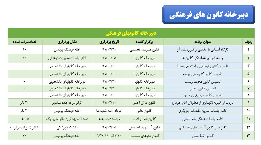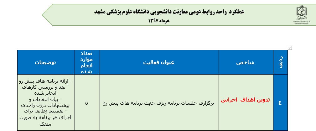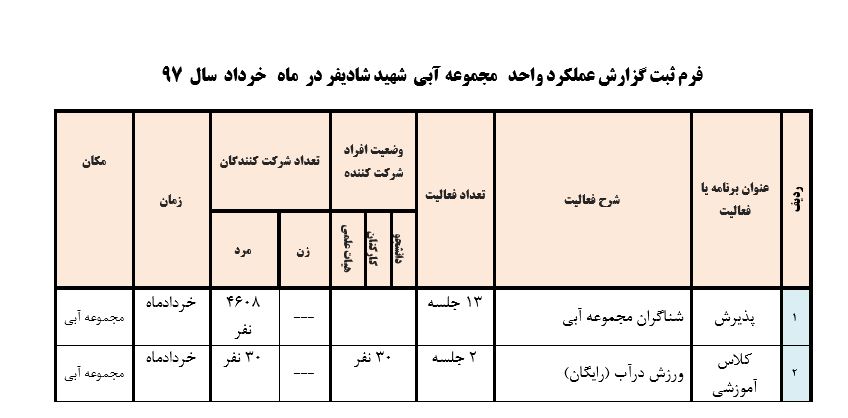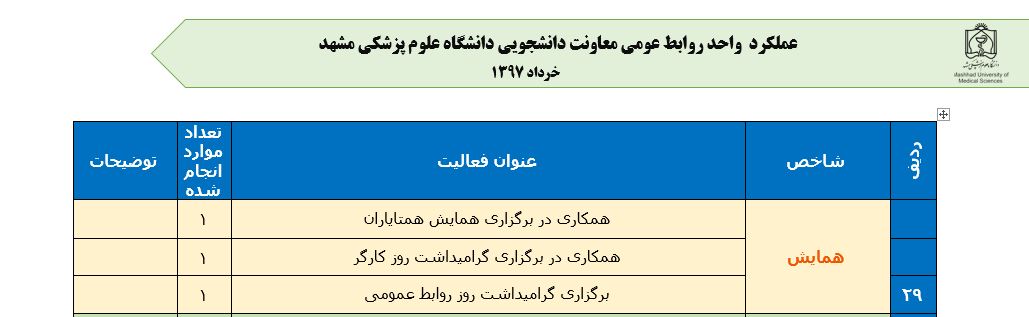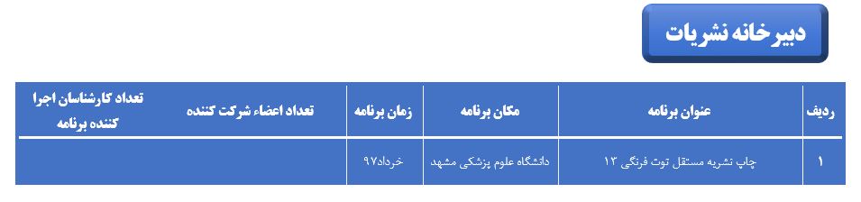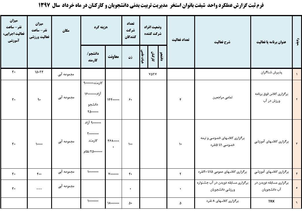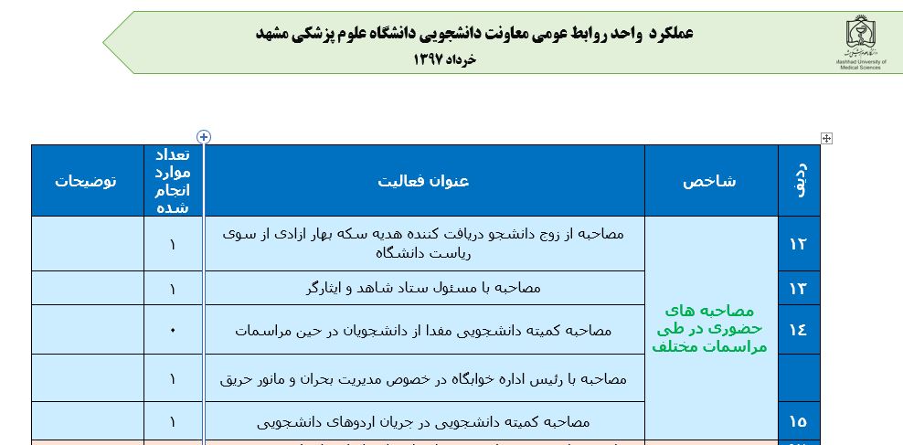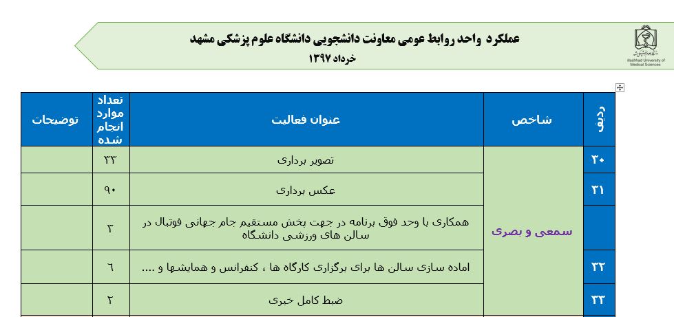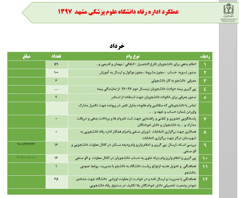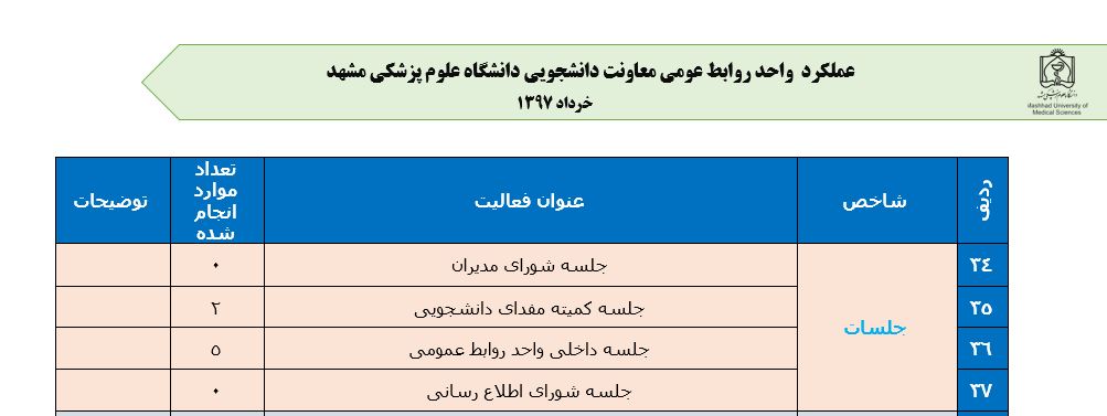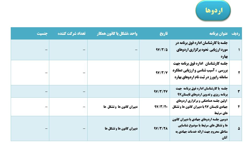 جعفریان مریم گزارش 97 30 خرداد 1397 30 خرداد 1397 بازدید: 558 امتیاز: ( 0 Rating ) خرداد 97 امتیاز کاربران لطفا رای دهید رای 1 رای 2 رای 3 رای 4 رای 5 مدیریت دانشجویی عملکرد اداره رفــاه عملکرد اداره تغذیه : تعداد کل پرس غذای توزیع شده اداره خوابگاه: گزارش عملکرد مدیریت فرهنگی اداره امور فرهنگی دانشجویان و کارکنان دبیرخانه نشریات دبیرخانه شورای فرهنگی دبیرخانه جشنواره فرهنگی دبیرخانه کانون های فرهنگی دبیرخانه تشکل های دانشجویی اداره فوق برنامه اردوهــا برنامه های ماه مبارک رمضان برپایی و بزرگداشت مراسم ملـی و مذهبـی فعالیت هـای فـرهنگـی خوابگاه اداره توسعه فعالیت های قرآن و عترت(ع) دانشجویان و کارکنان پژوهشــی آمـوزشــی حـوزه مناسبت هــا کانون قرآن و عتـرت بیست و سومین جشنواره قرآن و عترت دانشگاه های علوم پزشکی مدیریت تربیت بدنی تعداد استفاده کنندگان از مجموعه آبی دفتر مدیریت تربیت بدنی صدور کارت استخر مجموعه آبی شهید شادیفر - شیفت آقایان مجموعه آبی شهید شادیفر - شیفت بانوان فوق برنامه قهرمانی دانشجویان دختر فوق برنامه قهرمانی دانشجویان پسر ورزش کارکنان واحد آموزش ورزش همگانی واحد آمار و ارزشیابی مشاوره و سلامت روان عملکرد اداره مشاوره و سلامت روان شورای انضباطی فعالیت های شورای انضباطی دانشجویان جلسات شورای بدوی و تجدید نظر انضباطی روابط عمومی تدوین اهداف اجرایی توانمندسازی مصاحبه های حضوری در طی مراسمات مختلف اطلاع رسانی تبلیغات محیطی همایش ها سمعی و بصری جلسات برگزار شده بروز رسانی سایت مفدا و معاونت فرهنگی دانشجویی امور پشتیبانی پشتیبانی و خدمات عمومــی انبــار فضای سبــز تــدارکات تـاسیســات نقلیــه سایــر واحــدهـا فناوری اطلاعات پشتیبانی های عمـومی شبکــه نرم افـزار قبلی بعدی
