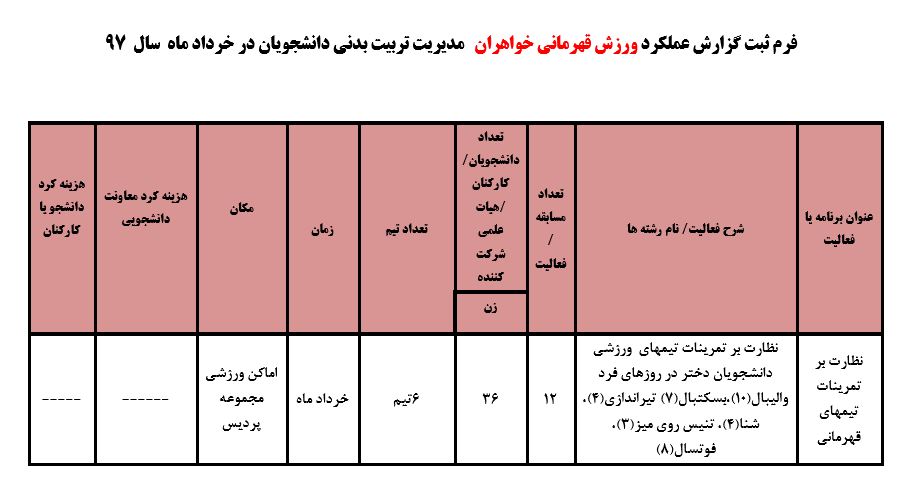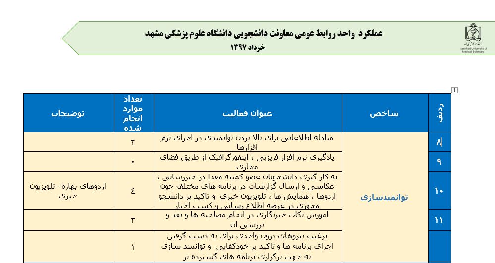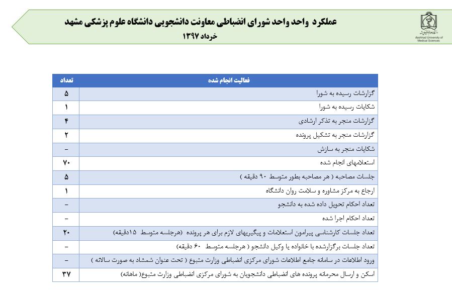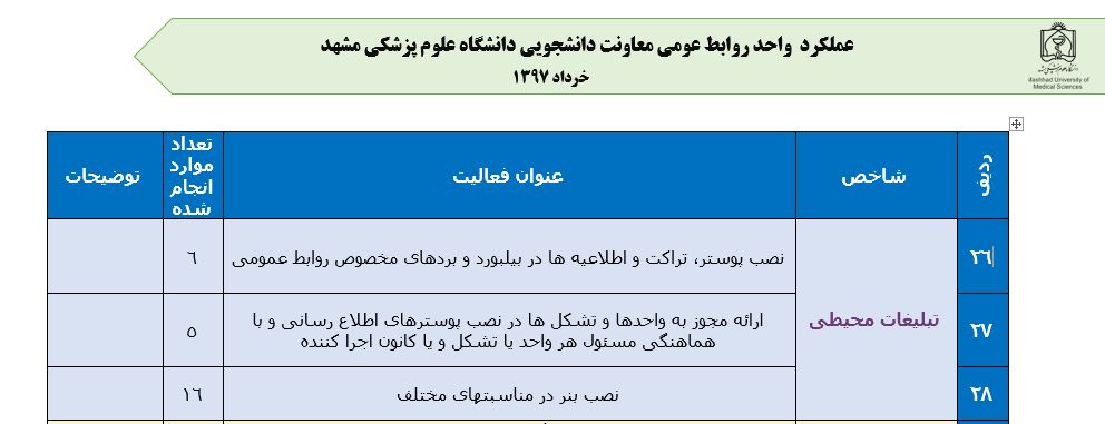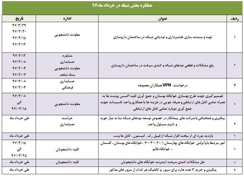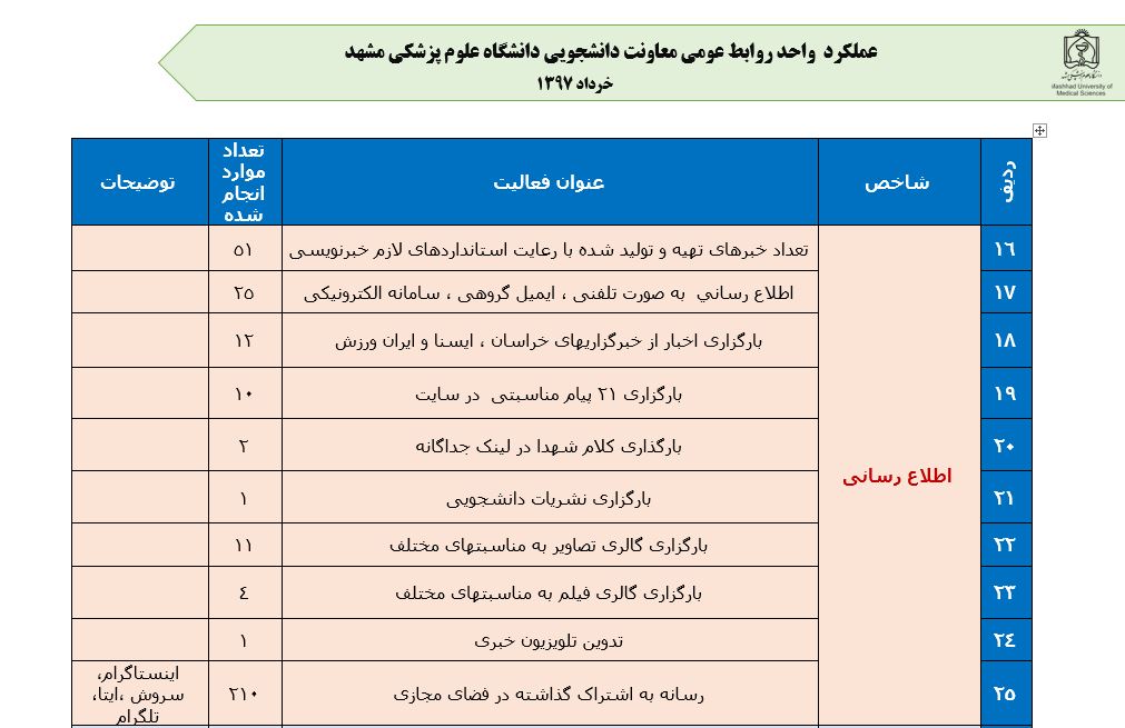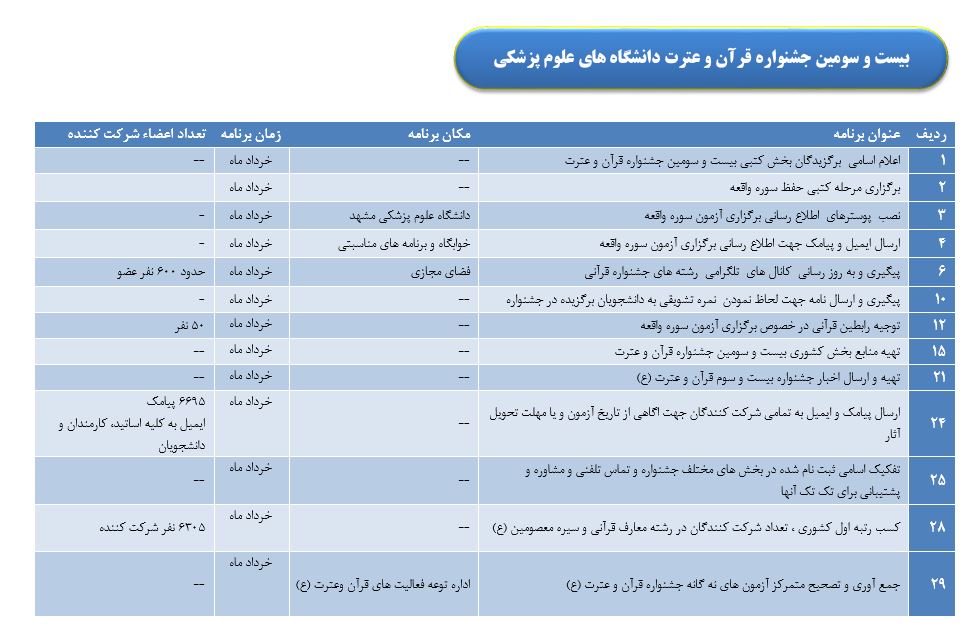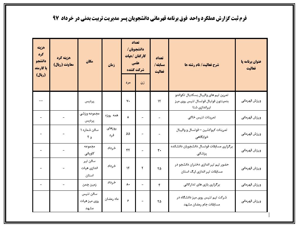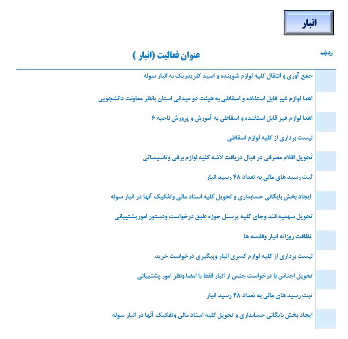 جعفریان مریم گزارش 97 30 خرداد 1397 30 خرداد 1397 بازدید: 558 امتیاز: ( 0 Rating ) خرداد 97 امتیاز کاربران لطفا رای دهید رای 1 رای 2 رای 3 رای 4 رای 5 مدیریت دانشجویی عملکرد اداره رفــاه عملکرد اداره تغذیه : تعداد کل پرس غذای توزیع شده اداره خوابگاه: گزارش عملکرد مدیریت فرهنگی اداره امور فرهنگی دانشجویان و کارکنان دبیرخانه نشریات دبیرخانه شورای فرهنگی دبیرخانه جشنواره فرهنگی دبیرخانه کانون های فرهنگی دبیرخانه تشکل های دانشجویی اداره فوق برنامه اردوهــا برنامه های ماه مبارک رمضان برپایی و بزرگداشت مراسم ملـی و مذهبـی فعالیت هـای فـرهنگـی خوابگاه اداره توسعه فعالیت های قرآن و عترت(ع) دانشجویان و کارکنان پژوهشــی آمـوزشــی حـوزه مناسبت هــا کانون قرآن و عتـرت بیست و سومین جشنواره قرآن و عترت دانشگاه های علوم پزشکی مدیریت تربیت بدنی تعداد استفاده کنندگان از مجموعه آبی دفتر مدیریت تربیت بدنی صدور کارت استخر مجموعه آبی شهید شادیفر - شیفت آقایان مجموعه آبی شهید شادیفر - شیفت بانوان فوق برنامه قهرمانی دانشجویان دختر فوق برنامه قهرمانی دانشجویان پسر ورزش کارکنان واحد آموزش ورزش همگانی واحد آمار و ارزشیابی مشاوره و سلامت روان عملکرد اداره مشاوره و سلامت روان شورای انضباطی فعالیت های شورای انضباطی دانشجویان جلسات شورای بدوی و تجدید نظر انضباطی روابط عمومی تدوین اهداف اجرایی توانمندسازی مصاحبه های حضوری در طی مراسمات مختلف اطلاع رسانی تبلیغات محیطی همایش ها سمعی و بصری جلسات برگزار شده بروز رسانی سایت مفدا و معاونت فرهنگی دانشجویی امور پشتیبانی پشتیبانی و خدمات عمومــی انبــار فضای سبــز تــدارکات تـاسیســات نقلیــه سایــر واحــدهـا فناوری اطلاعات پشتیبانی های عمـومی شبکــه نرم افـزار قبلی بعدی
