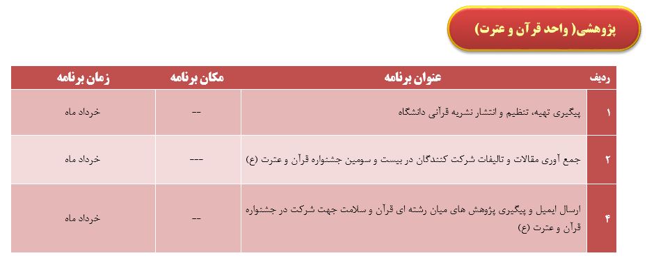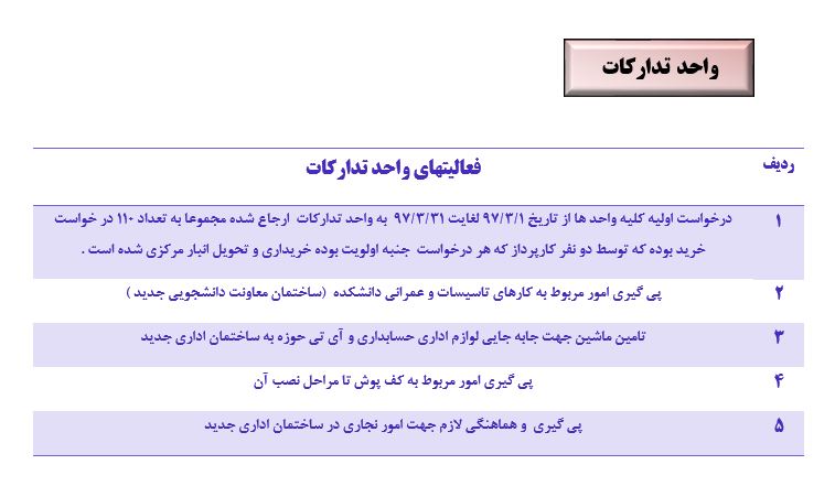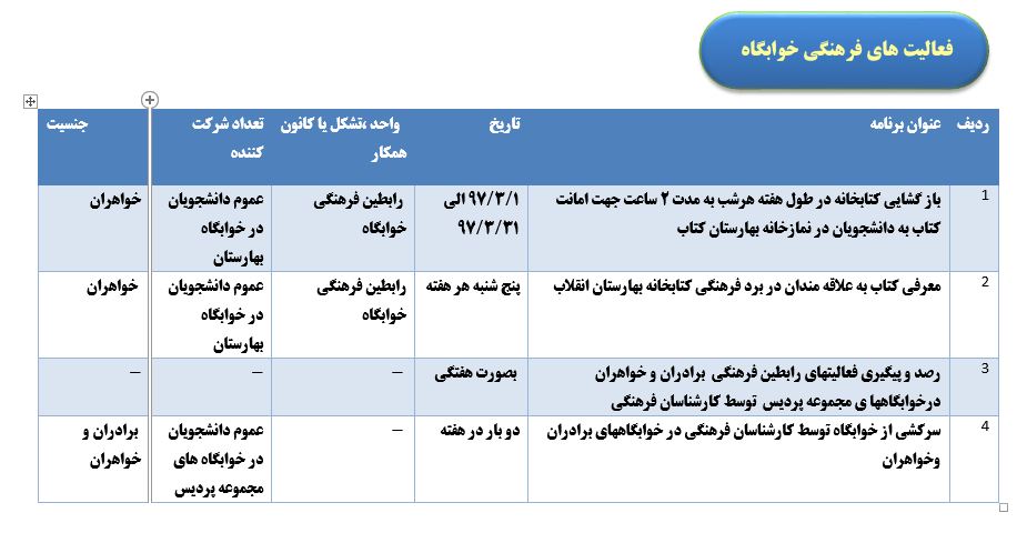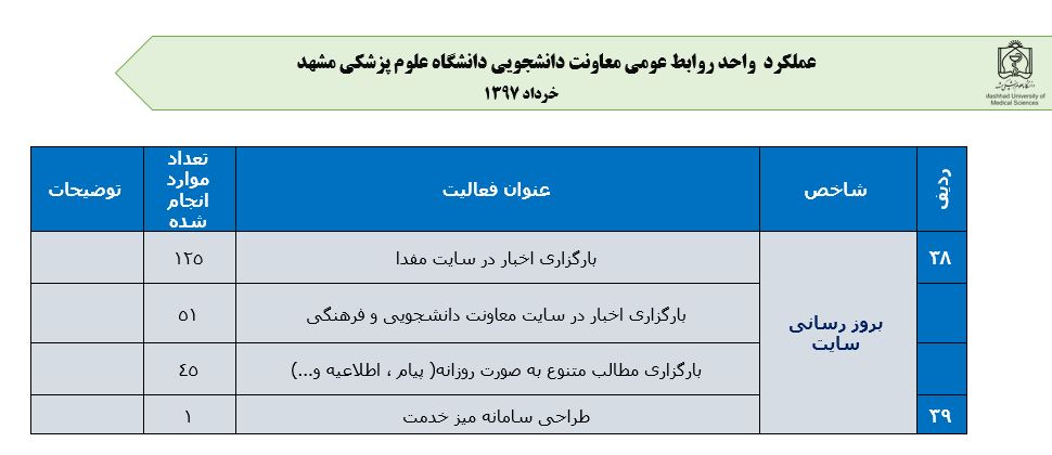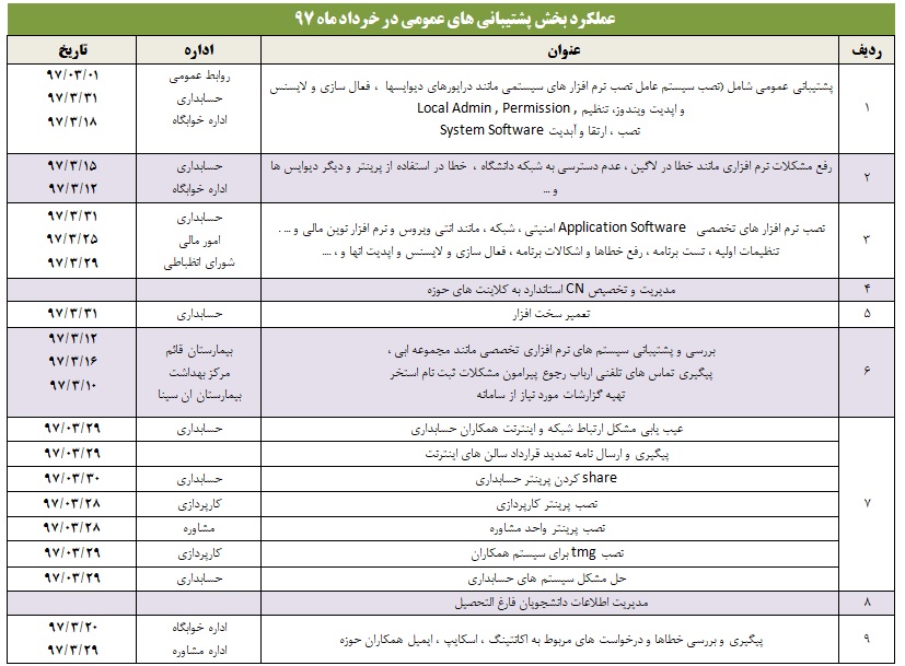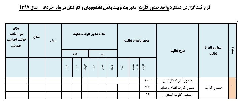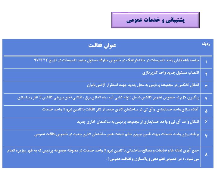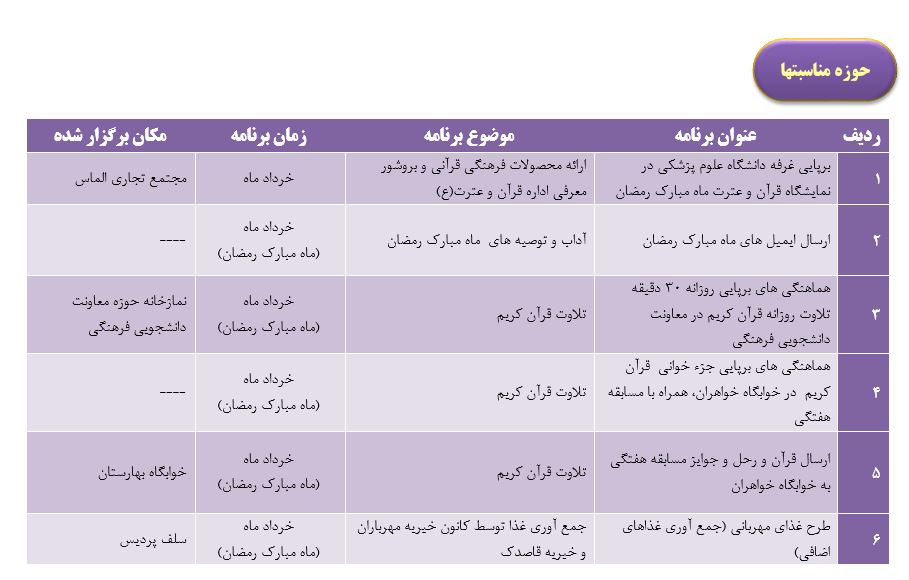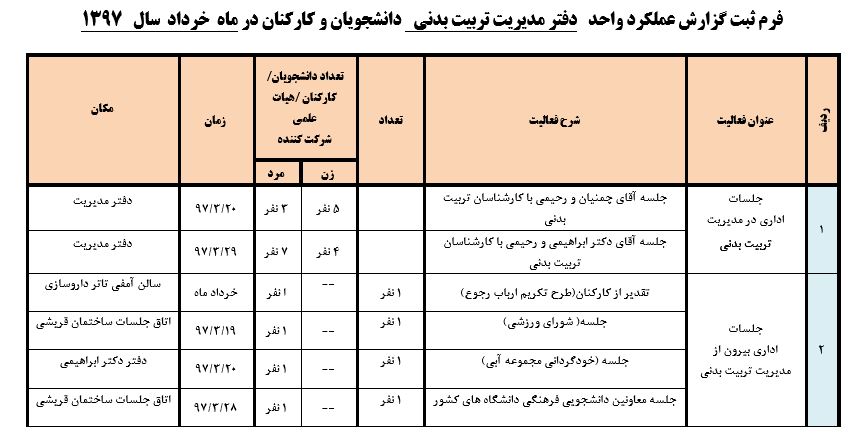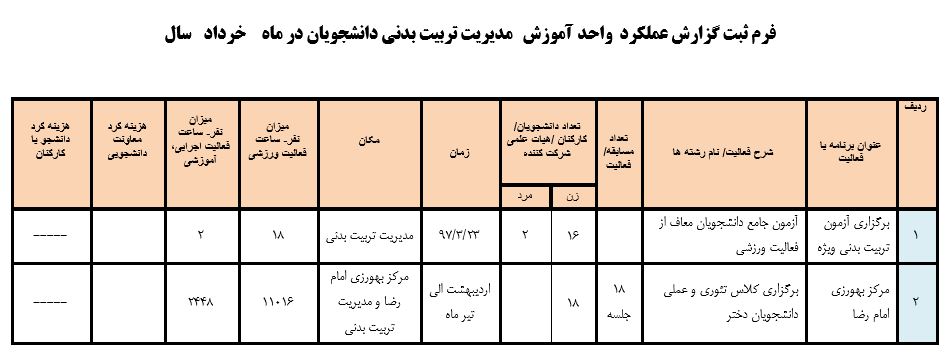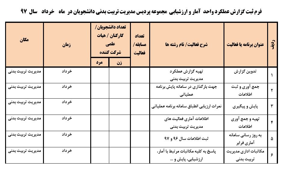 جعفریان مریم گزارش 97 30 خرداد 1397 30 خرداد 1397 بازدید: 558 امتیاز: ( 0 Rating ) خرداد 97 امتیاز کاربران لطفا رای دهید رای 1 رای 2 رای 3 رای 4 رای 5 مدیریت دانشجویی عملکرد اداره رفــاه عملکرد اداره تغذیه : تعداد کل پرس غذای توزیع شده اداره خوابگاه: گزارش عملکرد مدیریت فرهنگی اداره امور فرهنگی دانشجویان و کارکنان دبیرخانه نشریات دبیرخانه شورای فرهنگی دبیرخانه جشنواره فرهنگی دبیرخانه کانون های فرهنگی دبیرخانه تشکل های دانشجویی اداره فوق برنامه اردوهــا برنامه های ماه مبارک رمضان برپایی و بزرگداشت مراسم ملـی و مذهبـی فعالیت هـای فـرهنگـی خوابگاه اداره توسعه فعالیت های قرآن و عترت(ع) دانشجویان و کارکنان پژوهشــی آمـوزشــی حـوزه مناسبت هــا کانون قرآن و عتـرت بیست و سومین جشنواره قرآن و عترت دانشگاه های علوم پزشکی مدیریت تربیت بدنی تعداد استفاده کنندگان از مجموعه آبی دفتر مدیریت تربیت بدنی صدور کارت استخر مجموعه آبی شهید شادیفر - شیفت آقایان مجموعه آبی شهید شادیفر - شیفت بانوان فوق برنامه قهرمانی دانشجویان دختر فوق برنامه قهرمانی دانشجویان پسر ورزش کارکنان واحد آموزش ورزش همگانی واحد آمار و ارزشیابی مشاوره و سلامت روان عملکرد اداره مشاوره و سلامت روان شورای انضباطی فعالیت های شورای انضباطی دانشجویان جلسات شورای بدوی و تجدید نظر انضباطی روابط عمومی تدوین اهداف اجرایی توانمندسازی مصاحبه های حضوری در طی مراسمات مختلف اطلاع رسانی تبلیغات محیطی همایش ها سمعی و بصری جلسات برگزار شده بروز رسانی سایت مفدا و معاونت فرهنگی دانشجویی امور پشتیبانی پشتیبانی و خدمات عمومــی انبــار فضای سبــز تــدارکات تـاسیســات نقلیــه سایــر واحــدهـا فناوری اطلاعات پشتیبانی های عمـومی شبکــه نرم افـزار قبلی بعدی