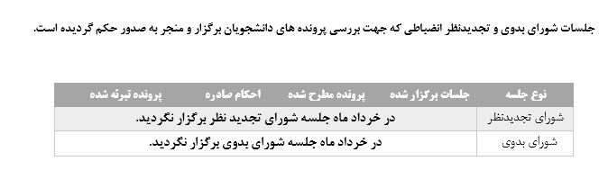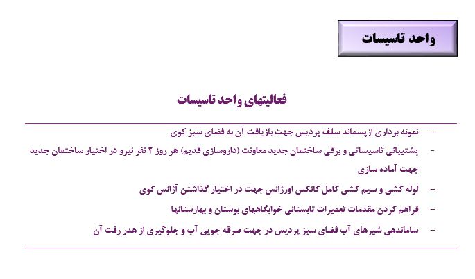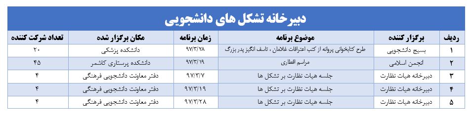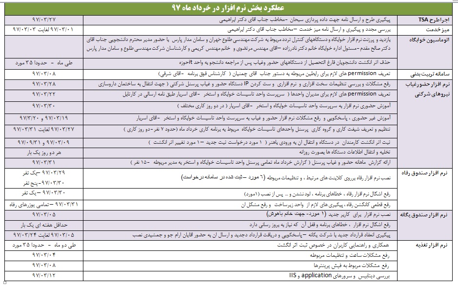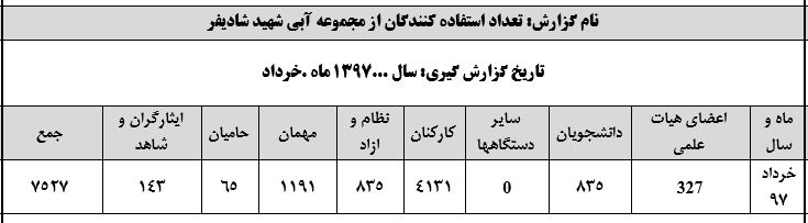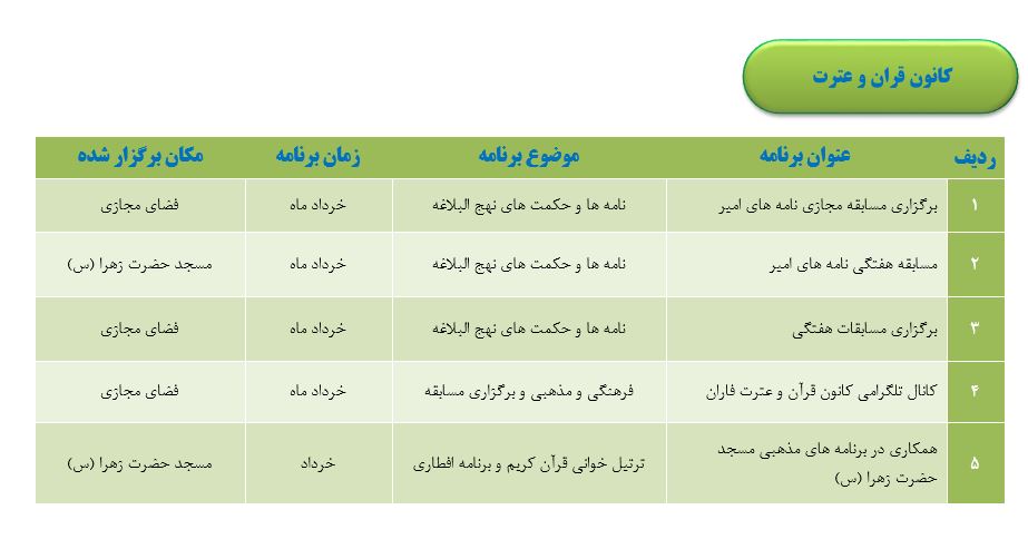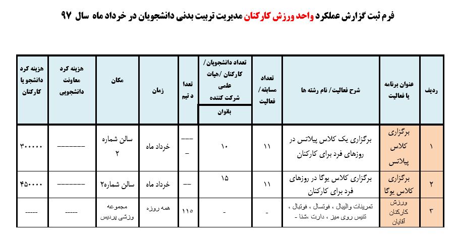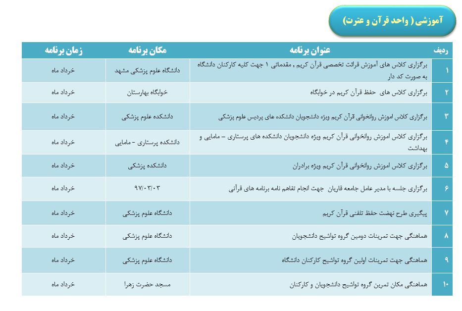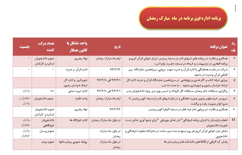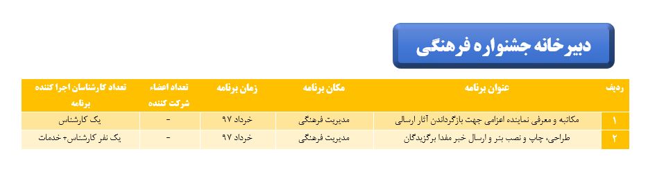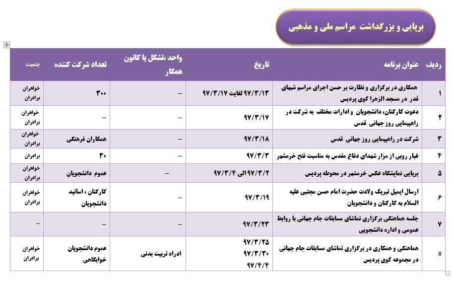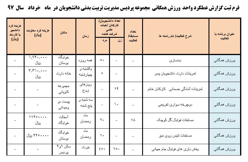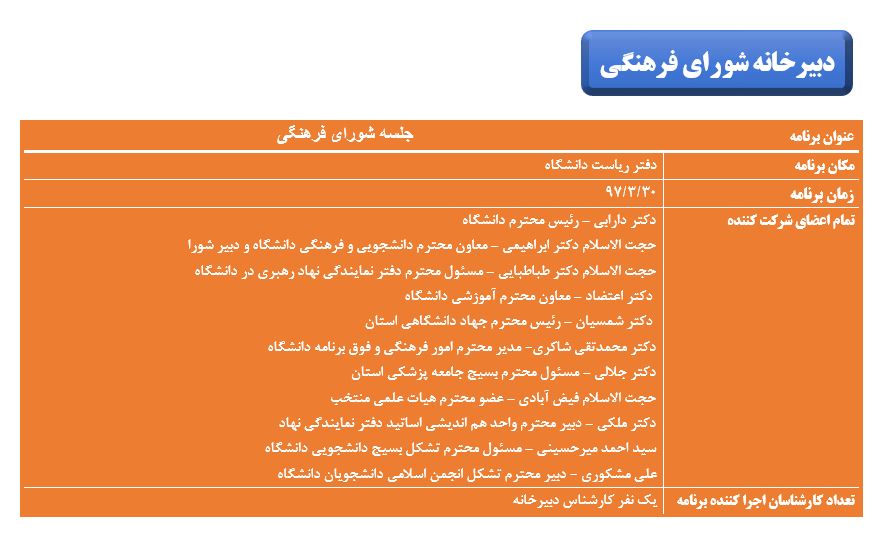 جعفریان مریم گزارش 97 30 خرداد 1397 30 خرداد 1397 بازدید: 558 امتیاز: ( 0 Rating ) خرداد 97 امتیاز کاربران لطفا رای دهید رای 1 رای 2 رای 3 رای 4 رای 5 مدیریت دانشجویی عملکرد اداره رفــاه عملکرد اداره تغذیه : تعداد کل پرس غذای توزیع شده اداره خوابگاه: گزارش عملکرد مدیریت فرهنگی اداره امور فرهنگی دانشجویان و کارکنان دبیرخانه نشریات دبیرخانه شورای فرهنگی دبیرخانه جشنواره فرهنگی دبیرخانه کانون های فرهنگی دبیرخانه تشکل های دانشجویی اداره فوق برنامه اردوهــا برنامه های ماه مبارک رمضان برپایی و بزرگداشت مراسم ملـی و مذهبـی فعالیت هـای فـرهنگـی خوابگاه اداره توسعه فعالیت های قرآن و عترت(ع) دانشجویان و کارکنان پژوهشــی آمـوزشــی حـوزه مناسبت هــا کانون قرآن و عتـرت بیست و سومین جشنواره قرآن و عترت دانشگاه های علوم پزشکی مدیریت تربیت بدنی تعداد استفاده کنندگان از مجموعه آبی دفتر مدیریت تربیت بدنی صدور کارت استخر مجموعه آبی شهید شادیفر - شیفت آقایان مجموعه آبی شهید شادیفر - شیفت بانوان فوق برنامه قهرمانی دانشجویان دختر فوق برنامه قهرمانی دانشجویان پسر ورزش کارکنان واحد آموزش ورزش همگانی واحد آمار و ارزشیابی مشاوره و سلامت روان عملکرد اداره مشاوره و سلامت روان شورای انضباطی فعالیت های شورای انضباطی دانشجویان جلسات شورای بدوی و تجدید نظر انضباطی روابط عمومی تدوین اهداف اجرایی توانمندسازی مصاحبه های حضوری در طی مراسمات مختلف اطلاع رسانی تبلیغات محیطی همایش ها سمعی و بصری جلسات برگزار شده بروز رسانی سایت مفدا و معاونت فرهنگی دانشجویی امور پشتیبانی پشتیبانی و خدمات عمومــی انبــار فضای سبــز تــدارکات تـاسیســات نقلیــه سایــر واحــدهـا فناوری اطلاعات پشتیبانی های عمـومی شبکــه نرم افـزار قبلی بعدی