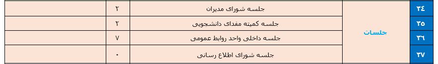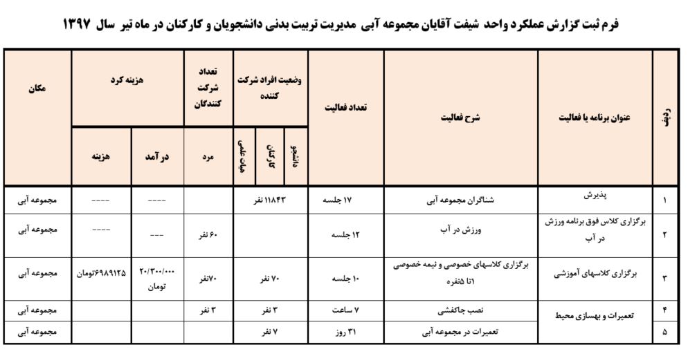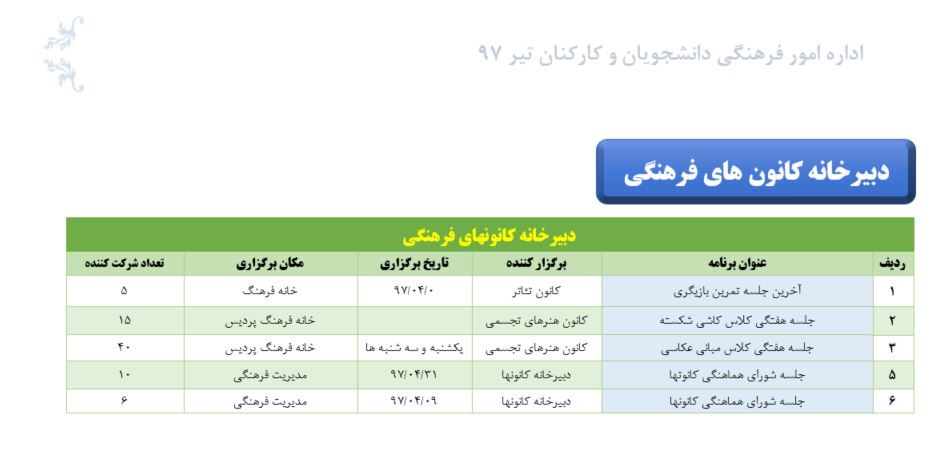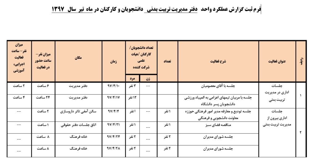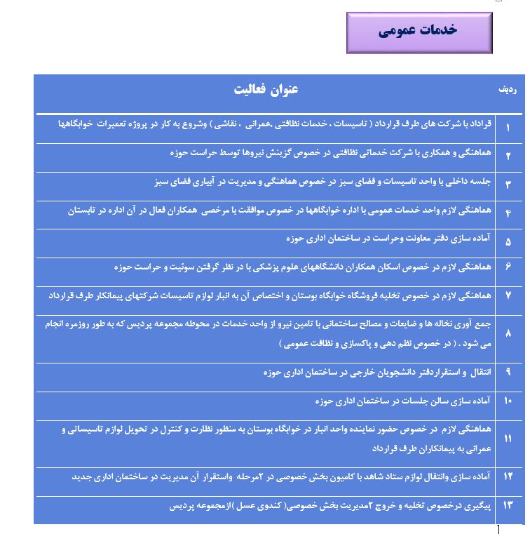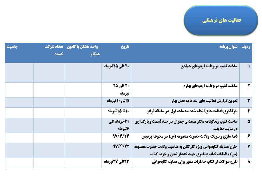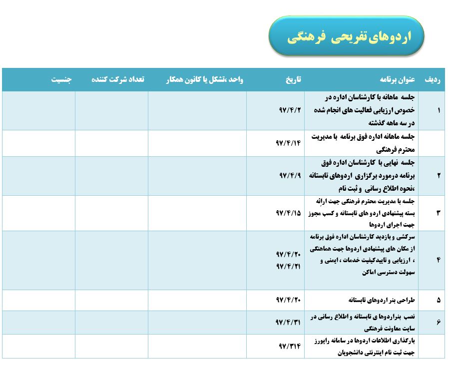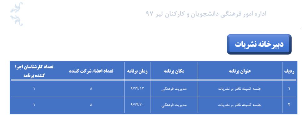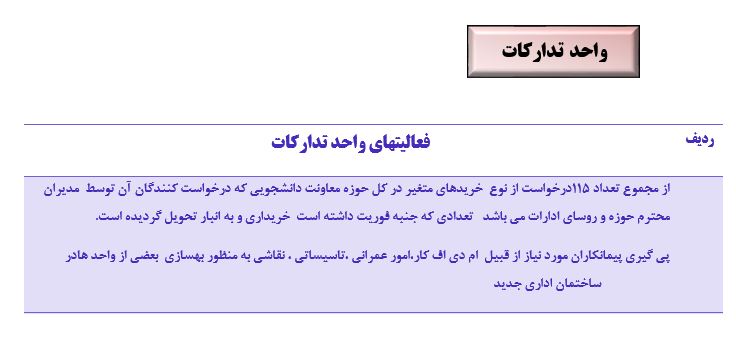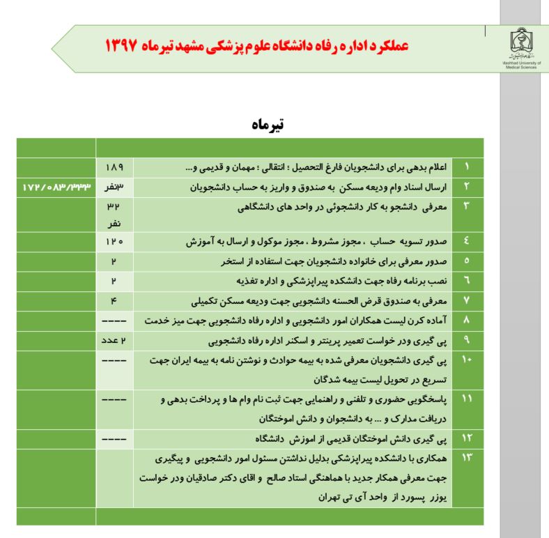 جعفریان مریم گزارش 97 28 تیر 1397 28 تیر 1397 بازدید: 537 امتیاز: ( 0 Rating ) تیر 97 امتیاز کاربران لطفا رای دهید رای 1 رای 2 رای 3 رای 4 رای 5 مدیریت دانشجویی عملکرد اداره رفــاه عملکرد اداره تغذیه اداره خوابگاه مدیریت فرهنگی اداره امور فرهنگی دانشجویان و کارکنان دبیرخانه نشریات دبیرخانه شورای فرهنگی دبیرخانه جشنواره فرهنگی دبیرخانه کانون های فرهنگی دبیرخانه تشکل های دانشجویی اداره فوق برنامه اردوهــا اردوهای جهادی فعالیت هـای فـرهنگـی اداره توسعه فعالیت های قرآن و عترت(ع) دانشجویان و کارکنان پژوهشــی آمـوزشــی حـوزه مناسبت هــا کانون قرآن و عتـرت بیست و سومین جشنواره قرآن و عترت دانشگاه های علوم پزشکی مدیریت تربیت بدنی تعداد استفاده کنندگان از مجموعه آبی دفتر مدیریت تربیت بدنی مجموعه آبی شهید شادیفر - شیفت آقایان مجموعه آبی شهید شادیفر - شیفت بانوان فوق برنامه قهرمانی دانشجویان دختر فوق برنامه قهرمانی دانشجویان پسر ورزش کارکنان واحد آموزش ورزش همگانی ورزش دانشکده ها واحد آمار و ارزشیابی مشاوره و سلامت روان عملکرد اداره مشاوره و سلامت روان شورای انضباطی فعالیت های شورای انضباطی دانشجویان جلسات شورای بدوی و تجدید نظر انضباطی تخلفانی که براساس آیین نامه و شیو نامه انضباطی در شورای بدوی انضباطی منجر به صدور حکم شده است. احکامی که با توجه به تخلفات براساس آیین نامه و شیو نامه انضباطی در شورای بدوی انضباطی صادر و قابل بررسی در شورای تحدیدنظر انضباطی است. روابط عمومی تدوین اهداف اجرایی توانمندسازی مصاحبه های حضوری در طی مراسمات مختلف اطلاع رسانی تبلیغات محیطی همایش ها سمعی و بصری جلسات برگزار شده بروز رسانی سایت مفدا و معاونت فرهنگی دانشجویی امور پشتیبانی پشتیبانی و خدمات عمومــی انبــار فضای سبــز تــدارکات تـاسیســات نقلیــه سایــر واحــدهـا فناوری اطلاعات پشتیبانی های عمـومی نرم افـزار شبکه قبلی بعدی