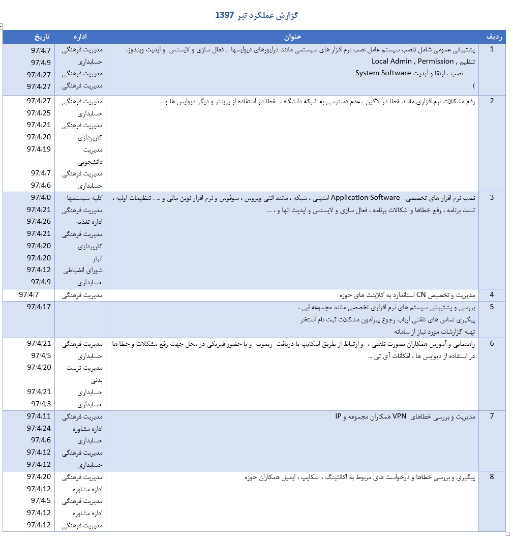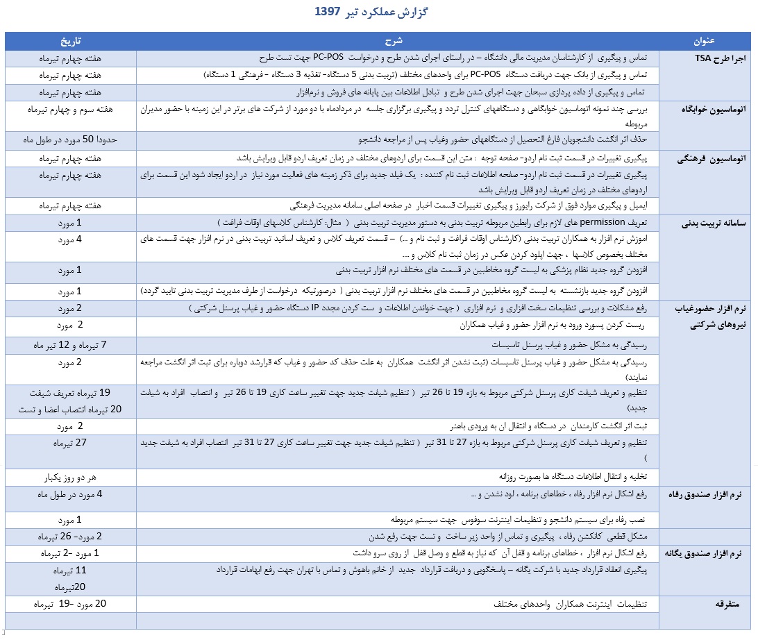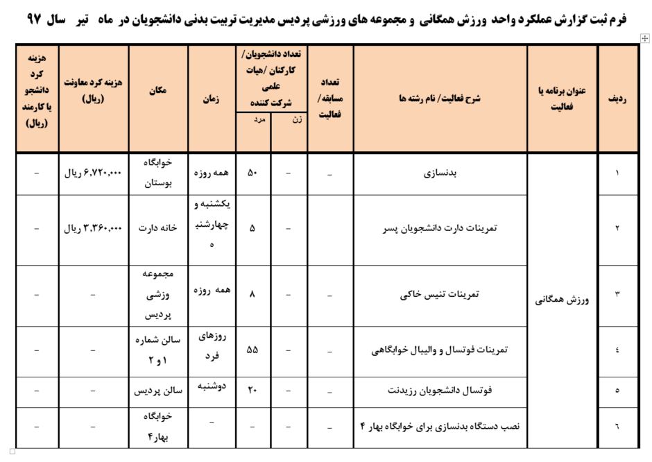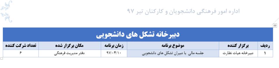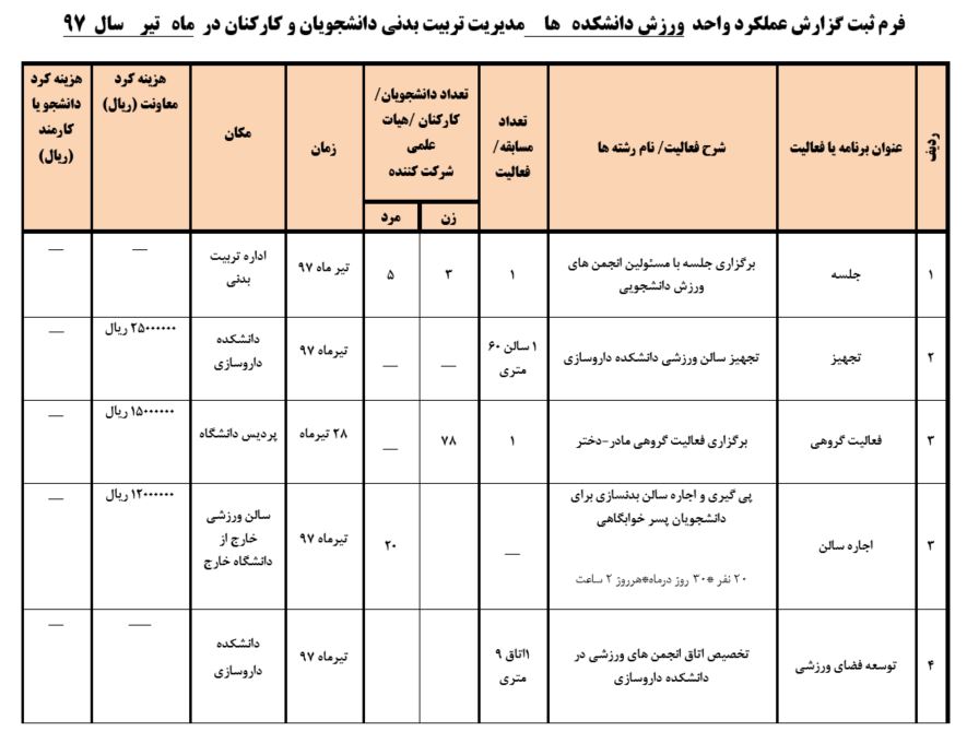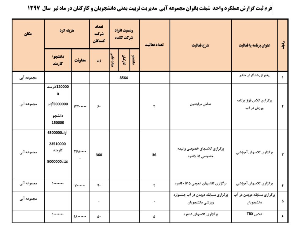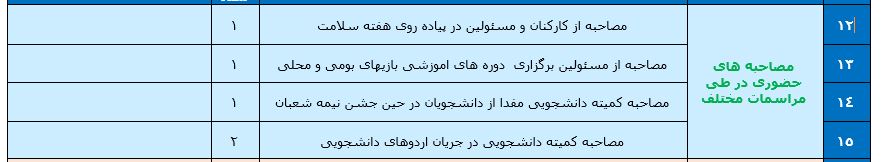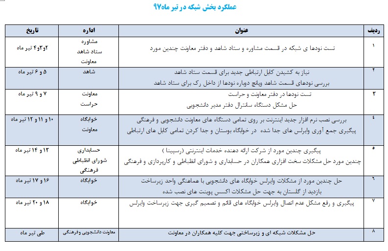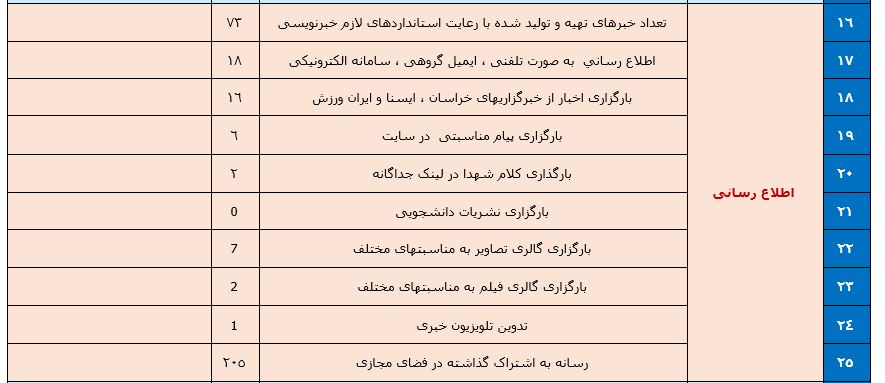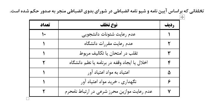 جعفریان مریم گزارش 97 28 تیر 1397 28 تیر 1397 بازدید: 537 امتیاز: ( 0 Rating ) تیر 97 امتیاز کاربران لطفا رای دهید رای 1 رای 2 رای 3 رای 4 رای 5 مدیریت دانشجویی عملکرد اداره رفــاه عملکرد اداره تغذیه اداره خوابگاه مدیریت فرهنگی اداره امور فرهنگی دانشجویان و کارکنان دبیرخانه نشریات دبیرخانه شورای فرهنگی دبیرخانه جشنواره فرهنگی دبیرخانه کانون های فرهنگی دبیرخانه تشکل های دانشجویی اداره فوق برنامه اردوهــا اردوهای جهادی فعالیت هـای فـرهنگـی اداره توسعه فعالیت های قرآن و عترت(ع) دانشجویان و کارکنان پژوهشــی آمـوزشــی حـوزه مناسبت هــا کانون قرآن و عتـرت بیست و سومین جشنواره قرآن و عترت دانشگاه های علوم پزشکی مدیریت تربیت بدنی تعداد استفاده کنندگان از مجموعه آبی دفتر مدیریت تربیت بدنی مجموعه آبی شهید شادیفر - شیفت آقایان مجموعه آبی شهید شادیفر - شیفت بانوان فوق برنامه قهرمانی دانشجویان دختر فوق برنامه قهرمانی دانشجویان پسر ورزش کارکنان واحد آموزش ورزش همگانی ورزش دانشکده ها واحد آمار و ارزشیابی مشاوره و سلامت روان عملکرد اداره مشاوره و سلامت روان شورای انضباطی فعالیت های شورای انضباطی دانشجویان جلسات شورای بدوی و تجدید نظر انضباطی تخلفانی که براساس آیین نامه و شیو نامه انضباطی در شورای بدوی انضباطی منجر به صدور حکم شده است. احکامی که با توجه به تخلفات براساس آیین نامه و شیو نامه انضباطی در شورای بدوی انضباطی صادر و قابل بررسی در شورای تحدیدنظر انضباطی است. روابط عمومی تدوین اهداف اجرایی توانمندسازی مصاحبه های حضوری در طی مراسمات مختلف اطلاع رسانی تبلیغات محیطی همایش ها سمعی و بصری جلسات برگزار شده بروز رسانی سایت مفدا و معاونت فرهنگی دانشجویی امور پشتیبانی پشتیبانی و خدمات عمومــی انبــار فضای سبــز تــدارکات تـاسیســات نقلیــه سایــر واحــدهـا فناوری اطلاعات پشتیبانی های عمـومی نرم افـزار شبکه قبلی بعدی