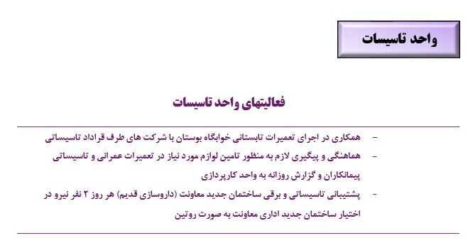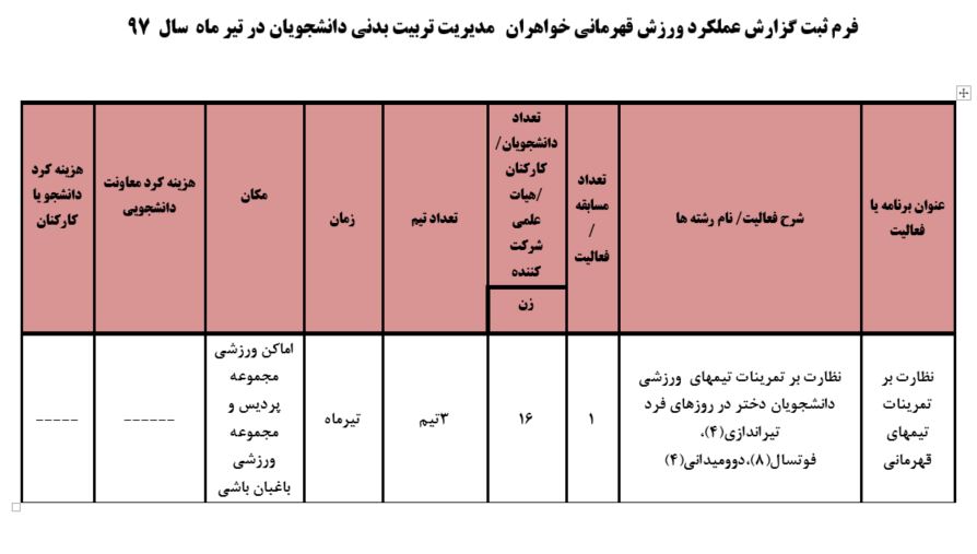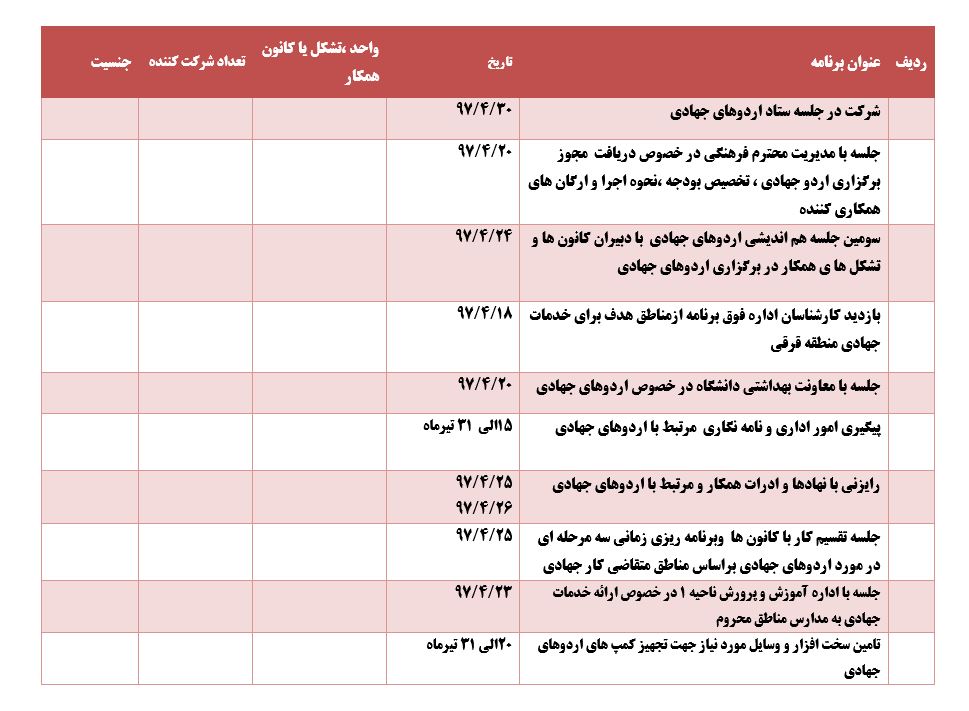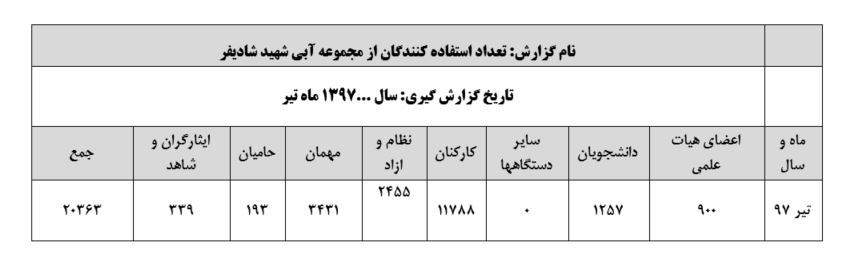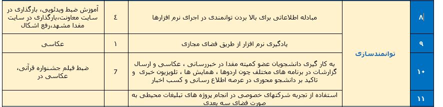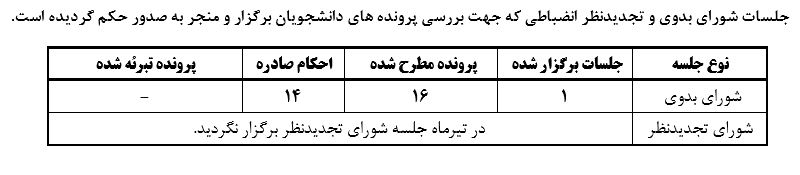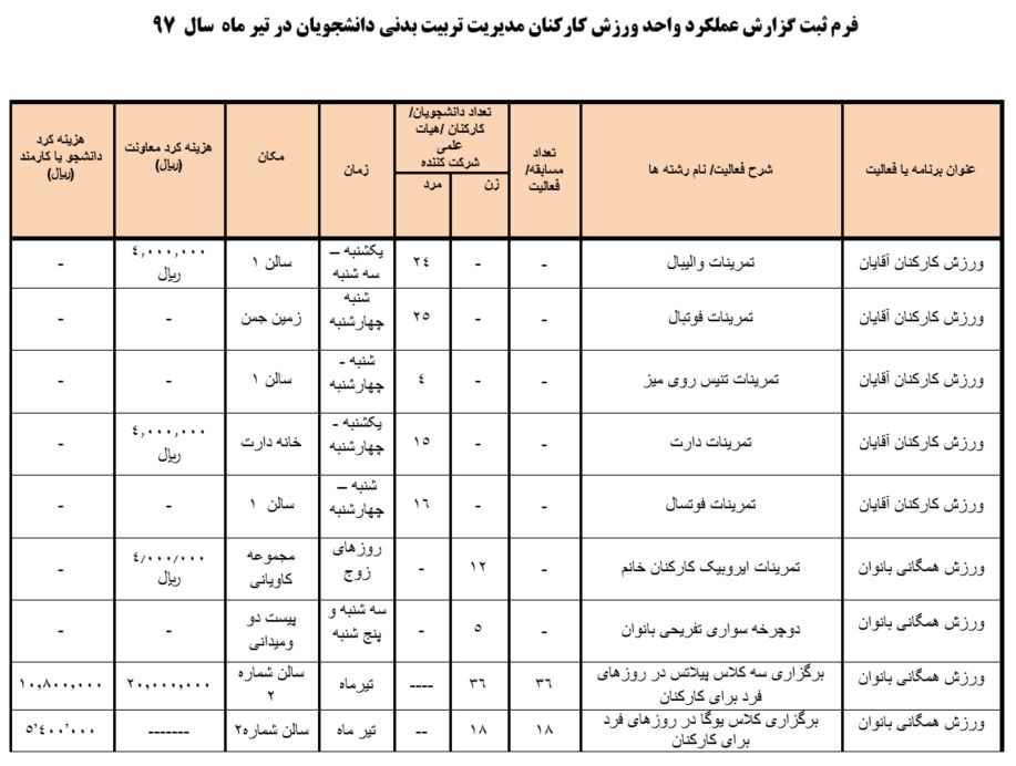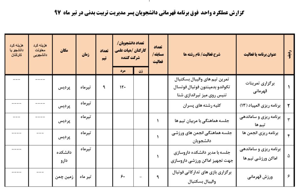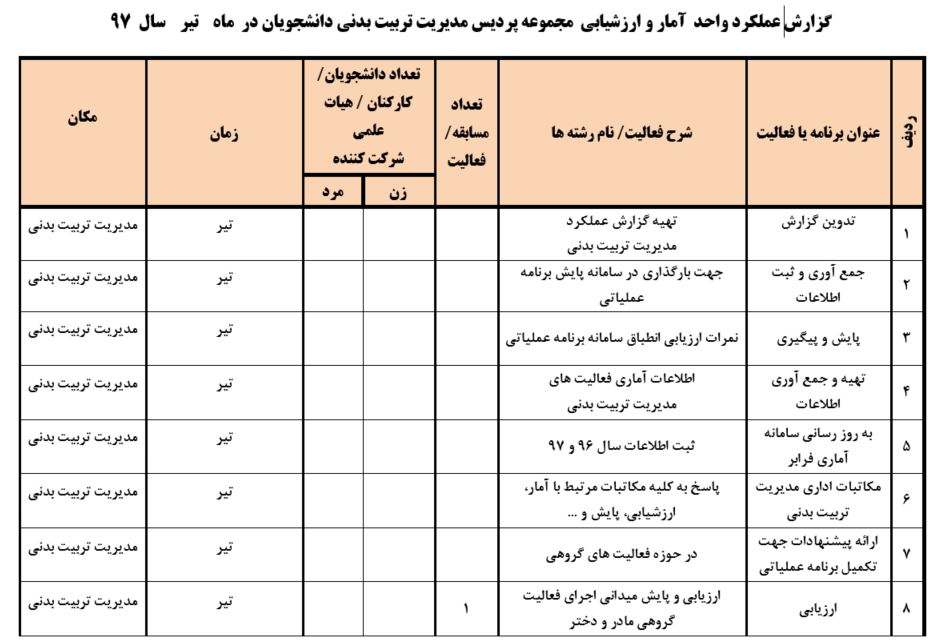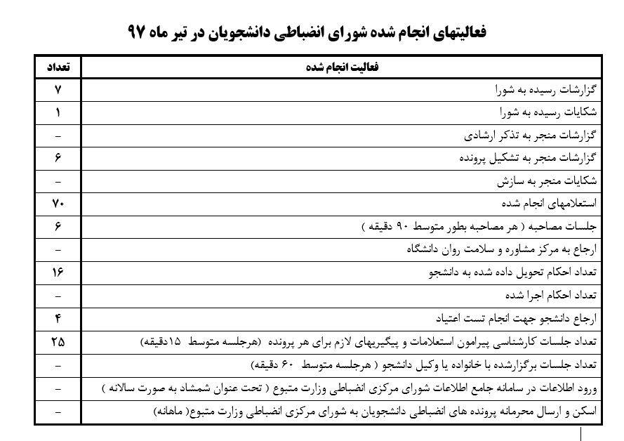 جعفریان مریم گزارش 97 28 تیر 1397 28 تیر 1397 بازدید: 537 امتیاز: ( 0 Rating ) تیر 97 امتیاز کاربران لطفا رای دهید رای 1 رای 2 رای 3 رای 4 رای 5 مدیریت دانشجویی عملکرد اداره رفــاه عملکرد اداره تغذیه اداره خوابگاه مدیریت فرهنگی اداره امور فرهنگی دانشجویان و کارکنان دبیرخانه نشریات دبیرخانه شورای فرهنگی دبیرخانه جشنواره فرهنگی دبیرخانه کانون های فرهنگی دبیرخانه تشکل های دانشجویی اداره فوق برنامه اردوهــا اردوهای جهادی فعالیت هـای فـرهنگـی اداره توسعه فعالیت های قرآن و عترت(ع) دانشجویان و کارکنان پژوهشــی آمـوزشــی حـوزه مناسبت هــا کانون قرآن و عتـرت بیست و سومین جشنواره قرآن و عترت دانشگاه های علوم پزشکی مدیریت تربیت بدنی تعداد استفاده کنندگان از مجموعه آبی دفتر مدیریت تربیت بدنی مجموعه آبی شهید شادیفر - شیفت آقایان مجموعه آبی شهید شادیفر - شیفت بانوان فوق برنامه قهرمانی دانشجویان دختر فوق برنامه قهرمانی دانشجویان پسر ورزش کارکنان واحد آموزش ورزش همگانی ورزش دانشکده ها واحد آمار و ارزشیابی مشاوره و سلامت روان عملکرد اداره مشاوره و سلامت روان شورای انضباطی فعالیت های شورای انضباطی دانشجویان جلسات شورای بدوی و تجدید نظر انضباطی تخلفانی که براساس آیین نامه و شیو نامه انضباطی در شورای بدوی انضباطی منجر به صدور حکم شده است. احکامی که با توجه به تخلفات براساس آیین نامه و شیو نامه انضباطی در شورای بدوی انضباطی صادر و قابل بررسی در شورای تحدیدنظر انضباطی است. روابط عمومی تدوین اهداف اجرایی توانمندسازی مصاحبه های حضوری در طی مراسمات مختلف اطلاع رسانی تبلیغات محیطی همایش ها سمعی و بصری جلسات برگزار شده بروز رسانی سایت مفدا و معاونت فرهنگی دانشجویی امور پشتیبانی پشتیبانی و خدمات عمومــی انبــار فضای سبــز تــدارکات تـاسیســات نقلیــه سایــر واحــدهـا فناوری اطلاعات پشتیبانی های عمـومی نرم افـزار شبکه قبلی بعدی