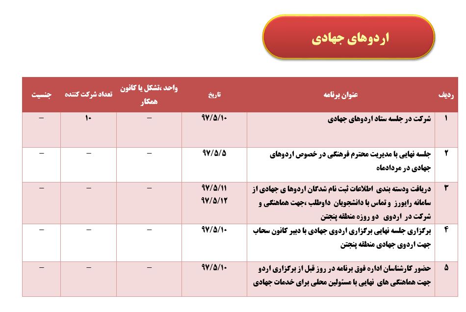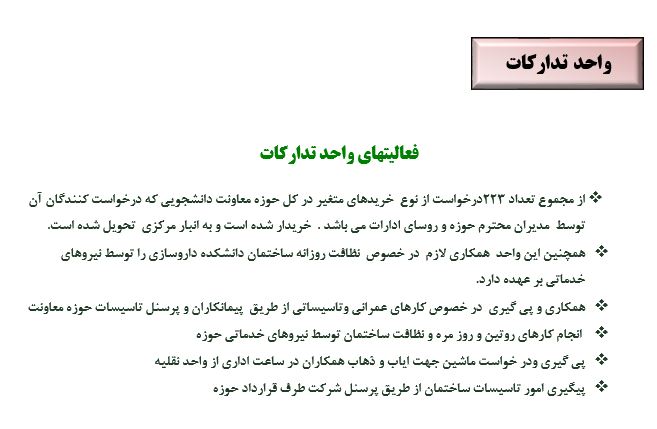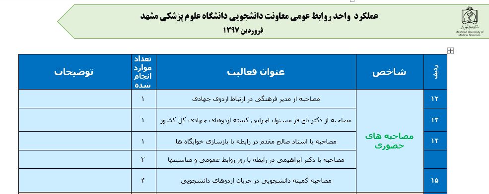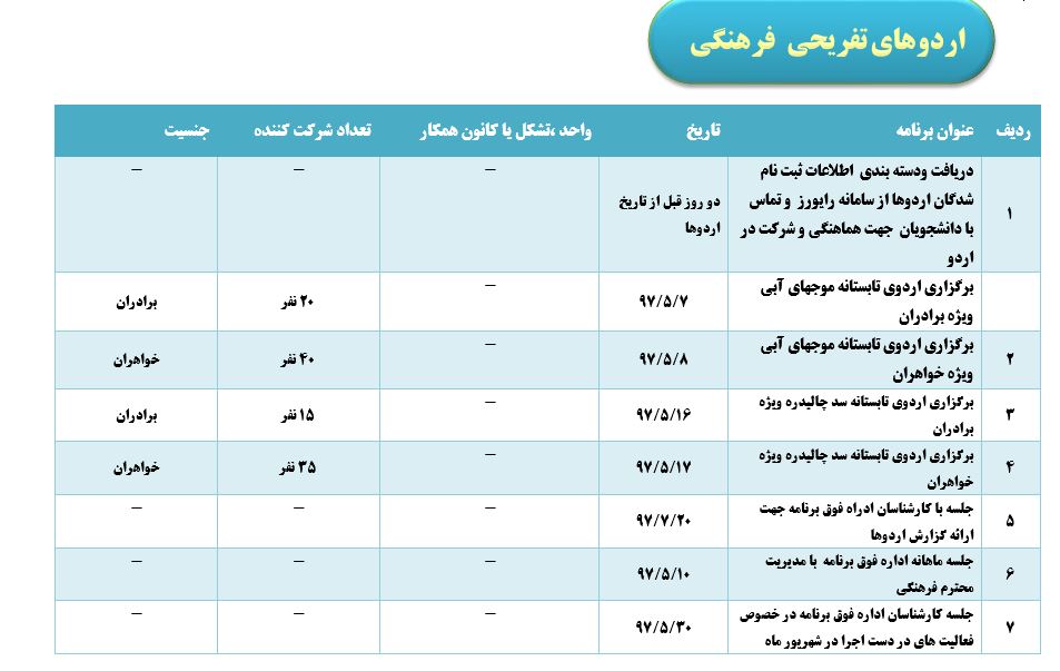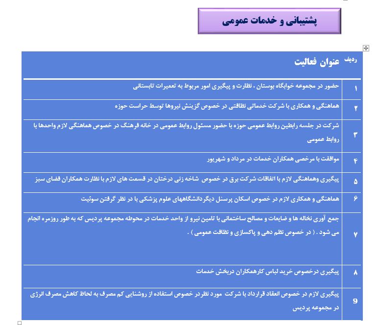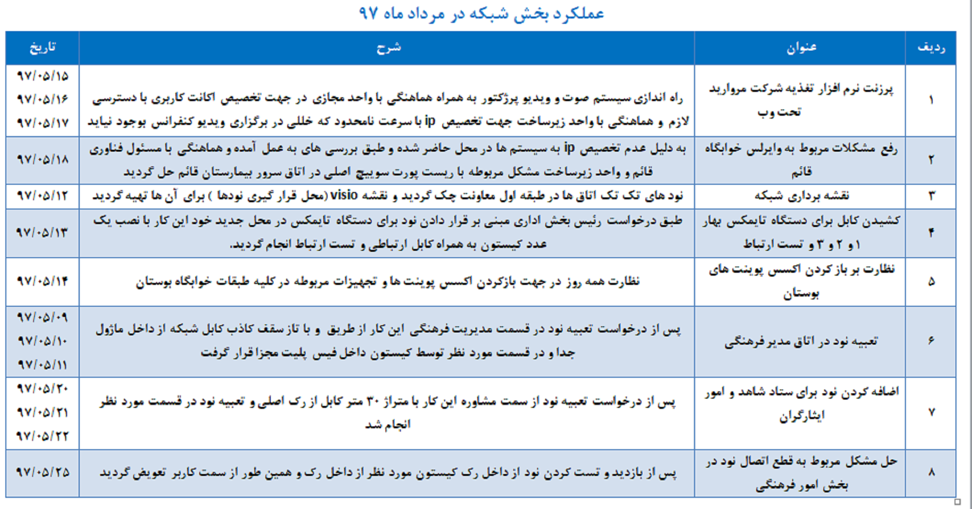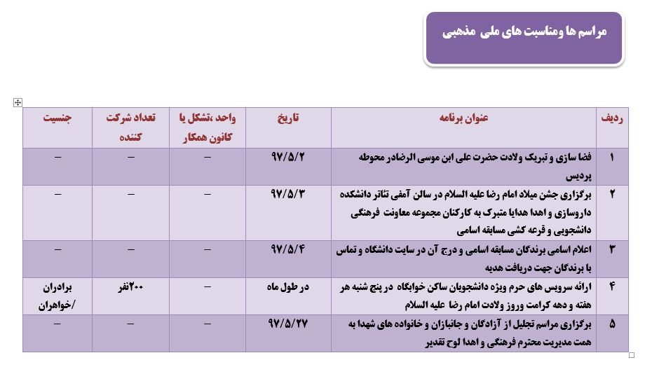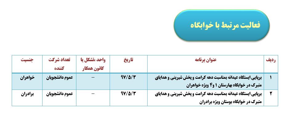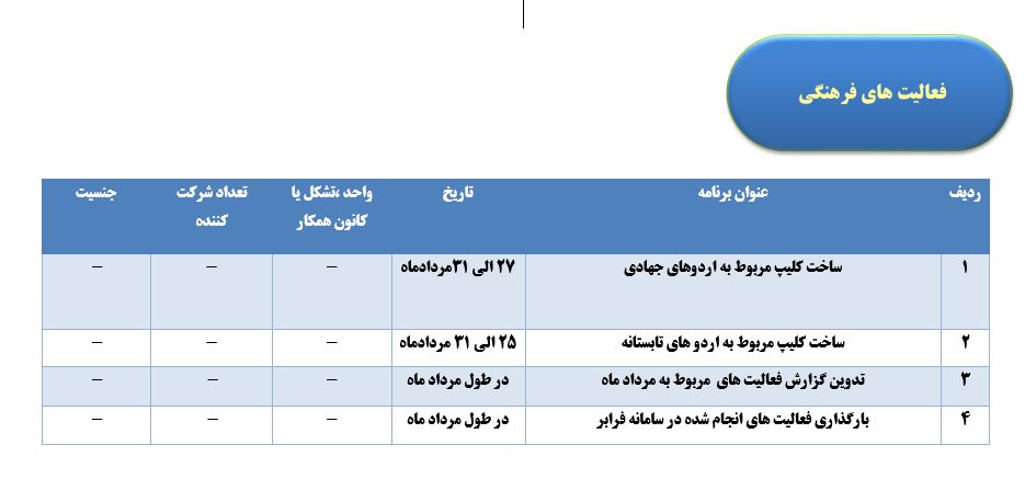 جعفریان مریم گزارش 97 30 مرداد 1397 30 مرداد 1397 بازدید: 505 امتیاز: ( 0 Rating ) مرداد 97 امتیاز کاربران لطفا رای دهید رای 1 رای 2 رای 3 رای 4 رای 5 مدیریت دانشجویی عملکرد اداره رفــاه عملکرد اداره تغذیه : تعداد کل پرس غذای توزیع شده اداره خوابگاه: گزارش عملکرد مدیریت فرهنگی اداره امور فرهنگی دانشجویان و کارکنان دبیرخانه نشریات دبیرخانه شورای فرهنگی دبیرخانه جشنواره فرهنگی دبیرخانه کانون های فرهنگی دبیرخانه تشکل های دانشجویی اداره فوق برنامه اردوهــا اردوهای جهادی صفحه 1 صفحه 2 صفحه 3 فعالیت هـای فـرهنگـی مراسمات و مناسبت های ملی مذهبی فعالیت های مرتبط با خوابگاه اداره توسعه فعالیت های قرآن و عترت(ع) دانشجویان و کارکنان پژوهشــی آمـوزشــی حـوزه مناسبت هــا کانون قرآن و عتـرت بیست و سومین جشنواره قرآن و عترت دانشگاه های علوم پزشکی مدیریت تربیت بدنی تعداد استفاده کنندگان از مجموعه آبی دفتر مدیریت تربیت بدنی مجموعه آبی شهید شادیفر مجموعه آبی شهید شادیفر - شیفت بانوان صدور کارت فوق برنامه قهرمانی دانشجویان پسر ورزش کارکنان واحد آموزش ورزش همگانی ورزش دانشکده ها واحد آمار و ارزشیابی مشاوره و سلامت روان عملکرد اداره مشاوره و سلامت روان شورای انضباطی فعالیت های شورای انضباطی دانشجویان روابط عمومی تدوین اهداف اجرایی توانمندسازی مصاحبه های حضوری در طی مراسمات مختلف اطلاع رسانی تبلیغات محیطی همایش ها سمعی و بصری جلسات برگزار شده سنجش افکار عمومی بروز رسانی سایت مفدا و معاونت فرهنگی دانشجویی امور پشتیبانی پشتیبانی و خدمات عمومــی انبــار فضای سبــز تــدارکات نقلیــه سایــر واحــدهـا دبیـرخانـه فناوری اطلاعات پشتیبانی های عمـومی نرم افـزار شبکه قبلی بعدی