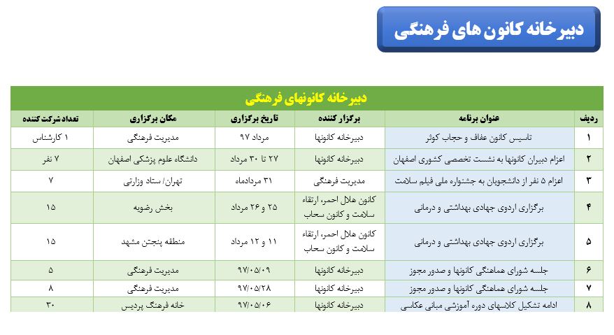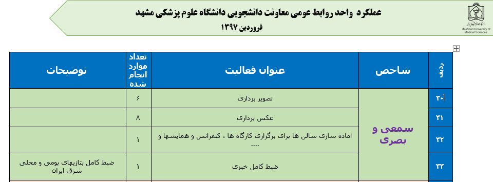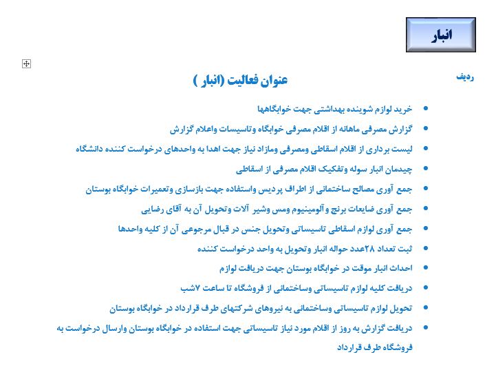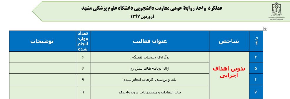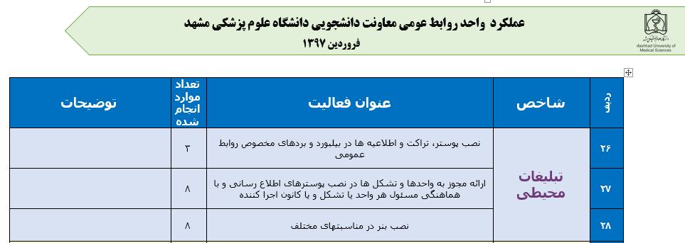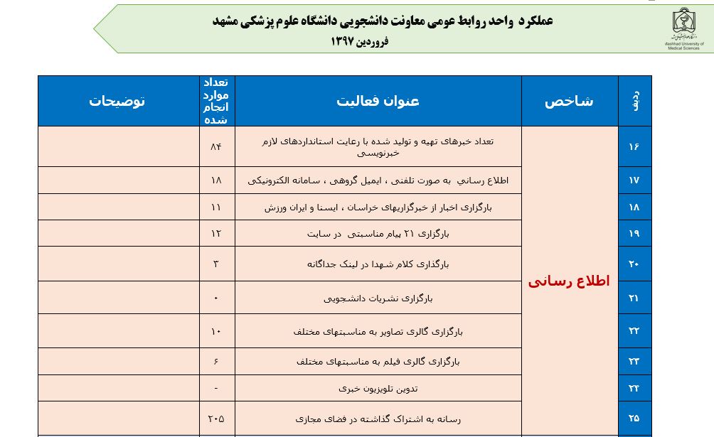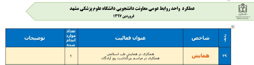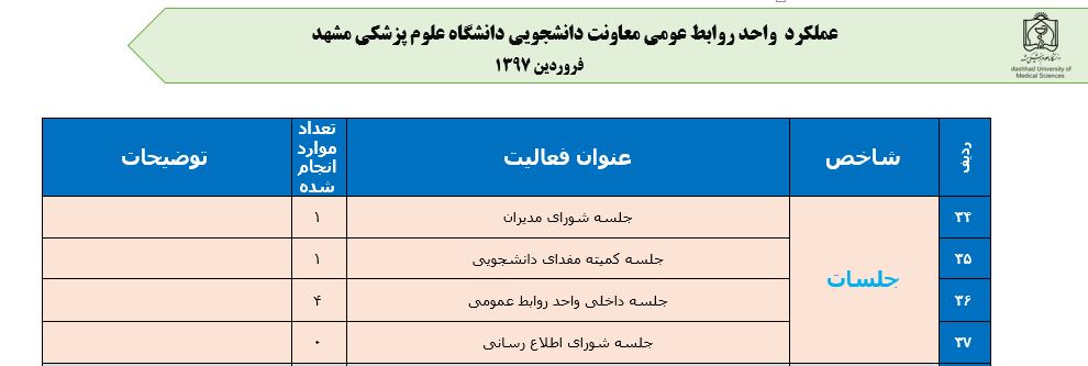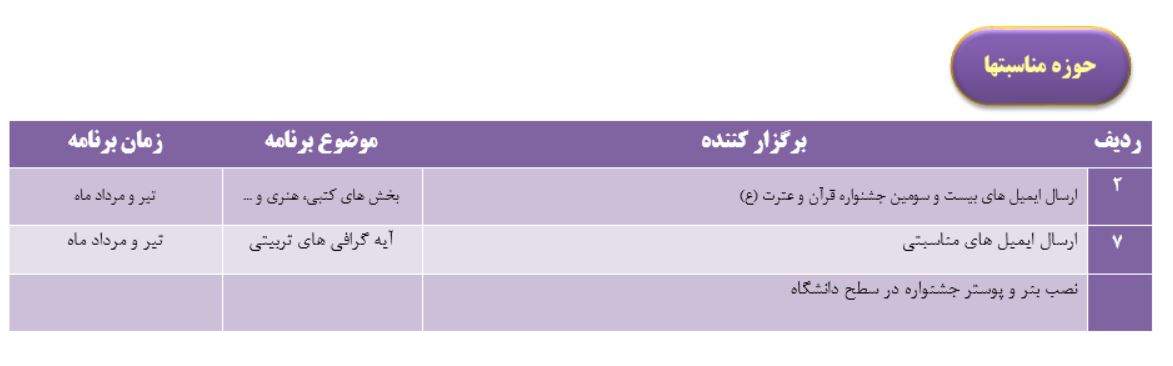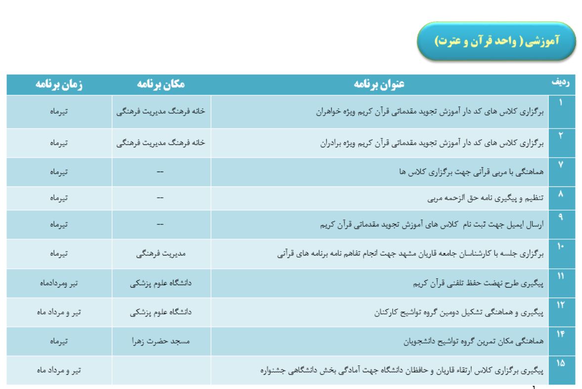 جعفریان مریم گزارش 97 30 مرداد 1397 30 مرداد 1397 بازدید: 505 امتیاز: ( 0 Rating ) مرداد 97 امتیاز کاربران لطفا رای دهید رای 1 رای 2 رای 3 رای 4 رای 5 مدیریت دانشجویی عملکرد اداره رفــاه عملکرد اداره تغذیه : تعداد کل پرس غذای توزیع شده اداره خوابگاه: گزارش عملکرد مدیریت فرهنگی اداره امور فرهنگی دانشجویان و کارکنان دبیرخانه نشریات دبیرخانه شورای فرهنگی دبیرخانه جشنواره فرهنگی دبیرخانه کانون های فرهنگی دبیرخانه تشکل های دانشجویی اداره فوق برنامه اردوهــا اردوهای جهادی صفحه 1 صفحه 2 صفحه 3 فعالیت هـای فـرهنگـی مراسمات و مناسبت های ملی مذهبی فعالیت های مرتبط با خوابگاه اداره توسعه فعالیت های قرآن و عترت(ع) دانشجویان و کارکنان پژوهشــی آمـوزشــی حـوزه مناسبت هــا کانون قرآن و عتـرت بیست و سومین جشنواره قرآن و عترت دانشگاه های علوم پزشکی مدیریت تربیت بدنی تعداد استفاده کنندگان از مجموعه آبی دفتر مدیریت تربیت بدنی مجموعه آبی شهید شادیفر مجموعه آبی شهید شادیفر - شیفت بانوان صدور کارت فوق برنامه قهرمانی دانشجویان پسر ورزش کارکنان واحد آموزش ورزش همگانی ورزش دانشکده ها واحد آمار و ارزشیابی مشاوره و سلامت روان عملکرد اداره مشاوره و سلامت روان شورای انضباطی فعالیت های شورای انضباطی دانشجویان روابط عمومی تدوین اهداف اجرایی توانمندسازی مصاحبه های حضوری در طی مراسمات مختلف اطلاع رسانی تبلیغات محیطی همایش ها سمعی و بصری جلسات برگزار شده سنجش افکار عمومی بروز رسانی سایت مفدا و معاونت فرهنگی دانشجویی امور پشتیبانی پشتیبانی و خدمات عمومــی انبــار فضای سبــز تــدارکات نقلیــه سایــر واحــدهـا دبیـرخانـه فناوری اطلاعات پشتیبانی های عمـومی نرم افـزار شبکه قبلی بعدی