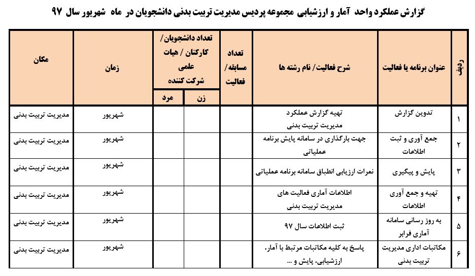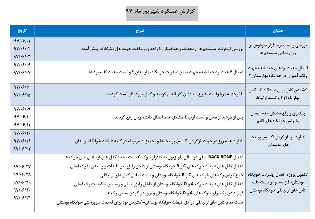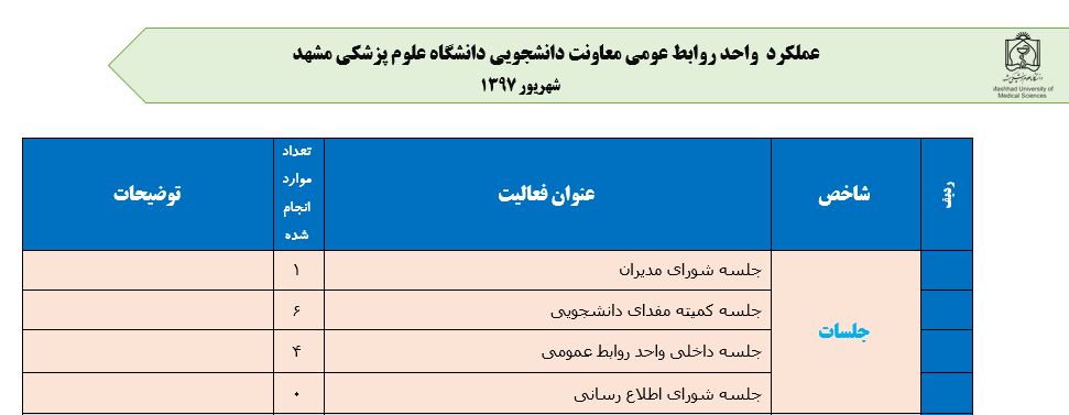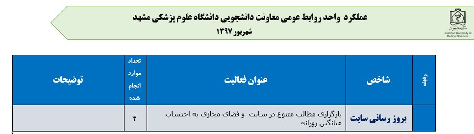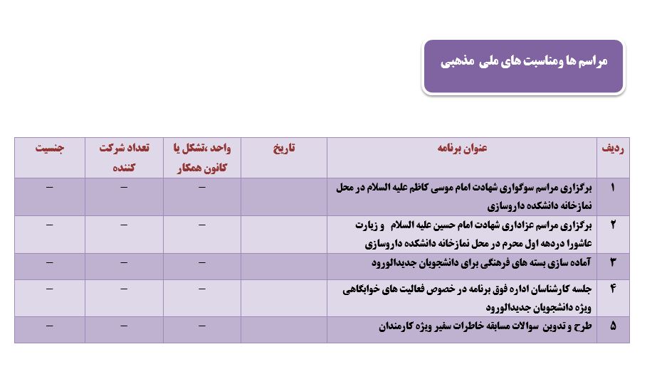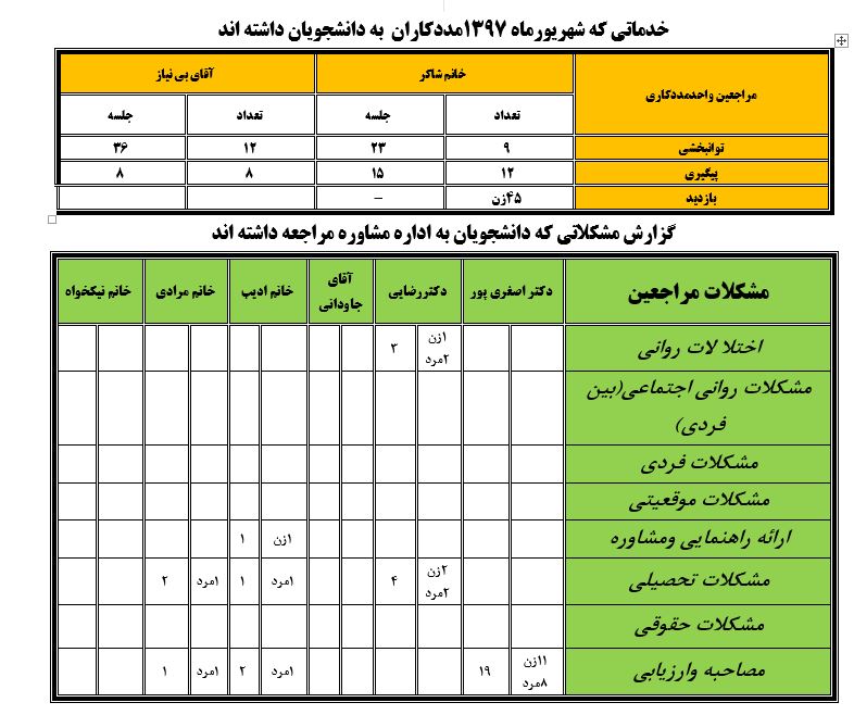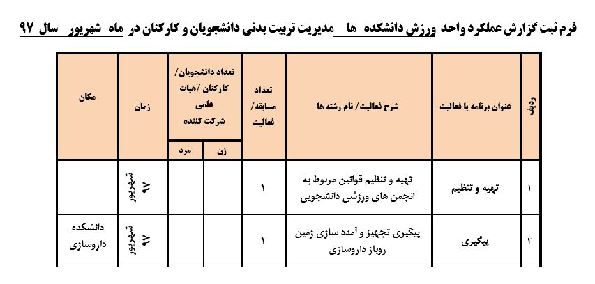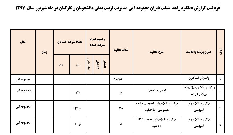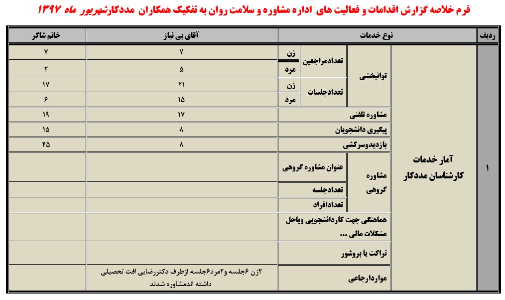 جعفریان مریم گزارش 97 29 شهریور 1397 29 شهریور 1397 بازدید: 546 امتیاز: ( 0 Rating ) شهریور 97 امتیاز کاربران لطفا رای دهید رای 1 رای 2 رای 3 رای 4 رای 5 مدیریت دانشجویی عملکرد اداره رفــاه عملکرد اداره تغذیه : تعداد کل پرس غذای توزیع شده اداره خوابگاه: گزارش عملکرد مدیریت فرهنگی اداره امور فرهنگی دانشجویان و کارکنان دبیرخانه نشریات دبیرخانه شورای فرهنگی دبیرخانه جشنواره فرهنگی دبیرخانه کانون های فرهنگی دبیرخانه تشکل های دانشجویی اداره فوق برنامه فعالیت هـای فـرهنگـی مراسمات و مناسبت های ملی مذهبی فعالیت های مرتبط با خوابگاه اداره توسعه فعالیت های قرآن و عترت(ع) دانشجویان و کارکنان پژوهشــی آمـوزشــی حـوزه مناسبت هــا کانون قرآن و عتـرت بیست و سومین جشنواره قرآن و عترت دانشگاه های علوم پزشکی مدیریت تربیت بدنی تعداد استفاده کنندگان از مجموعه آبی دفتر مدیریت تربیت بدنی مجموعه آبی شهید شادیفر فوق برنامه قهرمانی دانشجویان پسر ورزش کارکنان ورزش همگانی واحد صدور کارت ورزش دانشکده ها واحد آمار و ارزشیابی مشاوره و سلامت روان خلاصه گزارش اقدامات و فعاليت هاي اداره مشاوره و سلامت روان به تفکیک همکاران روانشناس فعالیتهای قابل ذکر همکاران کارگاهها ونشست های آموزشی همکاران گزارش اقدامات و فعاليت هاي اداره مشاوره و سلامت روان به تفکیک همکاران مددکار خدماتی که مددکاران به دانشجویان داشته اند شورای انضباطی فعالیت های شورای انضباطی دانشجویان روابط عمومی تدوین اهداف اجرایی توانمندسازی مصاحبه های حضوری در طی مراسمات مختلف اطلاع رسانی تبلیغات محیطی همایش ها سمعی و بصری جلسات برگزار شده بروز رسانی سایت مفدا و معاونت فرهنگی دانشجویی امور پشتیبانی پشتیبانی و خدمات عمومــی انبــار فضای سبــز تــدارکات نقلیــه سایــر واحــدهـا دبیـرخانـه فناوری اطلاعات پشتیبانی های عمـومی نرم افـزار شبکه قبلی بعدی