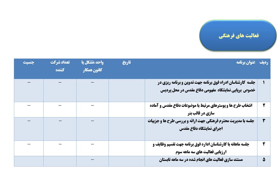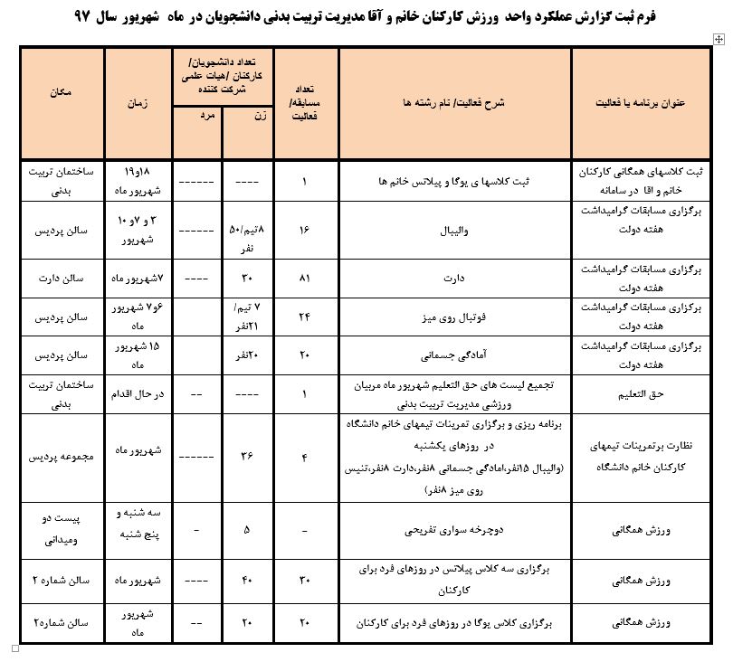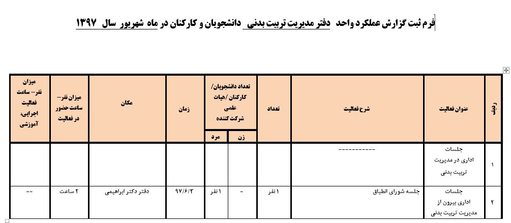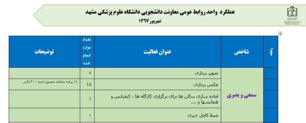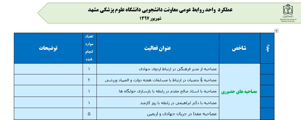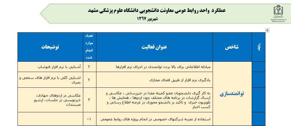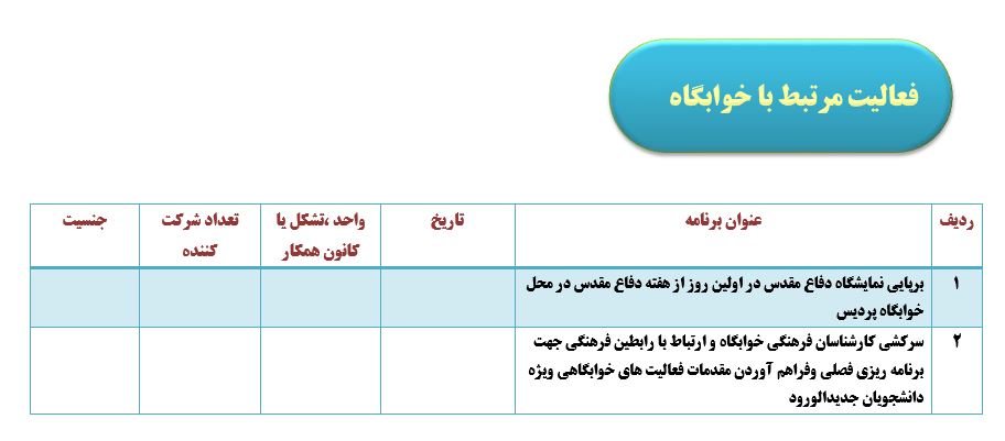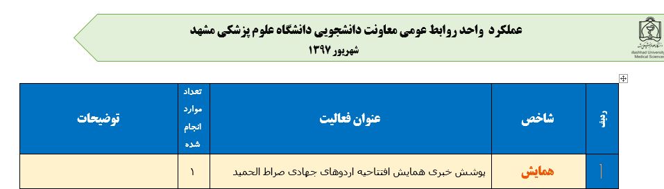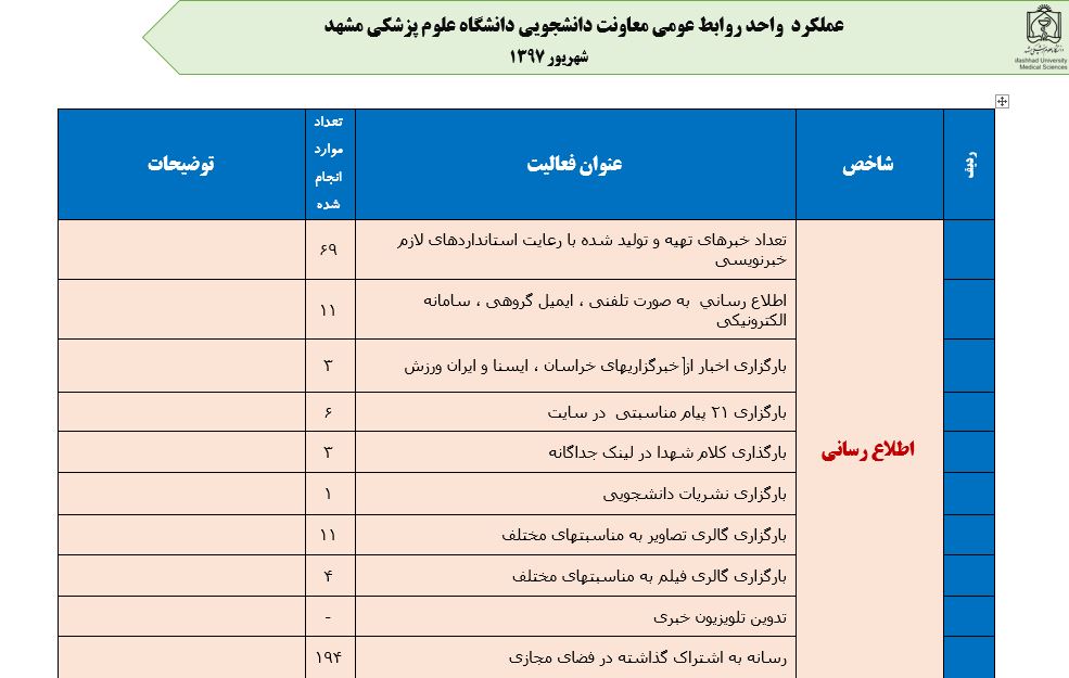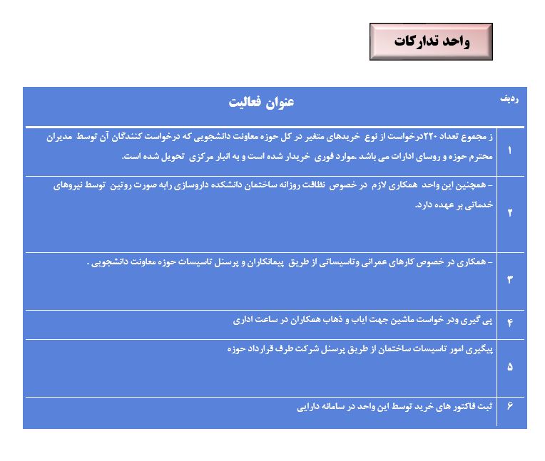 جعفریان مریم گزارش 97 29 شهریور 1397 29 شهریور 1397 بازدید: 546 امتیاز: ( 0 Rating ) شهریور 97 امتیاز کاربران لطفا رای دهید رای 1 رای 2 رای 3 رای 4 رای 5 مدیریت دانشجویی عملکرد اداره رفــاه عملکرد اداره تغذیه : تعداد کل پرس غذای توزیع شده اداره خوابگاه: گزارش عملکرد مدیریت فرهنگی اداره امور فرهنگی دانشجویان و کارکنان دبیرخانه نشریات دبیرخانه شورای فرهنگی دبیرخانه جشنواره فرهنگی دبیرخانه کانون های فرهنگی دبیرخانه تشکل های دانشجویی اداره فوق برنامه فعالیت هـای فـرهنگـی مراسمات و مناسبت های ملی مذهبی فعالیت های مرتبط با خوابگاه اداره توسعه فعالیت های قرآن و عترت(ع) دانشجویان و کارکنان پژوهشــی آمـوزشــی حـوزه مناسبت هــا کانون قرآن و عتـرت بیست و سومین جشنواره قرآن و عترت دانشگاه های علوم پزشکی مدیریت تربیت بدنی تعداد استفاده کنندگان از مجموعه آبی دفتر مدیریت تربیت بدنی مجموعه آبی شهید شادیفر فوق برنامه قهرمانی دانشجویان پسر ورزش کارکنان ورزش همگانی واحد صدور کارت ورزش دانشکده ها واحد آمار و ارزشیابی مشاوره و سلامت روان خلاصه گزارش اقدامات و فعاليت هاي اداره مشاوره و سلامت روان به تفکیک همکاران روانشناس فعالیتهای قابل ذکر همکاران کارگاهها ونشست های آموزشی همکاران گزارش اقدامات و فعاليت هاي اداره مشاوره و سلامت روان به تفکیک همکاران مددکار خدماتی که مددکاران به دانشجویان داشته اند شورای انضباطی فعالیت های شورای انضباطی دانشجویان روابط عمومی تدوین اهداف اجرایی توانمندسازی مصاحبه های حضوری در طی مراسمات مختلف اطلاع رسانی تبلیغات محیطی همایش ها سمعی و بصری جلسات برگزار شده بروز رسانی سایت مفدا و معاونت فرهنگی دانشجویی امور پشتیبانی پشتیبانی و خدمات عمومــی انبــار فضای سبــز تــدارکات نقلیــه سایــر واحــدهـا دبیـرخانـه فناوری اطلاعات پشتیبانی های عمـومی نرم افـزار شبکه قبلی بعدی