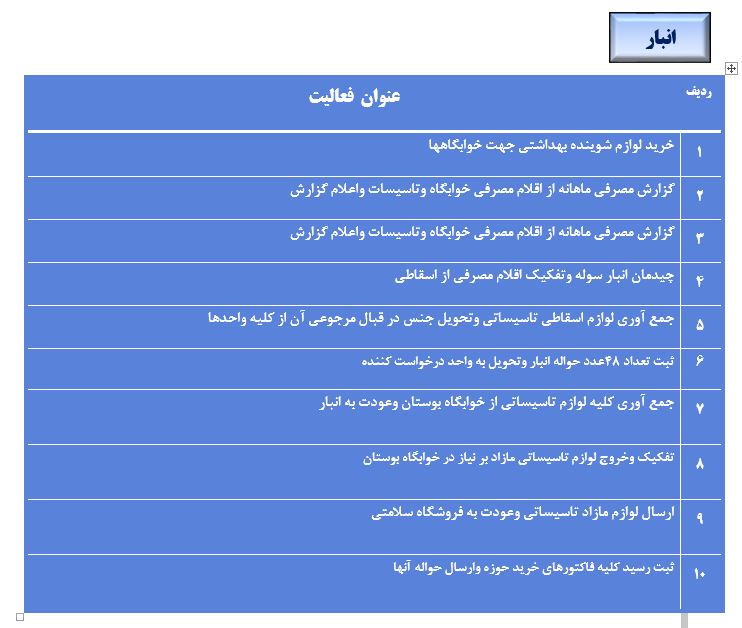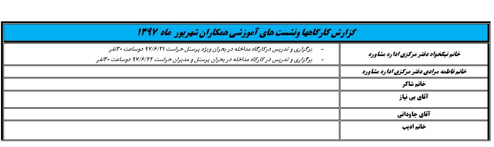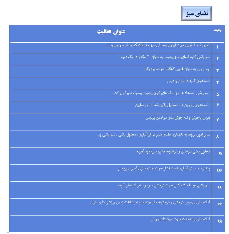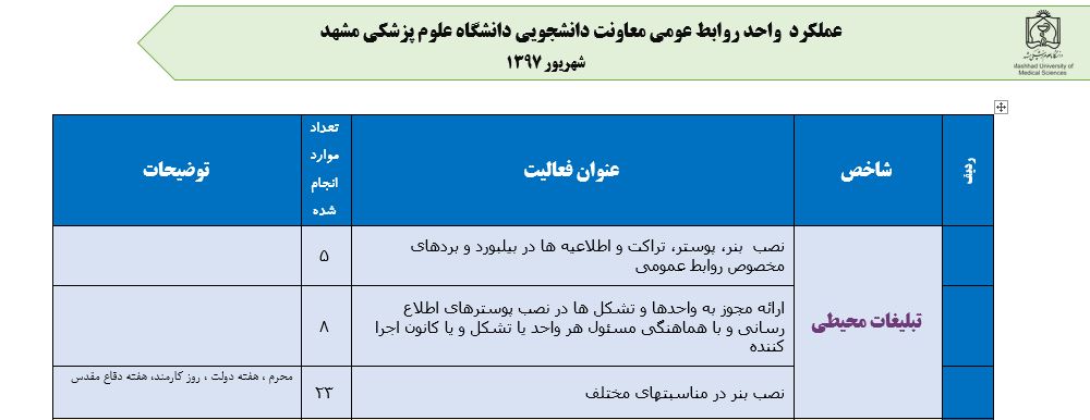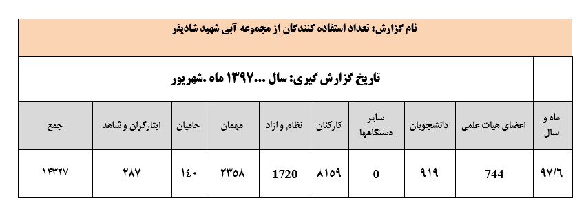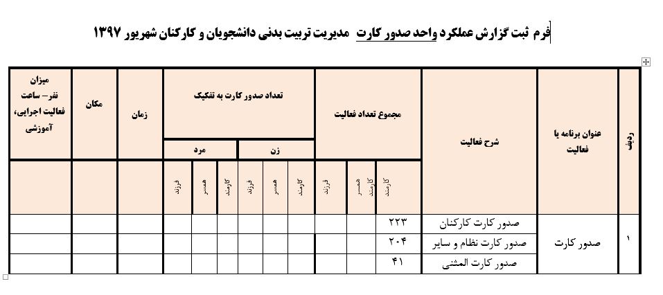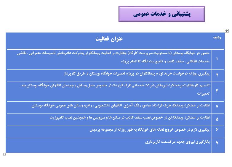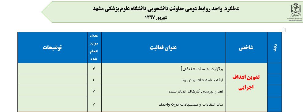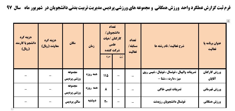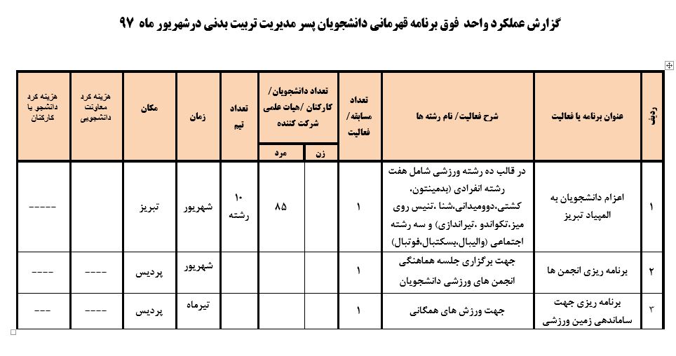 جعفریان مریم گزارش 97 29 شهریور 1397 29 شهریور 1397 بازدید: 546 امتیاز: ( 0 Rating ) شهریور 97 امتیاز کاربران لطفا رای دهید رای 1 رای 2 رای 3 رای 4 رای 5 مدیریت دانشجویی عملکرد اداره رفــاه عملکرد اداره تغذیه : تعداد کل پرس غذای توزیع شده اداره خوابگاه: گزارش عملکرد مدیریت فرهنگی اداره امور فرهنگی دانشجویان و کارکنان دبیرخانه نشریات دبیرخانه شورای فرهنگی دبیرخانه جشنواره فرهنگی دبیرخانه کانون های فرهنگی دبیرخانه تشکل های دانشجویی اداره فوق برنامه فعالیت هـای فـرهنگـی مراسمات و مناسبت های ملی مذهبی فعالیت های مرتبط با خوابگاه اداره توسعه فعالیت های قرآن و عترت(ع) دانشجویان و کارکنان پژوهشــی آمـوزشــی حـوزه مناسبت هــا کانون قرآن و عتـرت بیست و سومین جشنواره قرآن و عترت دانشگاه های علوم پزشکی مدیریت تربیت بدنی تعداد استفاده کنندگان از مجموعه آبی دفتر مدیریت تربیت بدنی مجموعه آبی شهید شادیفر فوق برنامه قهرمانی دانشجویان پسر ورزش کارکنان ورزش همگانی واحد صدور کارت ورزش دانشکده ها واحد آمار و ارزشیابی مشاوره و سلامت روان خلاصه گزارش اقدامات و فعاليت هاي اداره مشاوره و سلامت روان به تفکیک همکاران روانشناس فعالیتهای قابل ذکر همکاران کارگاهها ونشست های آموزشی همکاران گزارش اقدامات و فعاليت هاي اداره مشاوره و سلامت روان به تفکیک همکاران مددکار خدماتی که مددکاران به دانشجویان داشته اند شورای انضباطی فعالیت های شورای انضباطی دانشجویان روابط عمومی تدوین اهداف اجرایی توانمندسازی مصاحبه های حضوری در طی مراسمات مختلف اطلاع رسانی تبلیغات محیطی همایش ها سمعی و بصری جلسات برگزار شده بروز رسانی سایت مفدا و معاونت فرهنگی دانشجویی امور پشتیبانی پشتیبانی و خدمات عمومــی انبــار فضای سبــز تــدارکات نقلیــه سایــر واحــدهـا دبیـرخانـه فناوری اطلاعات پشتیبانی های عمـومی نرم افـزار شبکه قبلی بعدی