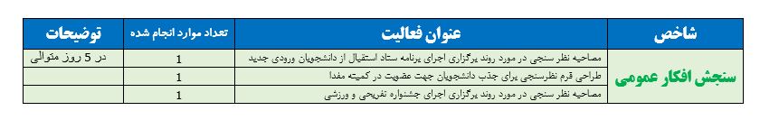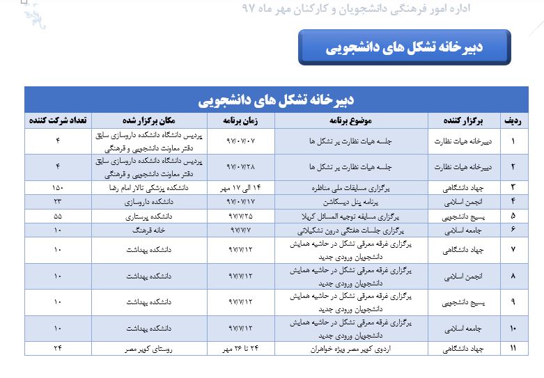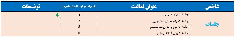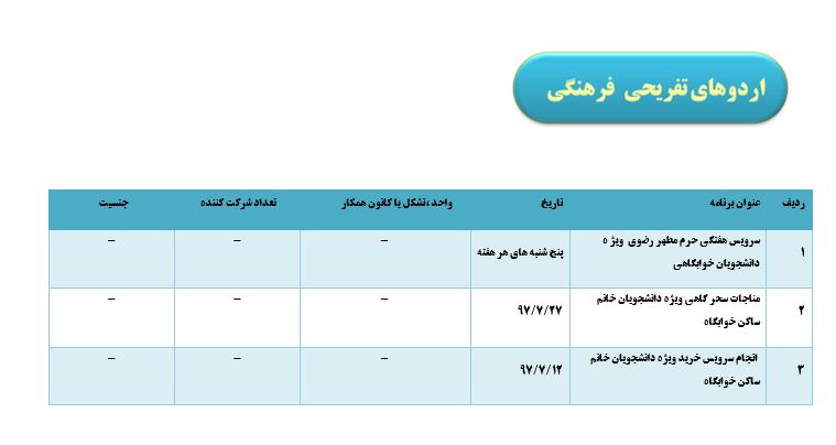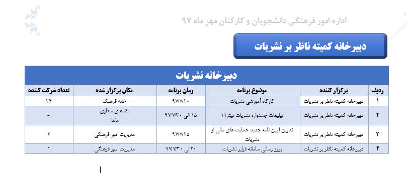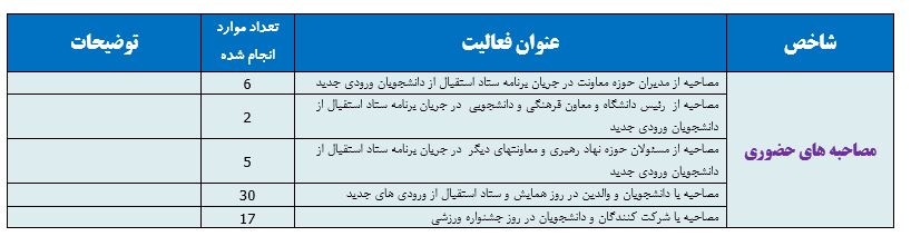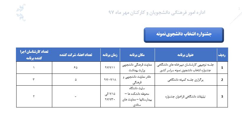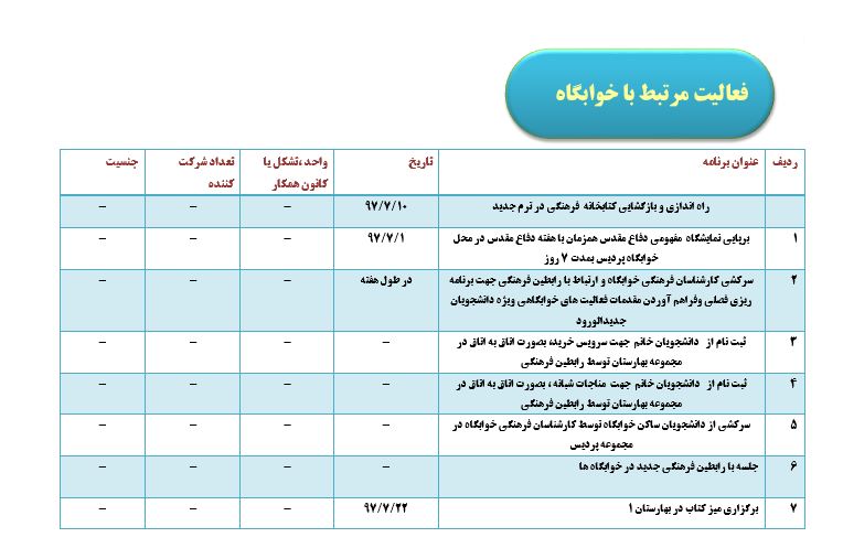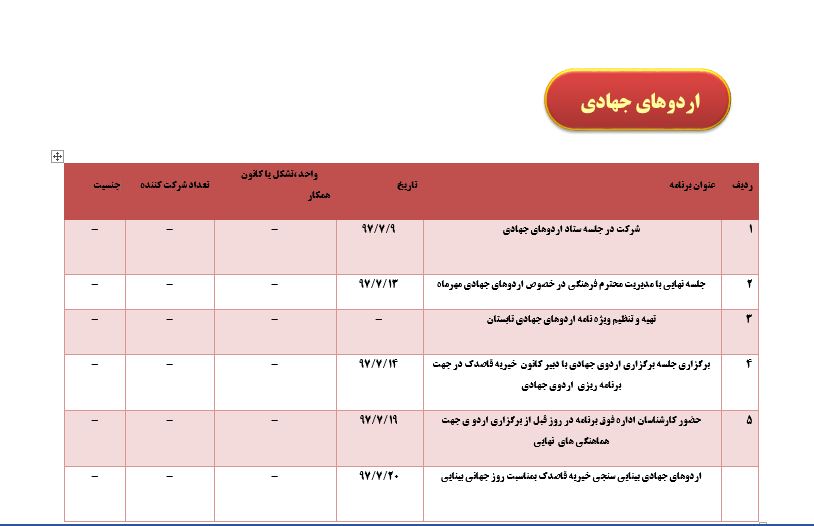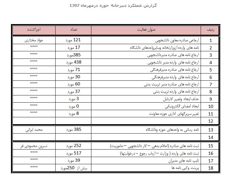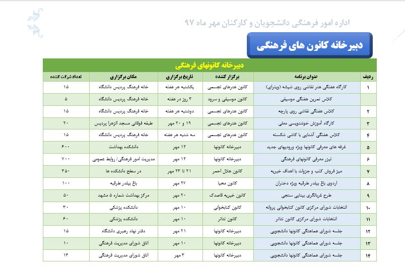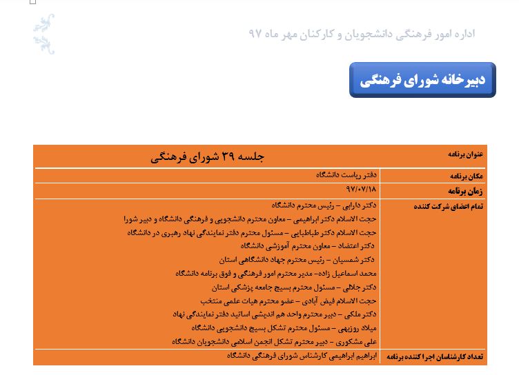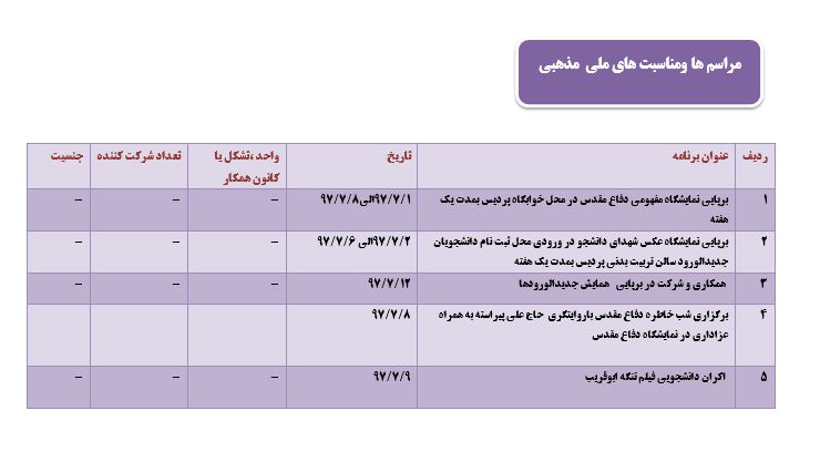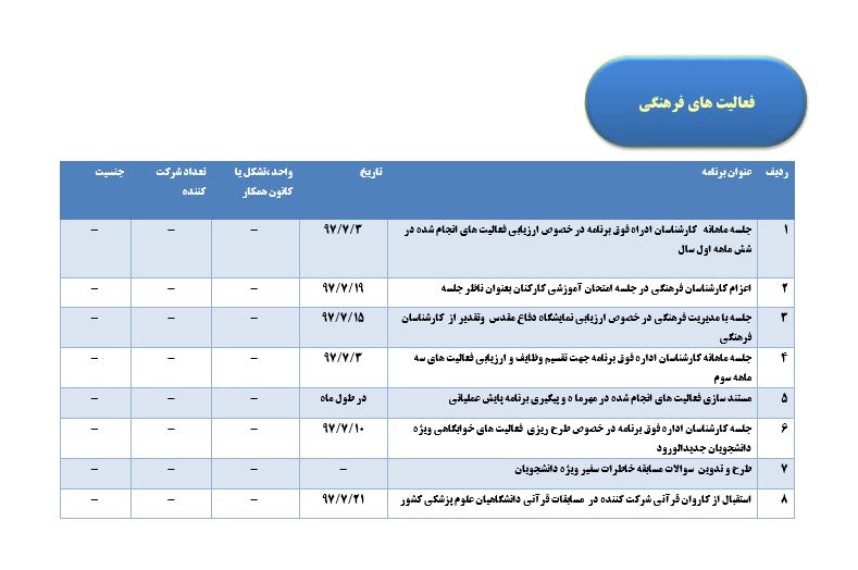 جعفریان مریم گزارش 97 30 مهر 1397 30 مهر 1397 بازدید: 549 امتیاز: ( 0 Rating ) مهر 97 امتیاز کاربران لطفا رای دهید رای 1 رای 2 رای 3 رای 4 رای 5 مدیریت دانشجویی √ عملکرد اداره رفــاه √ عملکرد اداره تغذیه √ اداره خوابگاه مدیریت فرهنگی اداره امور فرهنگی دانشجویان و کارکنان √ دبیرخانه نشریات √دبیرخانه شورای فرهنگی √ دبیرخانه کانون های فرهنگی √ دبیرخانه تشکل های دانشجویی √ جشنواره انتخاب دانشجوی نمونه اداره فوق برنامه √ فعالیت هـای فـرهنگـی √ مراسمات و مناسبت های ملی مذهبی √ فعالیت های مرتبط با خوابگاه √ اردوهای جهادی √اردوهای تفریحی اداره توسعه فعالیت های قرآن و عترت(ع) دانشجویان و کارکنان × پژوهشــی × آمـوزشــی × حـوزه مناسبت هــا × کانون قرآن و عتـرت × بیست و سومین جشنواره قرآن و عترت دانشگاه های علوم پزشکی مدیریت تربیت بدنی √ تعداد استفاده کنندگان از مجموعه آبی √ دفتر مدیریت تربیت بدنی √ مجموعه آبی شهید شادیفر √ فوق برنامه قهرمانی دانشجویان پسر √ ورزش کارکنان √ ورزش همگانی √ واحد صدور کارت √ ورزش دانشکده ها √ واحد آمار و ارزشیابی مشاوره و سلامت روان √ خلاصه گزارش اقدامات و فعاليت هاي اداره مشاوره و سلامت روان به تفکیک همکاران روانشناس √ فعالیتهای قابل ذکر همکاران √ کارگاهها ونشست های آموزشی همکاران √ گزارش اقدامات و فعاليت هاي اداره مشاوره و سلامت روان به تفکیک همکاران مددکار √ گزارش مشکلات دانشجویان به تشخیص روانشناسان اداره مشاوره شورای انضباطی √ فعالیت های شورای انضباطی دانشجویان روابط عمومی √تدوین اهداف اجرایی √ توانمندسازی √سنجش افکار عمومی √ مصاحبه های حضوری در طی مراسمات مختلف √ اطلاع رسانی √ تبلیغات محیطی √ همایش ها √ سمعی و بصری √ جلسات برگزار شده √ بروز رسانی سایت مفدا و معاونت فرهنگی دانشجویی امور پشتیبانی × پشتیبانی و خدمات عمومــی × انبــار × فضای سبــز × تــدارکات × نقلیــه سایــر واحــدهـا √ دبیـرخانـه فناوری اطلاعات × پشتیبانی های عمـومی × نرم افـزار × شبکه قبلی بعدی