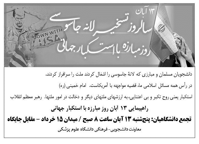 معاونت دانشجویی فرهنگی دانشگاه علوم پزشکی مشهد از دانشگاهیان عزیز جهت حضور در راهپیمایی 13 آبان دعوت بعمل می آورد.
