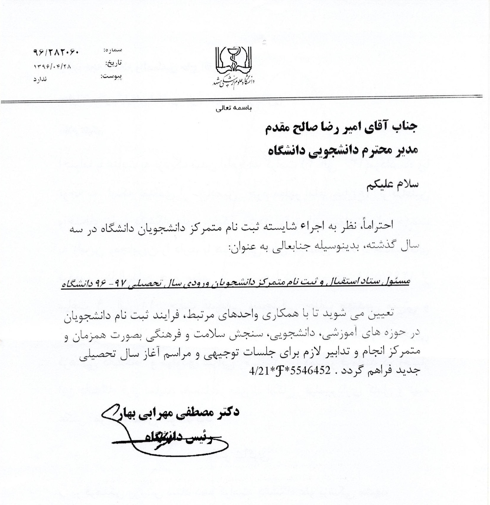 به گزارش کارشناس خبري حوزه معاونت دانشجويي فرهنگي دانشگاه علوم پزشکي مشهد، با حکم دکتر مهرابي بهار ، رييس دانشگاه علوم پزشکي مشهد، امير رضا صالح مقدم مدير دانشجويي دانشگاه، به عنوان مسئول ستاد استقبال و ثبت نام متمرکز دانشجويان ورودي سال تحصيلي 97-96 تعيين گرديد.