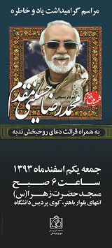 مراسم گراميداشت ياد و خاطره سردار بسيجي مدافع حرم شهيد حاج محمدرضا حسيني مقدم روز جمعه اول اسفند ماه 93 در مسجد حضرت زهرا (س) کوي پرديس علوم پزشکي مشهد برگزار مي شود.