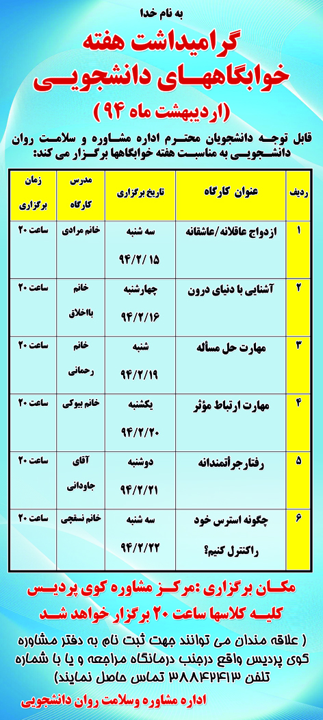 برگزاری کارگاه های مهارت های زندگی به مناسبت هفته خوابگاه ها به مناسبت گرامیداشت هفته خوابگاه ها کارگاه های مهارت های زندگی توسط اداره مشاوره و سلامت روان معاونت دانشجویی فرهنگی دانشگاه علوم پزشکی مشهدبرگزار می گردد . به گزارش روابط عمومی معاونت دانشجویی فرهنگی؛ 6 کارگاه با عناوین ازدواج عاقلانه/عاشقانه (سه شنبه 15/2/94)، آشنایی با دنیای درون (چهارشنبه 16/2/94)، مهارت حل مسأله (شنبه 19/2/94)، مهارت ارتباط مؤثر (یکشنبه 20/2/94)، رفتار جرأت مندانه (دوشنبه 21/2/94) و چگونه استرس خود را کنترل کنیم ؟(سه شنبه 22/2/94) به منظور ارتقاء مهارتهای زندگی دانشجویان ،در ساعت 20 تاریخ های اعلام شده در مرکز مشاوره کوی پردیس برگزار می گردد . دانشجویان علاقه مند می توانند جهت ثبت نام به دفتر مشاوره کوی پردیس مراجعه و یا با شماره 38842413 تماس حاصل نمایند . ![]() |