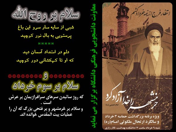 جعفریان مریم اخبار معاونت فرهنگی دانشجویی 07 خرداد 1394 07 خرداد 1394 بازدید: 399 امتیاز: ( 0 Rating ) مراسم بزرگداشت حماسه 3 خرداد و سالگرد ارتحال ملکوتی امام(ره) امتیاز کاربران لطفا رای دهید رای 1 رای 2 رای 3 رای 4 رای 5 مراسم بزرگداشت حماسه 3 خرداد و سالگرد ارتحال ملکوتی امام(ره) قبلی بعدی