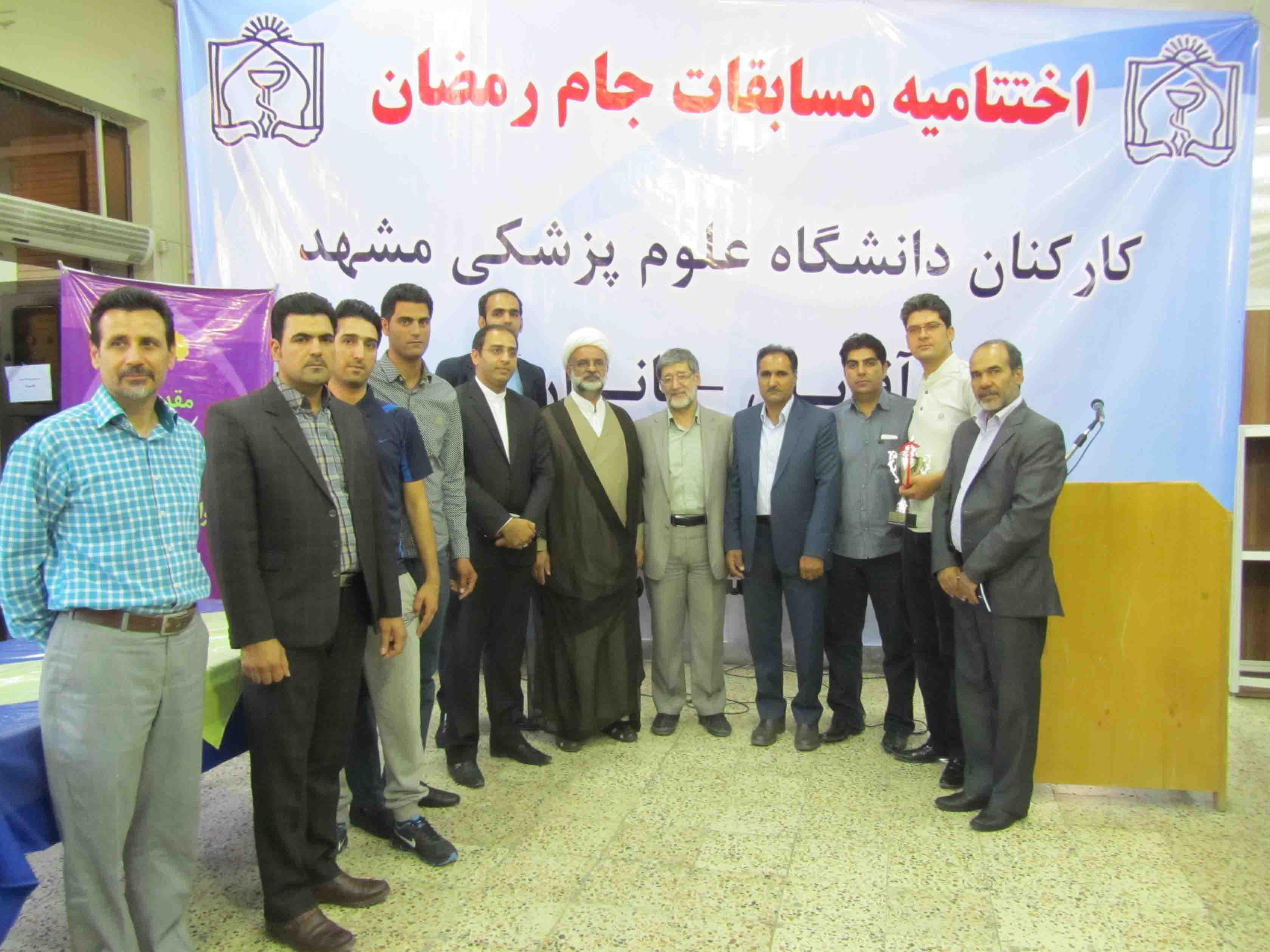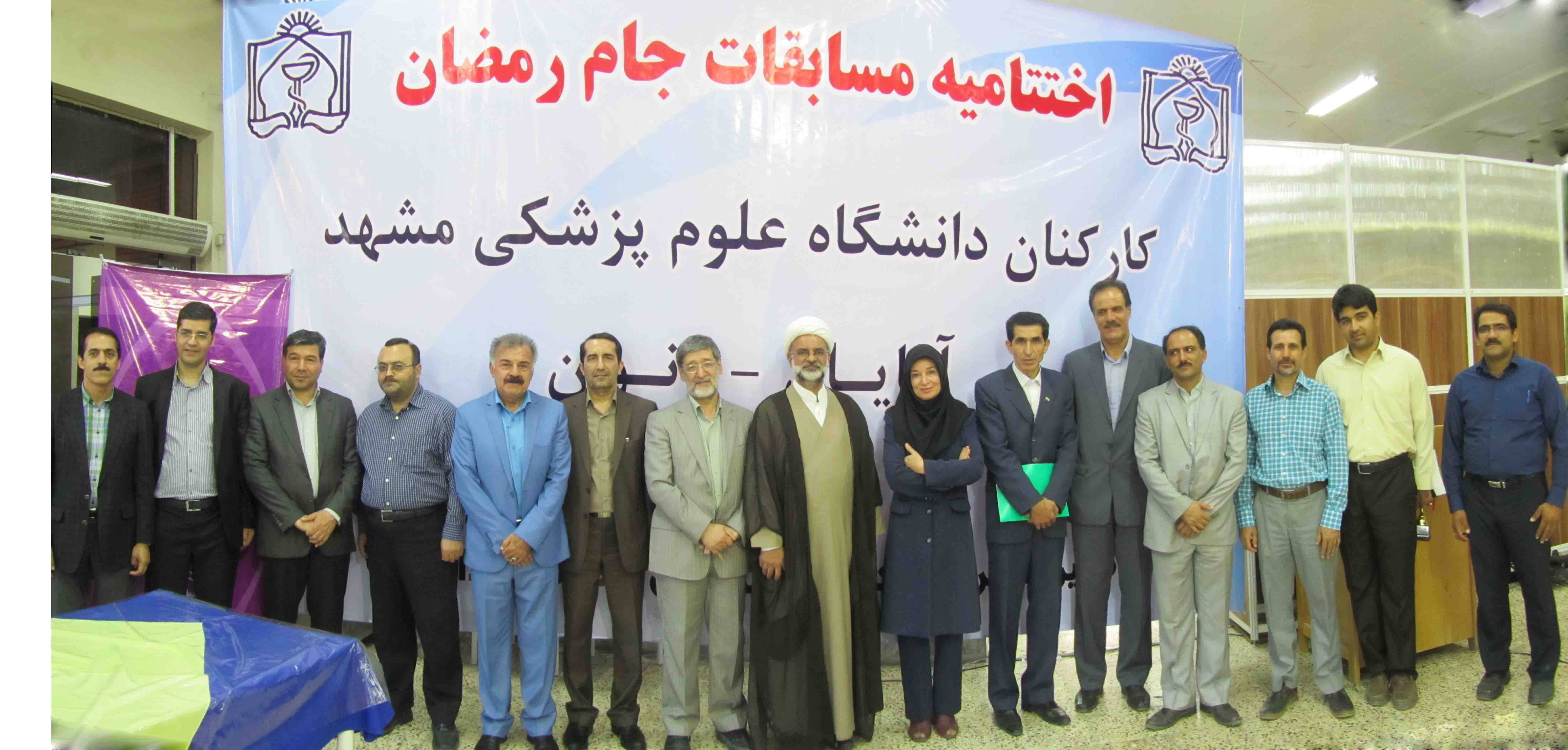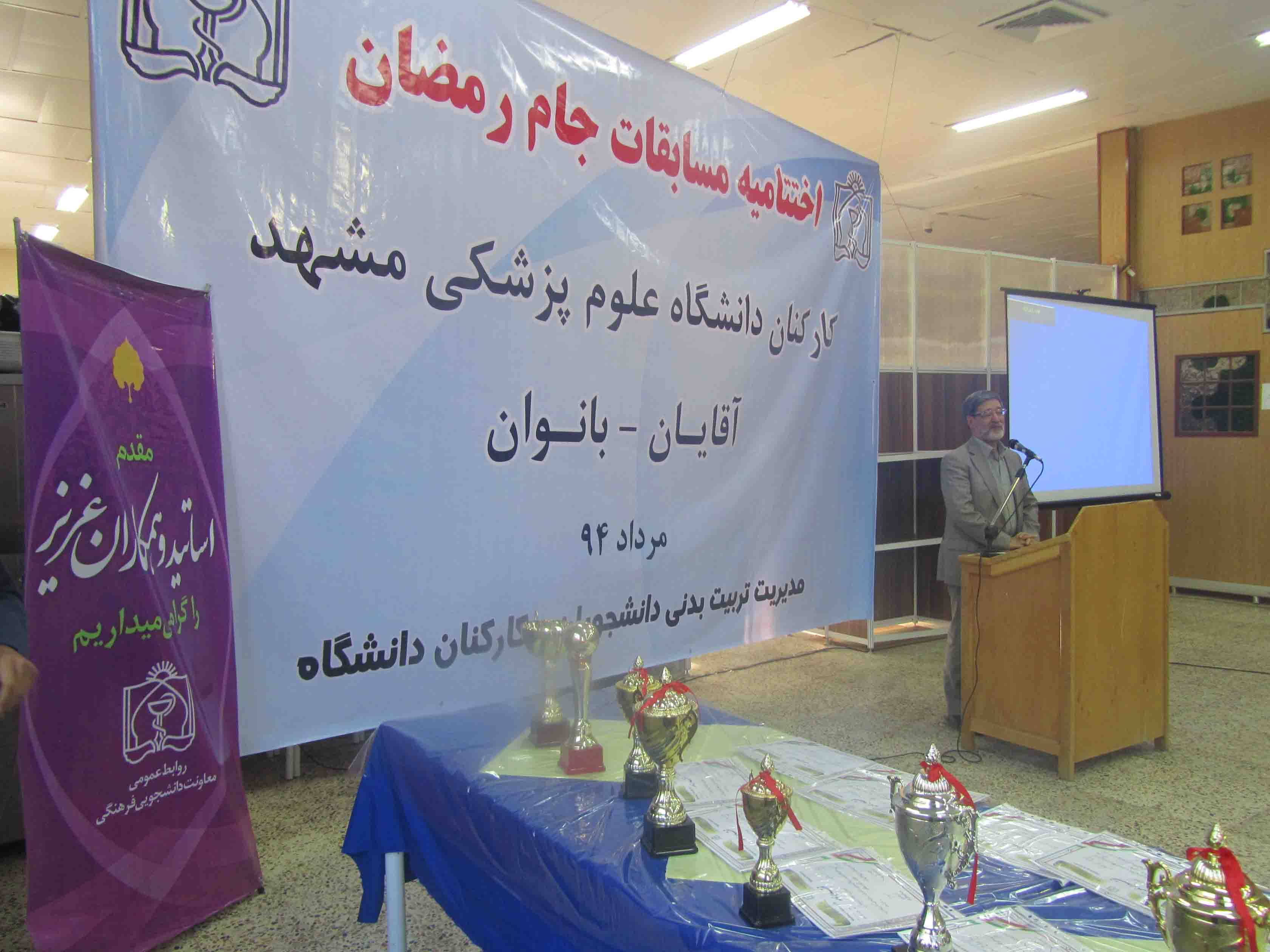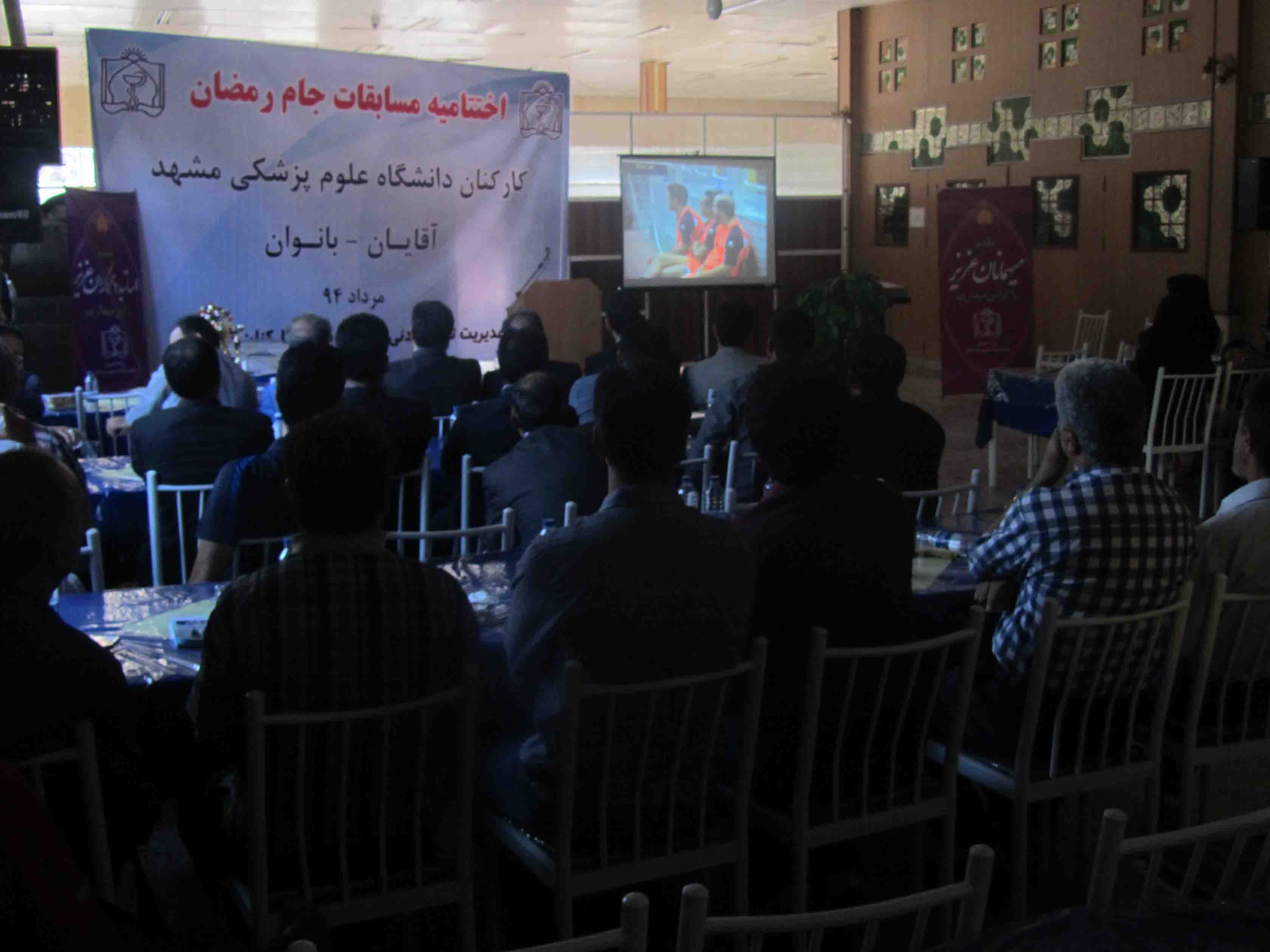 آئین اختتام جام رمضان 94 دانشگاه علوم پزشکی مشهد با حضور معاون توسعه مدیریت و منابع، معاون دانشجویی فرهنگی و جمعی از مدیران و مسئولین دانشگاه علوم پزشکی مشهد و همچنین نفرات وتیم های برتر این دوره از مسابقات برگزار شد .