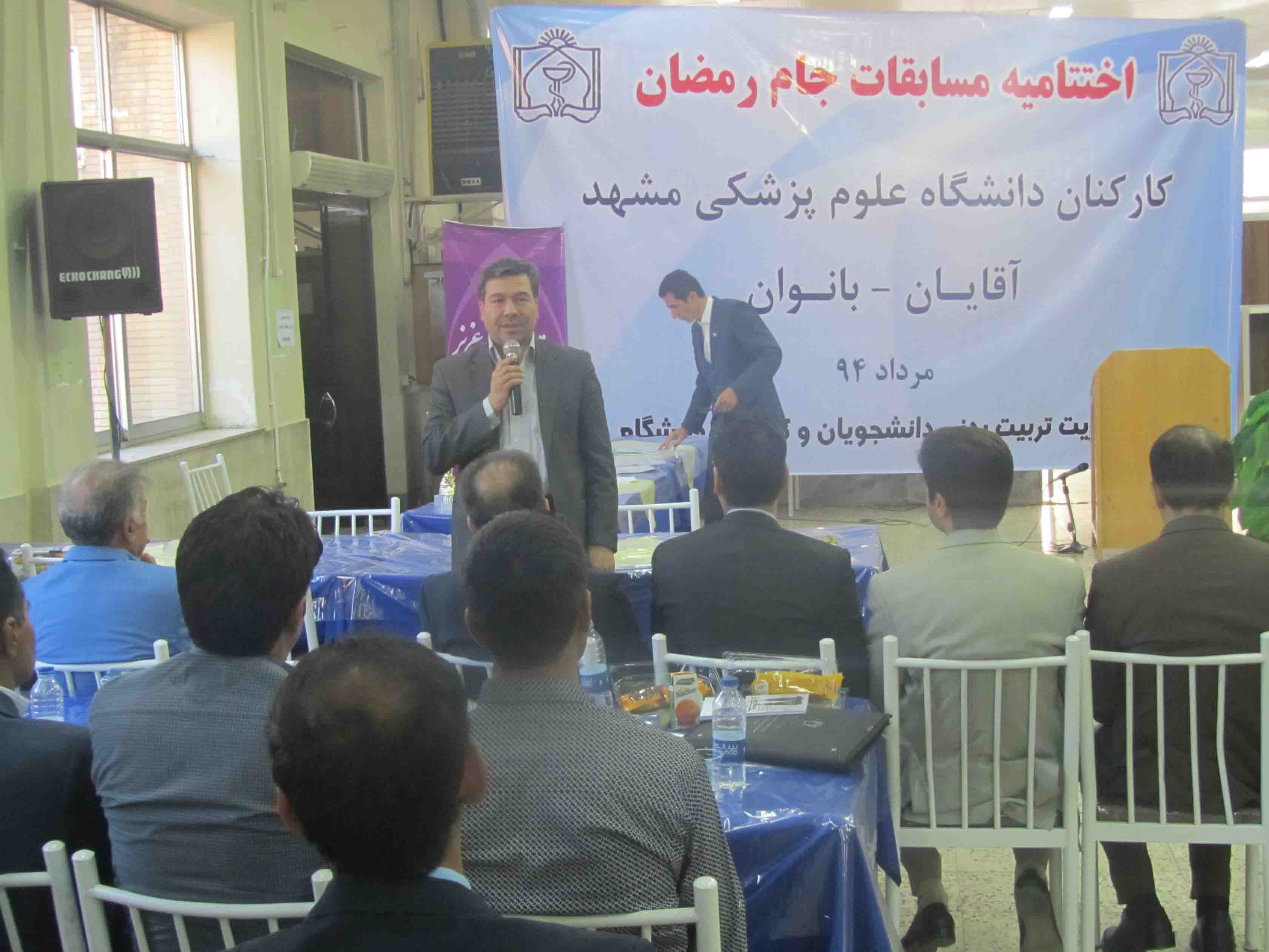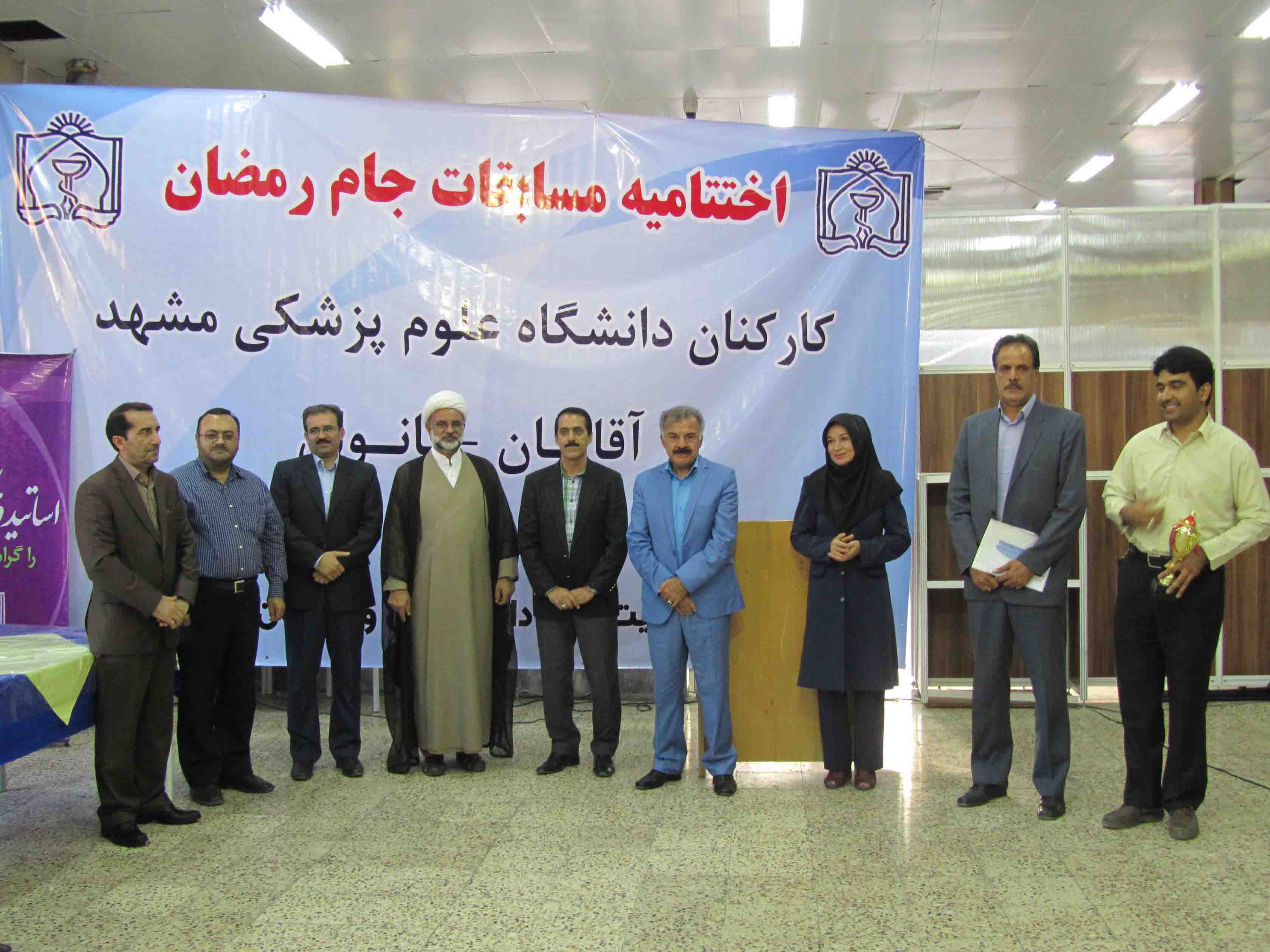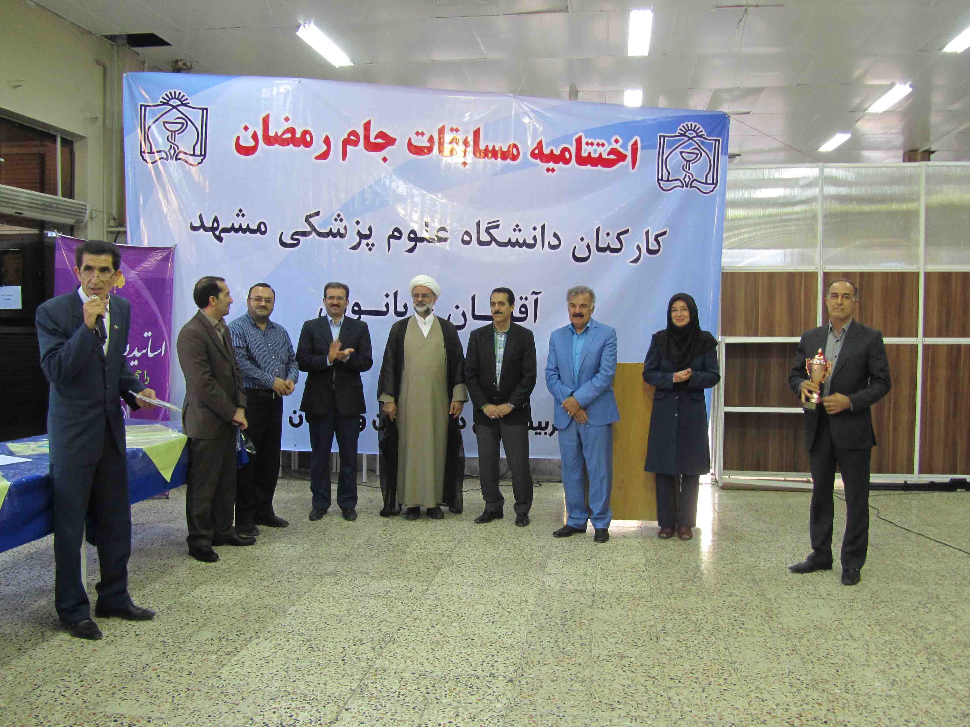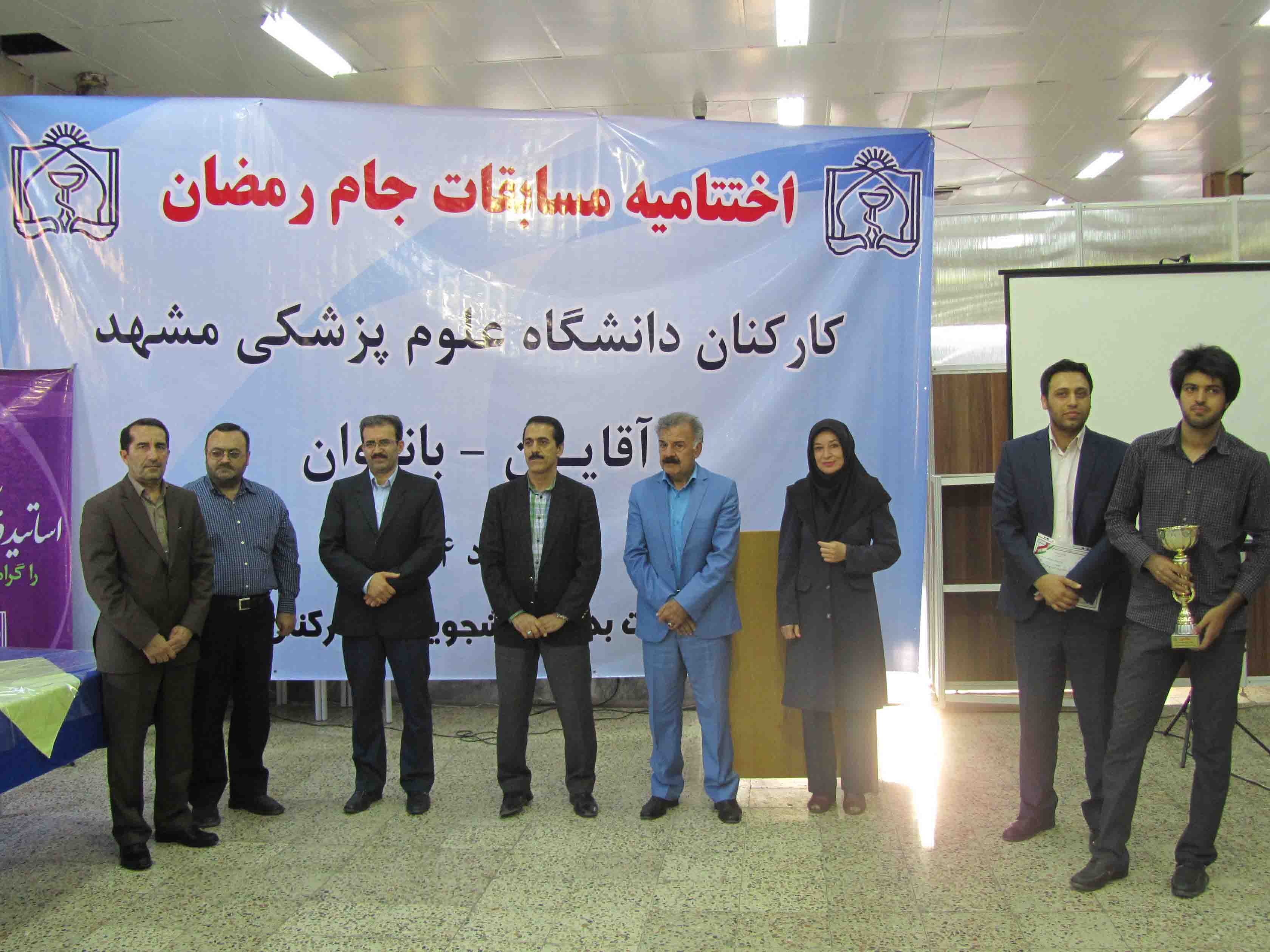 آئین اختتام جام رمضان 94 دانشگاه علوم پزشکی مشهد با حضور معاون توسعه مدیریت و منابع، معاون دانشجویی فرهنگی و جمعی از مدیران و مسئولین دانشگاه علوم پزشکی مشهد و همچنین نفرات وتیم های برتر این دوره از مسابقات برگزار شد .