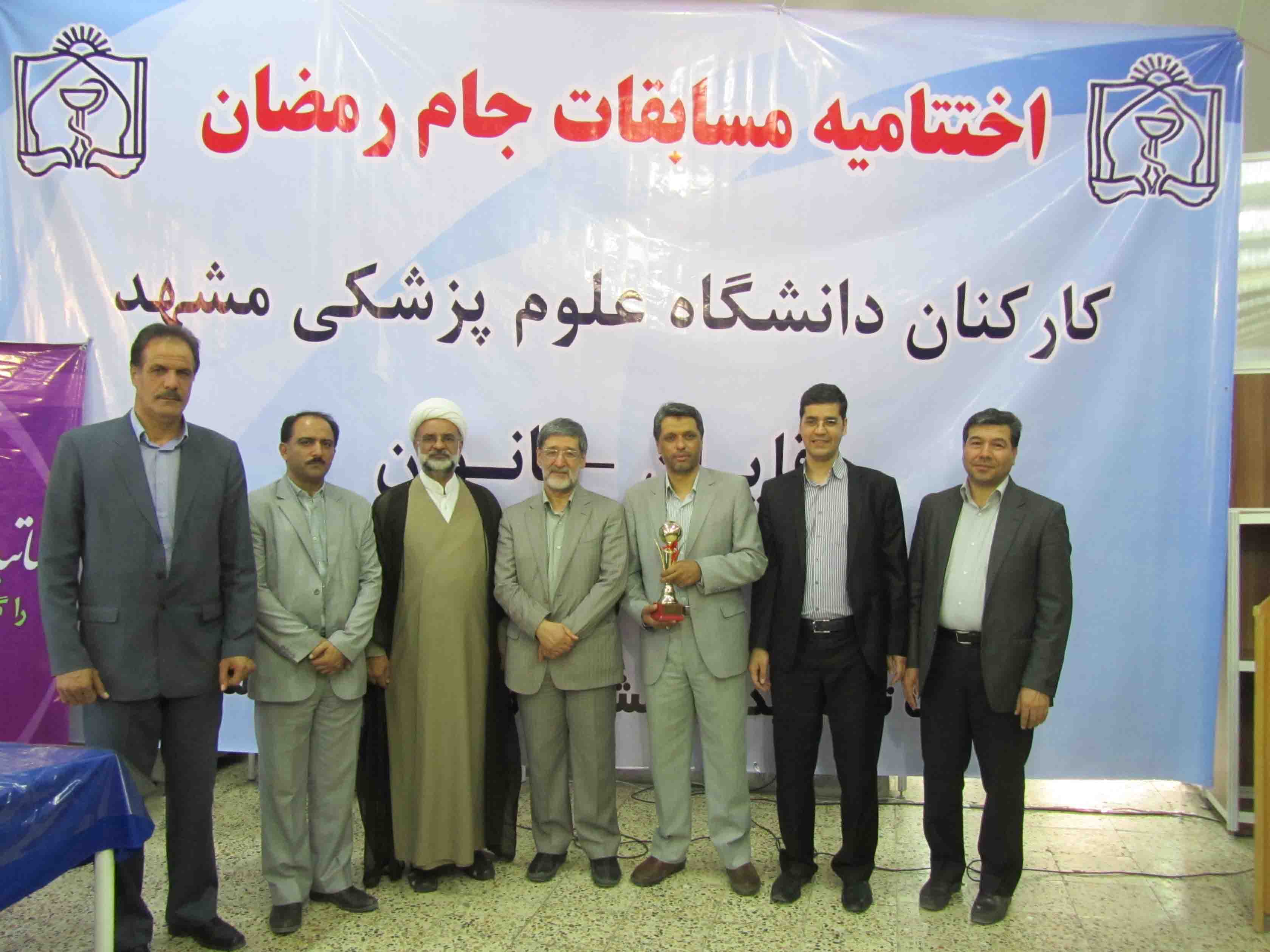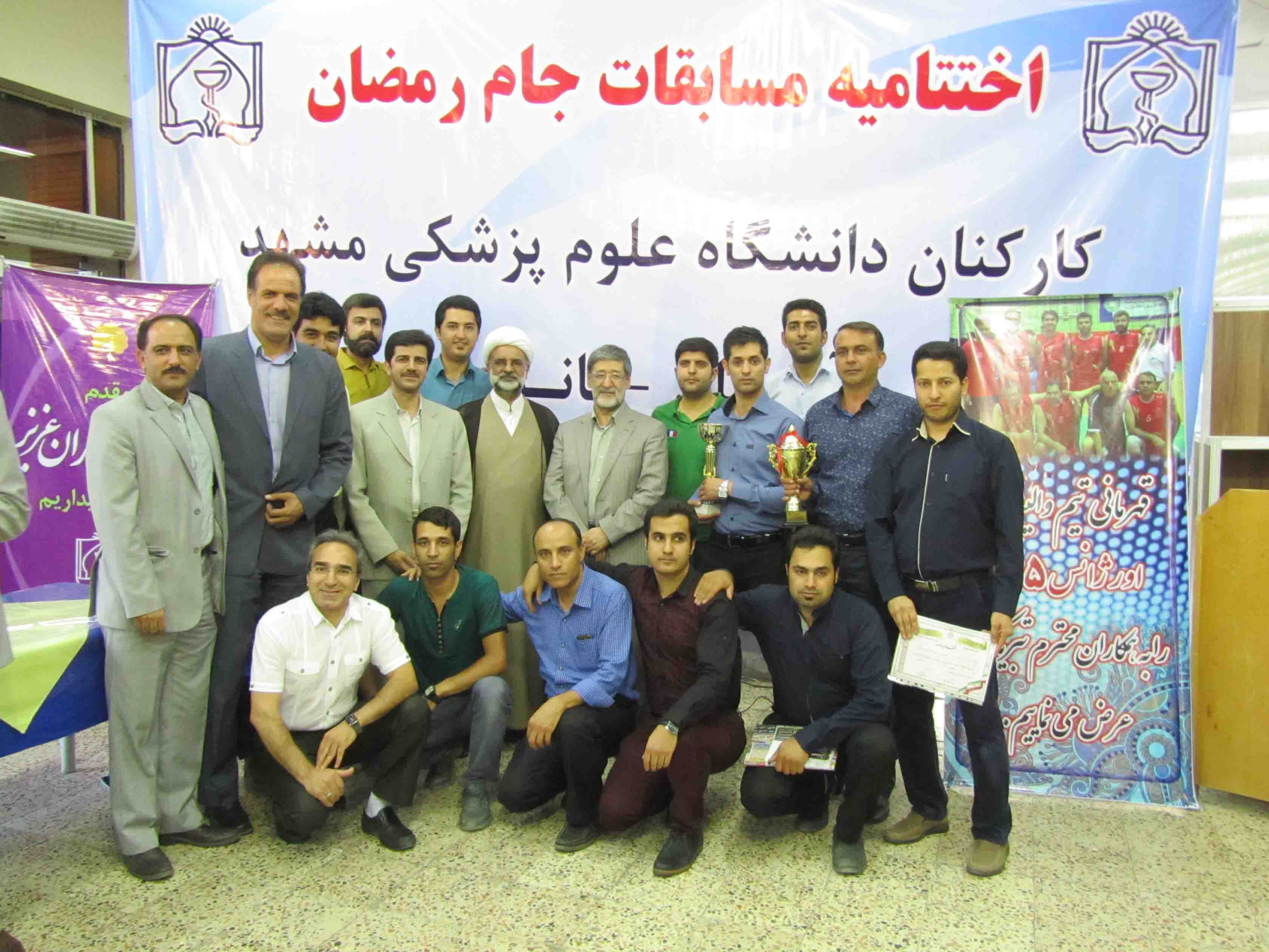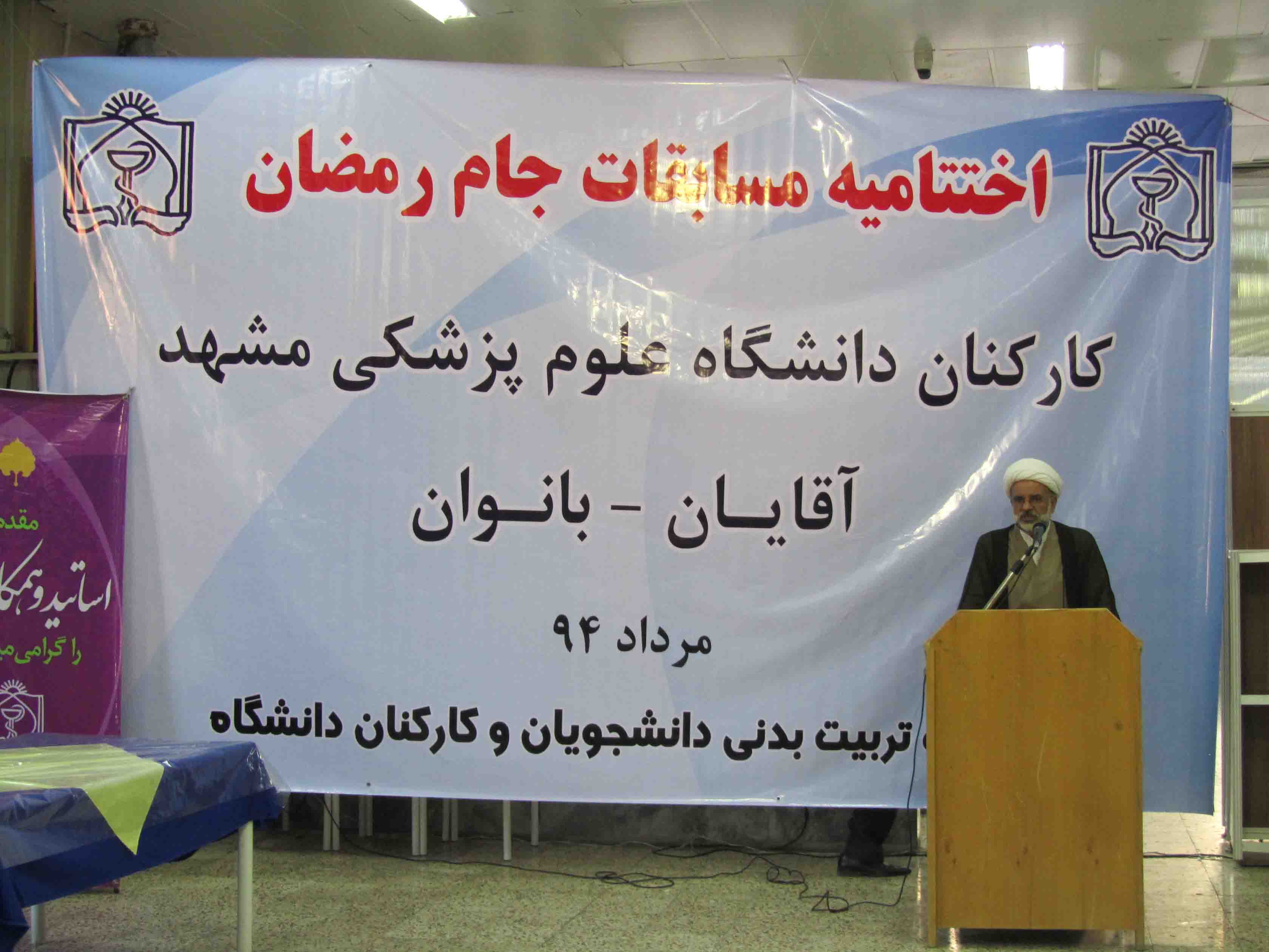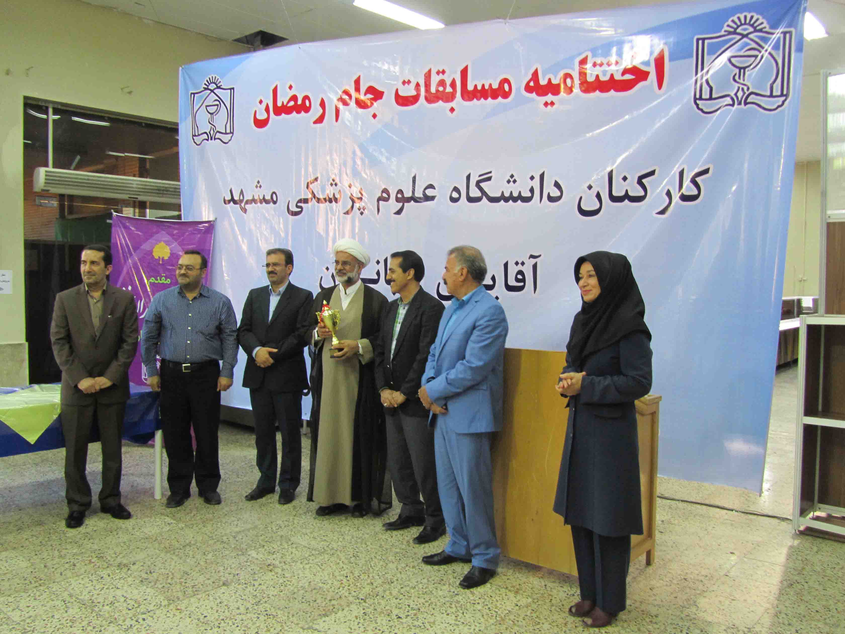 آئین اختتام جام رمضان 94 دانشگاه علوم پزشکی مشهد با حضور معاون توسعه مدیریت و منابع، معاون دانشجویی فرهنگی و جمعی از مدیران و مسئولین دانشگاه علوم پزشکی مشهد و همچنین نفرات وتیم های برتر این دوره از مسابقات برگزار شد .