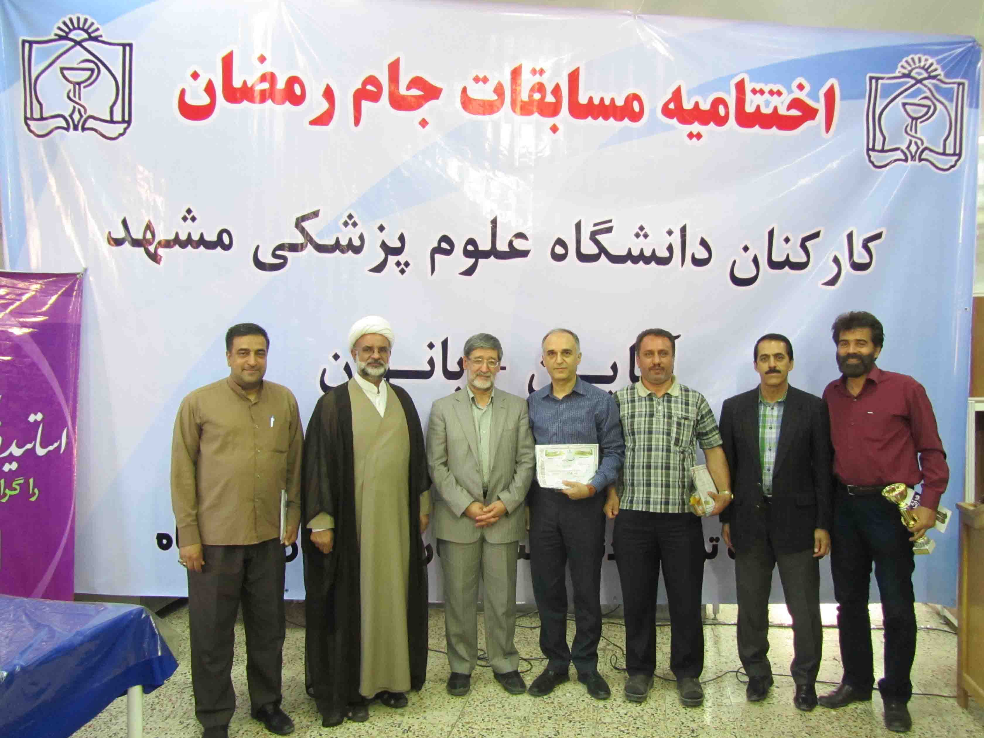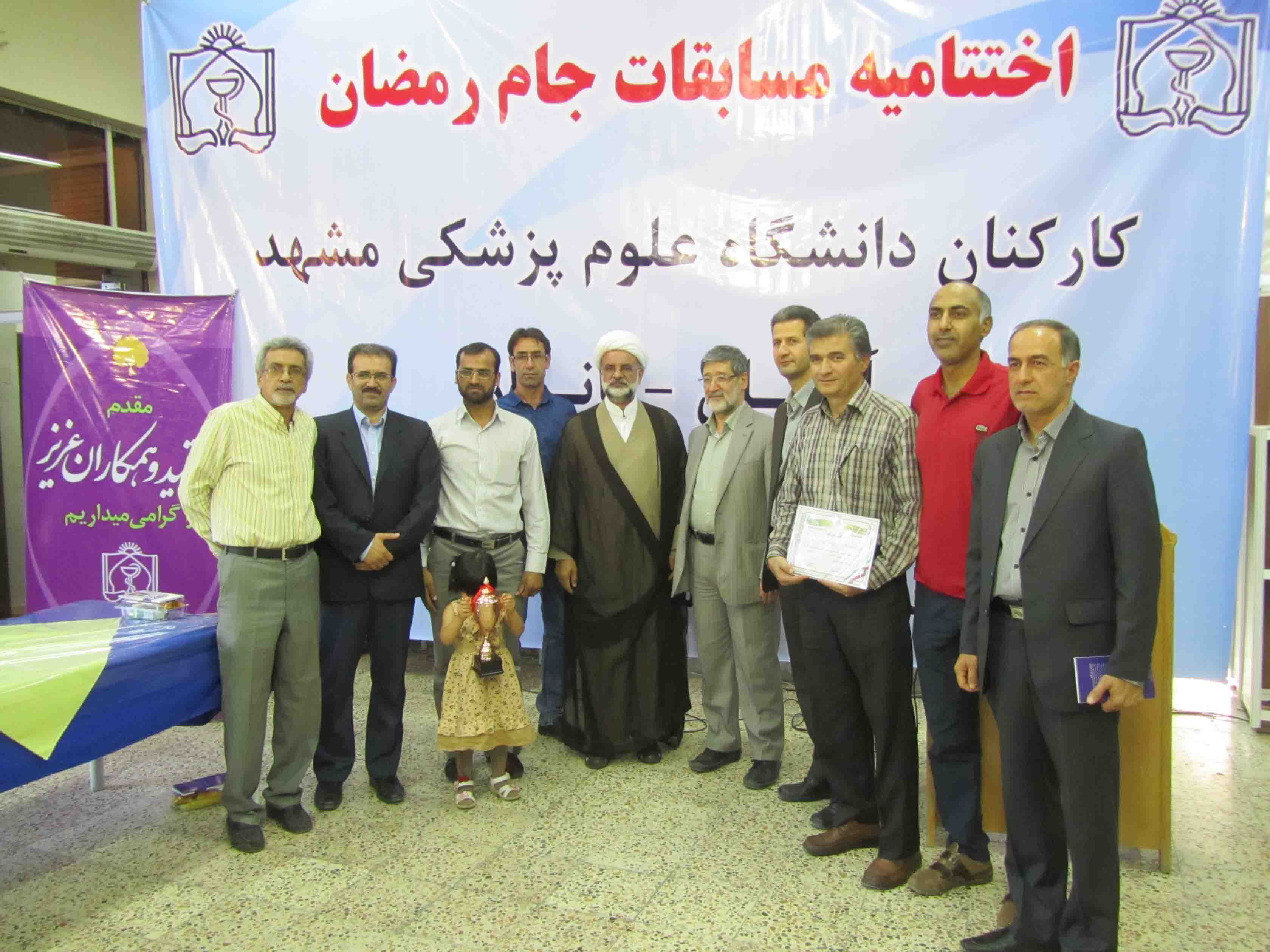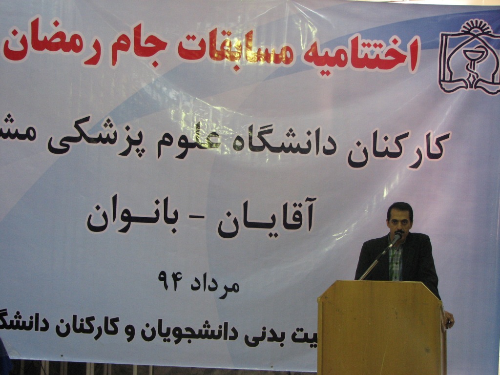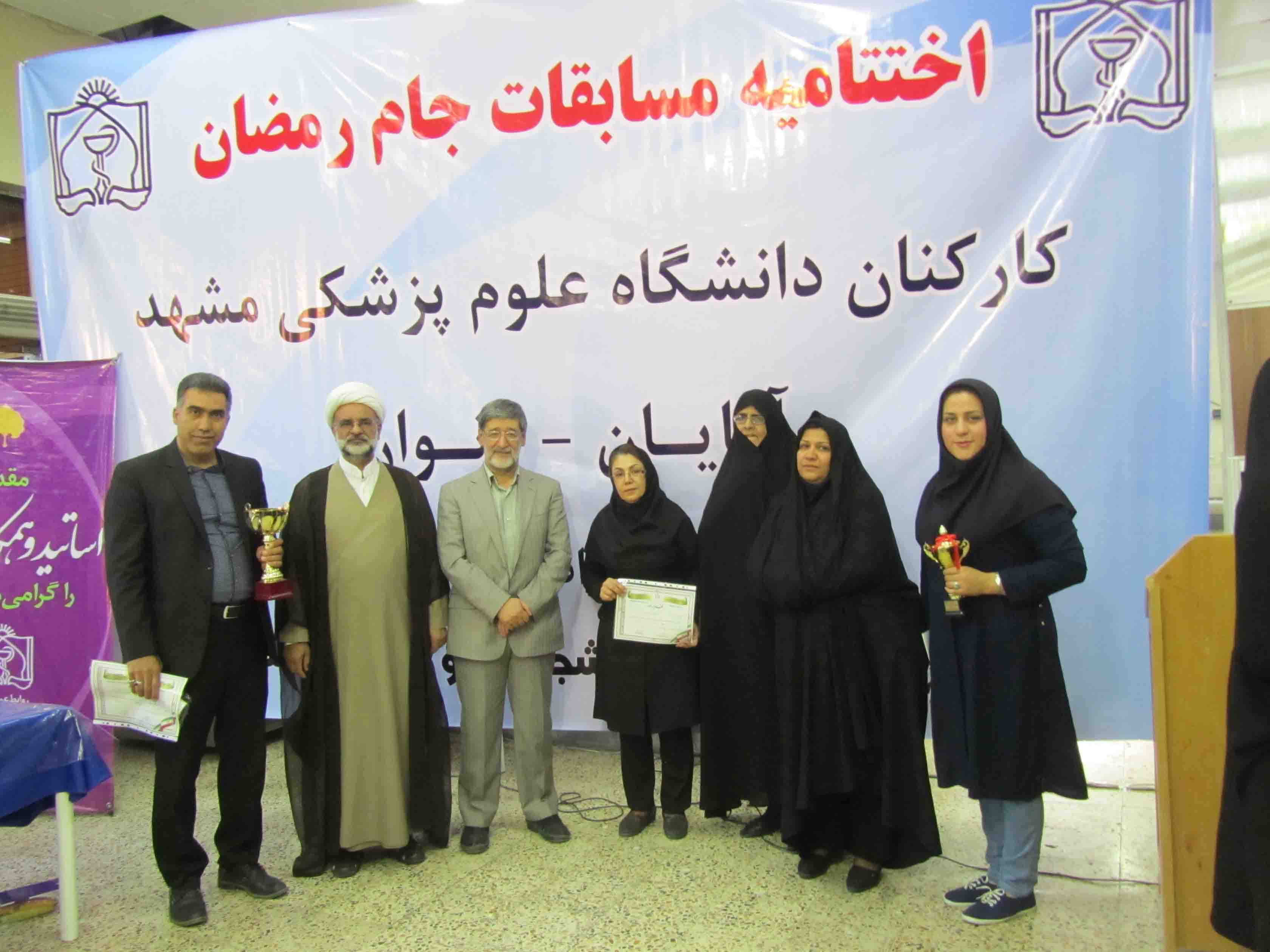 آئین اختتام جام رمضان 94 دانشگاه علوم پزشکی مشهد با حضور معاون توسعه مدیریت و منابع، معاون دانشجویی فرهنگی و جمعی از مدیران و مسئولین دانشگاه علوم پزشکی مشهد و همچنین نفرات وتیم های برتر این دوره از مسابقات برگزار شد .