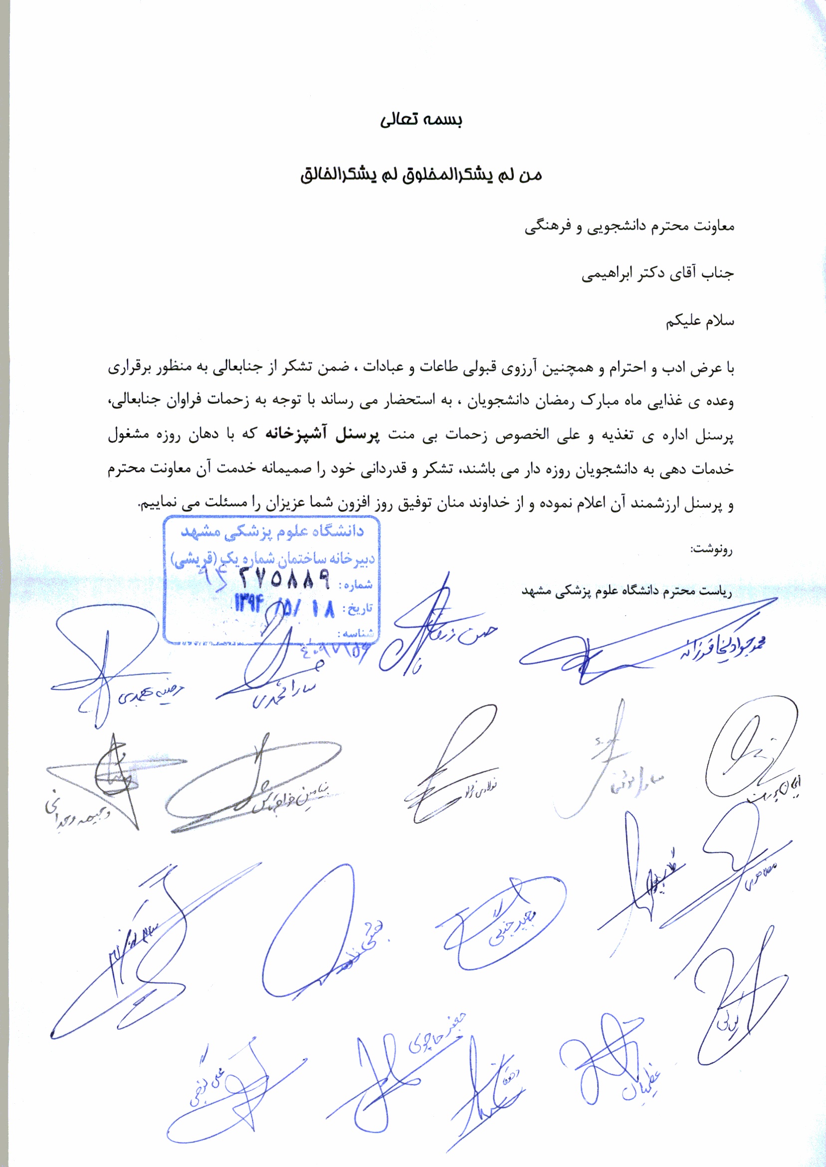جمعی از دانشجویان دانشگاه علوم پزشکی مشهد طی نامه ای به معاون محترم دانشجویی فرهنگی دانشگاه از تلاش و نحوه ارائه خدمات اداره تغذیه مدیریت دانشجویی، به ویژه کارکنانی که در طبخ و توزیع غذا مشارکت دارند ابراز تشکر و قدردانی نمودند .