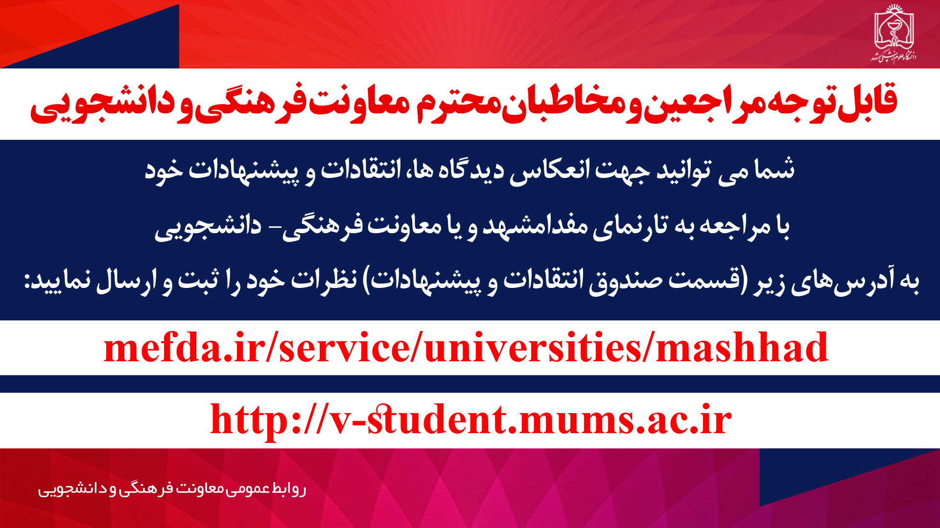 به گزارش مفدا مشهد، مراجعان و مخاطبان معاونت دانشجویی فرهنگی می توانند با مراجعه به تارنمای مفدا مشهد و معاونت دانشجویی فرهنگی به آدرس ذیل