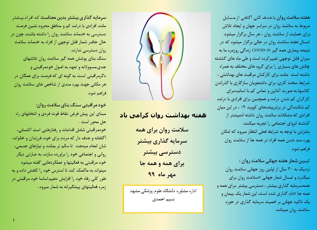 نسیم احمدی کارشناس اداره مشاوره و سلامت با تهیهی بروشوری در مورد سلامت روان، توضیحی را در مورد شعار هفته سلامت روان ارائه می دهد تا پس از گذشت از این هفته، این شعار بتواند به تحقق بپیوندد.جهت مشاهده ی بروشور در کیفیت اصلی اینجا را کلیک کنید.