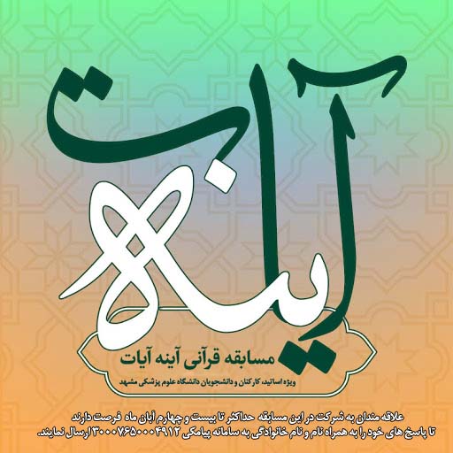 به گزارش مفدا مشهد، اداره توسعه فعالیت های قرآن و عترت(ع)، مدیریت امور فرهنگی و فوق برنامه دانشگاه علوم پزشکی مشهد، مسابقه مجازی آینه آیات را به مناسبت گرامیداشت هفته قرآن و دانشگاه برگزار می کند.