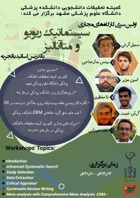 به گزارش مفدا مشهد، واحد آموزش کمیته تحقیقات دانشجویی دانشکده پزشکی دانشگاه علوم پزشکی مشهد در نظر دارد اولین سری" کارگاه های مجازی سیستماتیک ریویو و متا آنالیز" را برگزار نماید:
