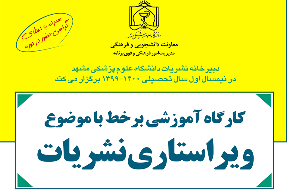 به گزارش مفدامشهد، دبیرخانه نشریات دانشگاه علوم پزشکی مشهد از برگزاری کارگاه آموزشی ویژه فعالان نشریات دانشجویی این دانشگاه در روز سهشنبه ۱۸ آذرماه ۱۳۹۹خبر داد. موضوع این کارگاه آموزشی که به صورت برخط برگزار خواهد شد، ویراستاری در نشریات است و تدریس آن را علیرضا حیدری، روزنامه نگار و کارشناس ارشد زبان و ادبیات فارسی برعهده دارد.