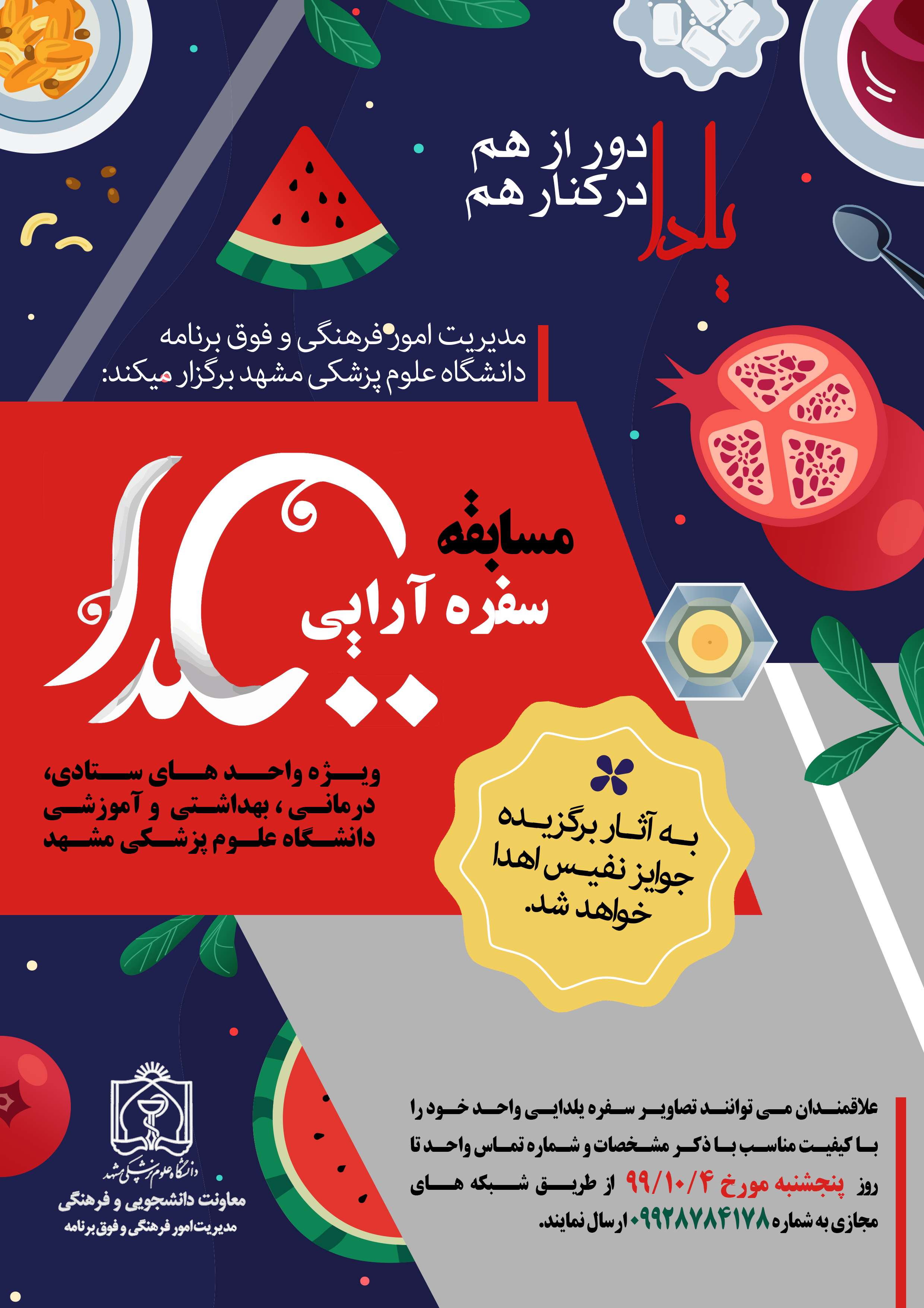 به گزارش مفدا مشهد، مدیریت امور فرهنگی و فوق برنامه دانشگاه علوم پزشکی مشهد مسابقه عکاسی" یلدا دور از هم در کنار هم " ویژه کارکنان واحدهای ستادی،درمانی، بهداشتی و آموزشی را برگزار می کند.