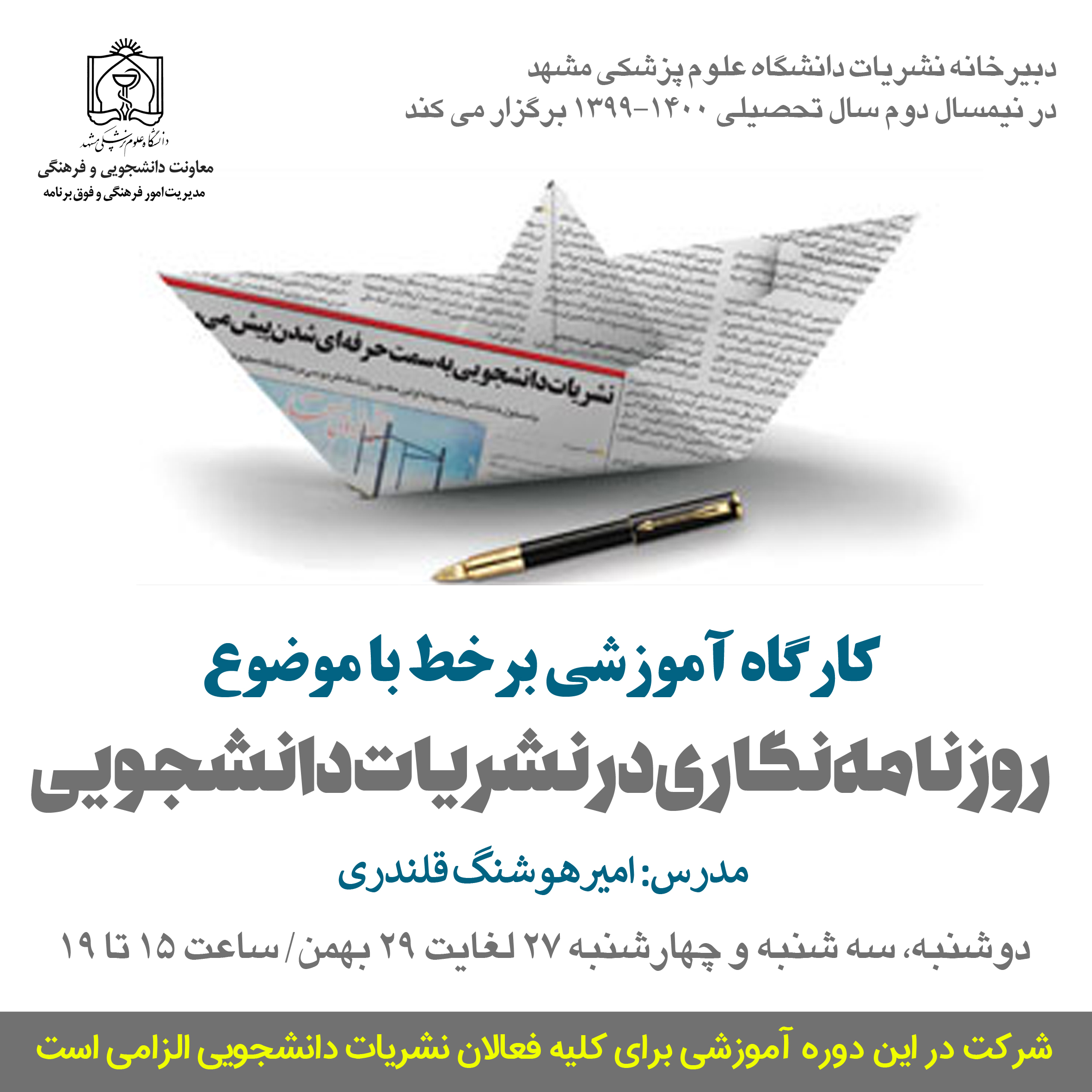 کارگاه آموزشی روزنامه نگاری در نشریات دانشجویی توسط دبیرخانه نشریات دانشگاه علوم پزشکی مشهد برگزار می شود.